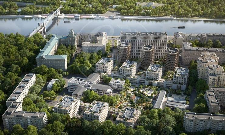 Среднеэтажная часть состоит из трёх лаконичных 10-этажных домов в современном стиле, в каждом из которых от 23 до 30 квартир, и новой архитектурной доминанты набережной — величественного дома в неоклассическом стиле с видами на Кремль, Нескучный сад и Москву-реку. В домах огромные балконы и уникальное панорамное остекление, наполняющее квартиры светом и воздухом.