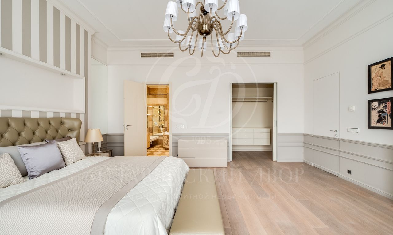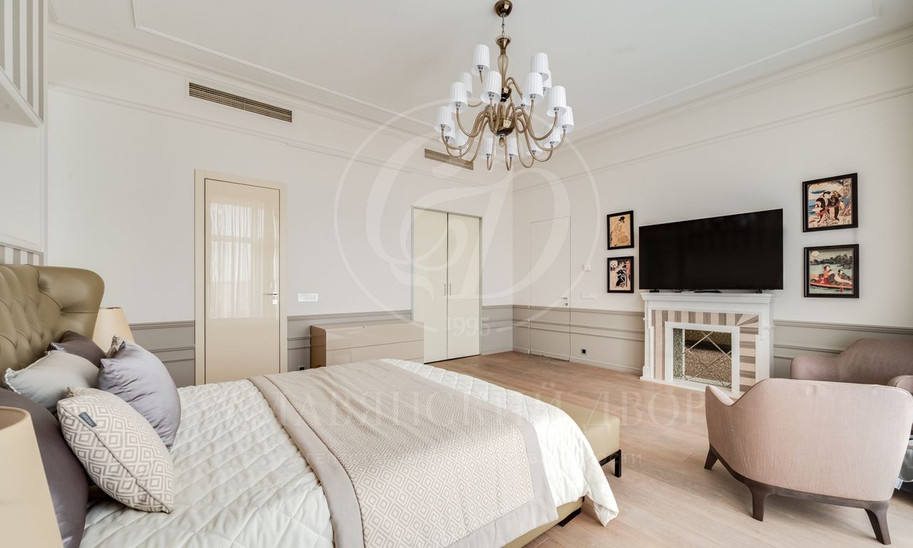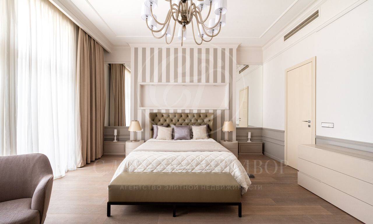 Планировка: 3 спальни, гостиная, кухня, 3 санузла, постирочная , 2 гардеробные комнаты.