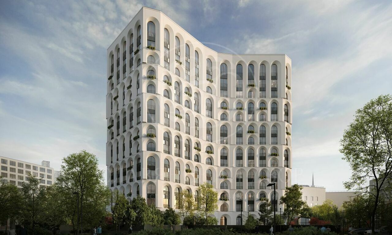 Здание клубного дома отличается изысканной архитектурой с фасадом из 343 воздушных белоснежных арок.