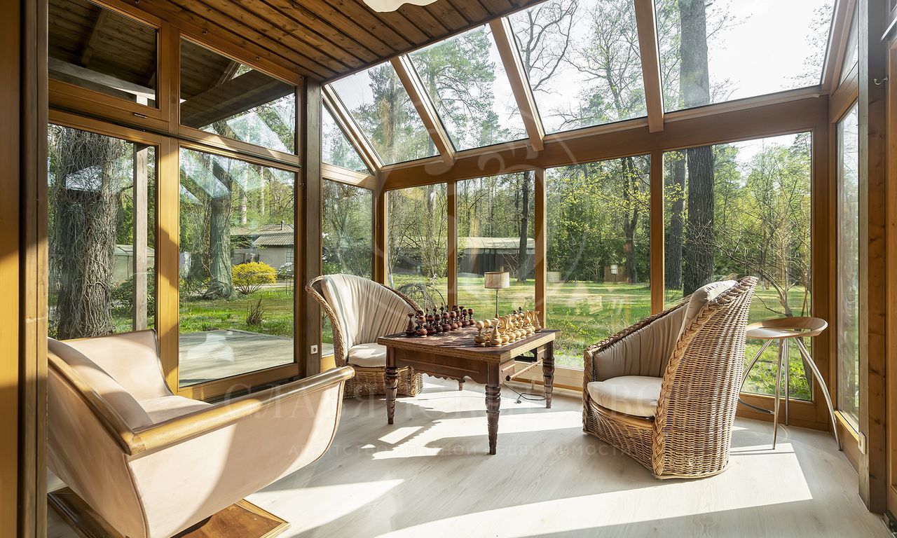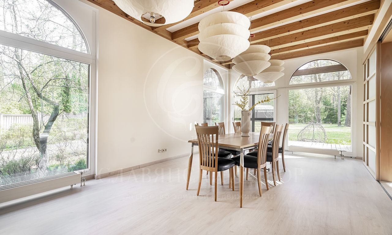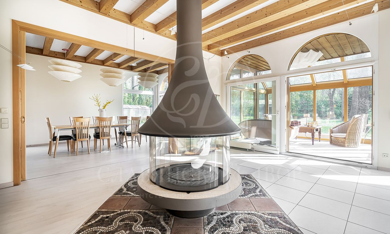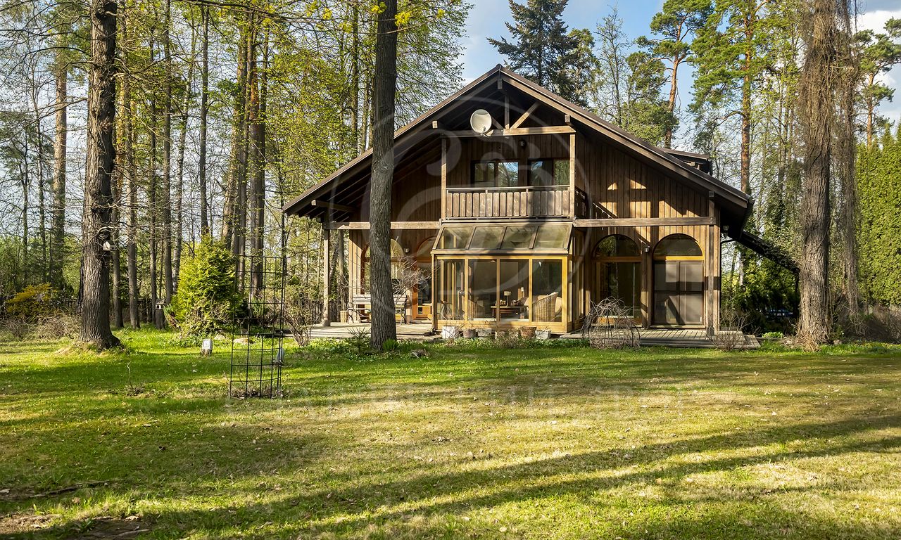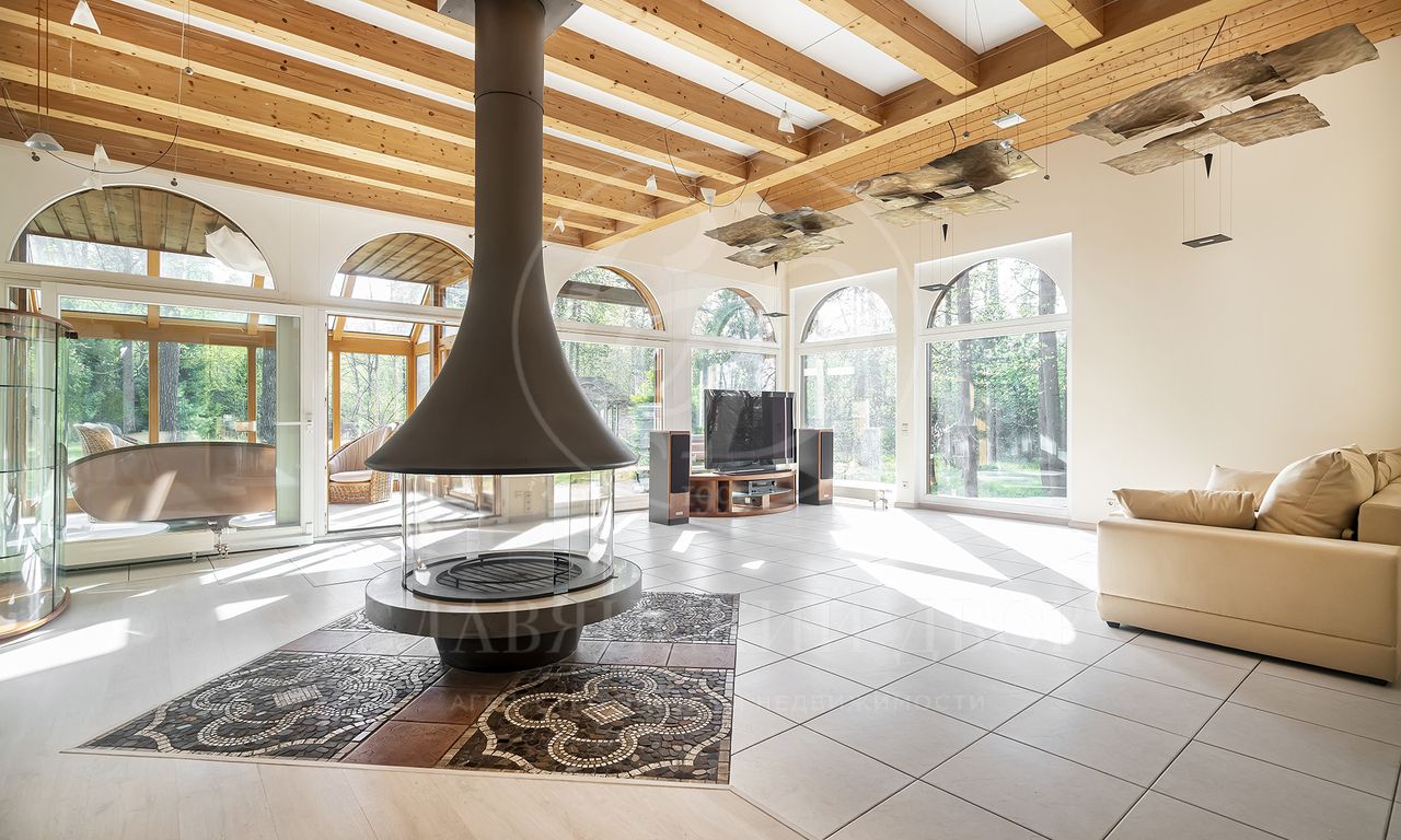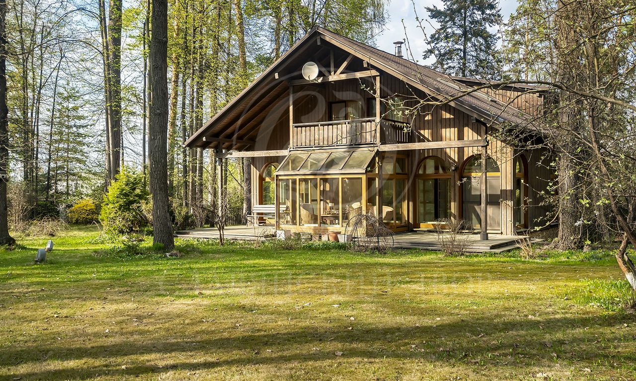 Дом уникален по своей архитектуре, с огромными панорамными окнами, через которые открывается потрясающий вид на лес.