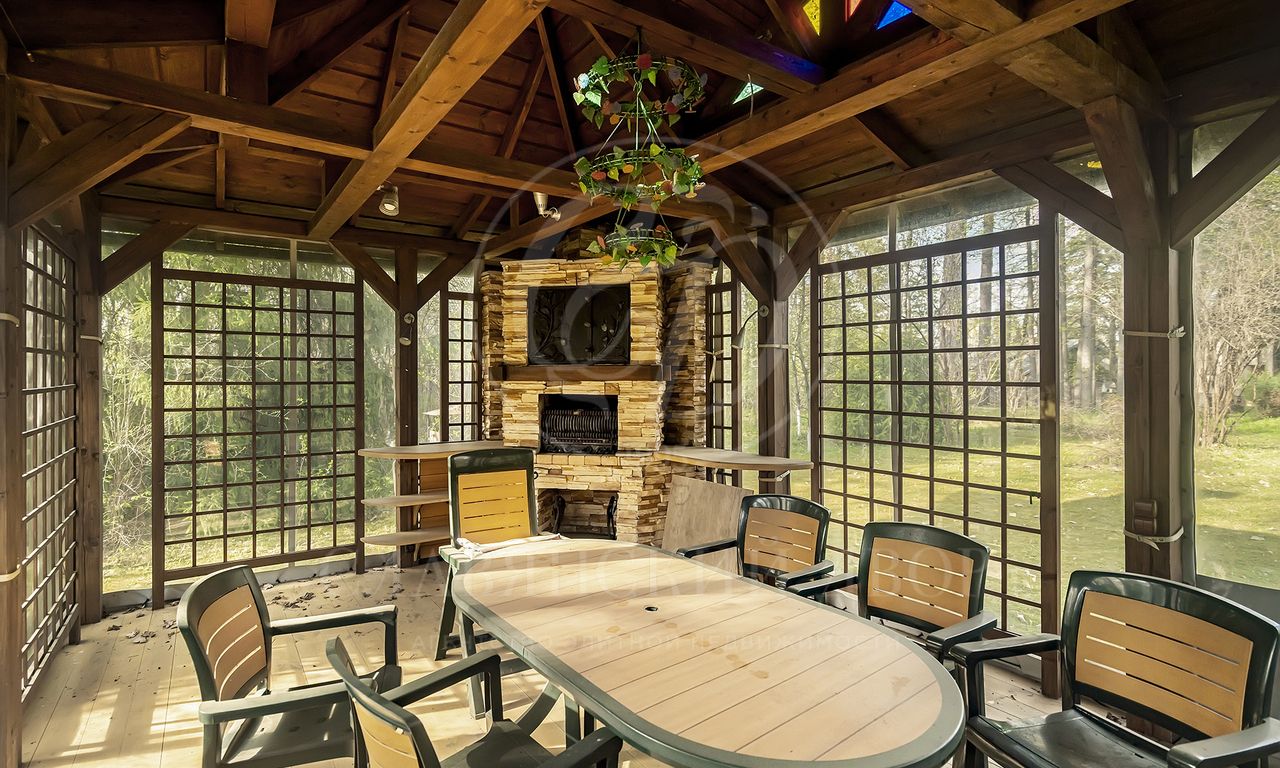 Дом для охраны/персонала (2 комнаты), гараж на 2 м/м, навес на 1 м/м, беседка барбекю.