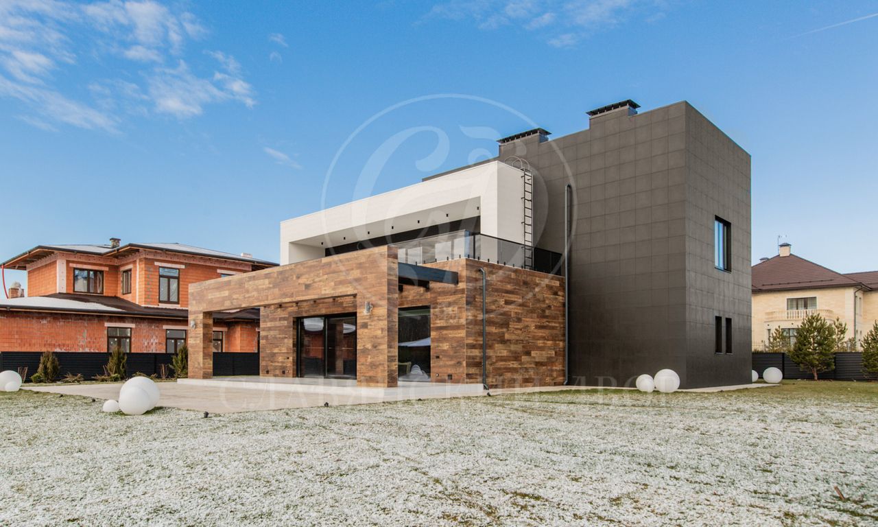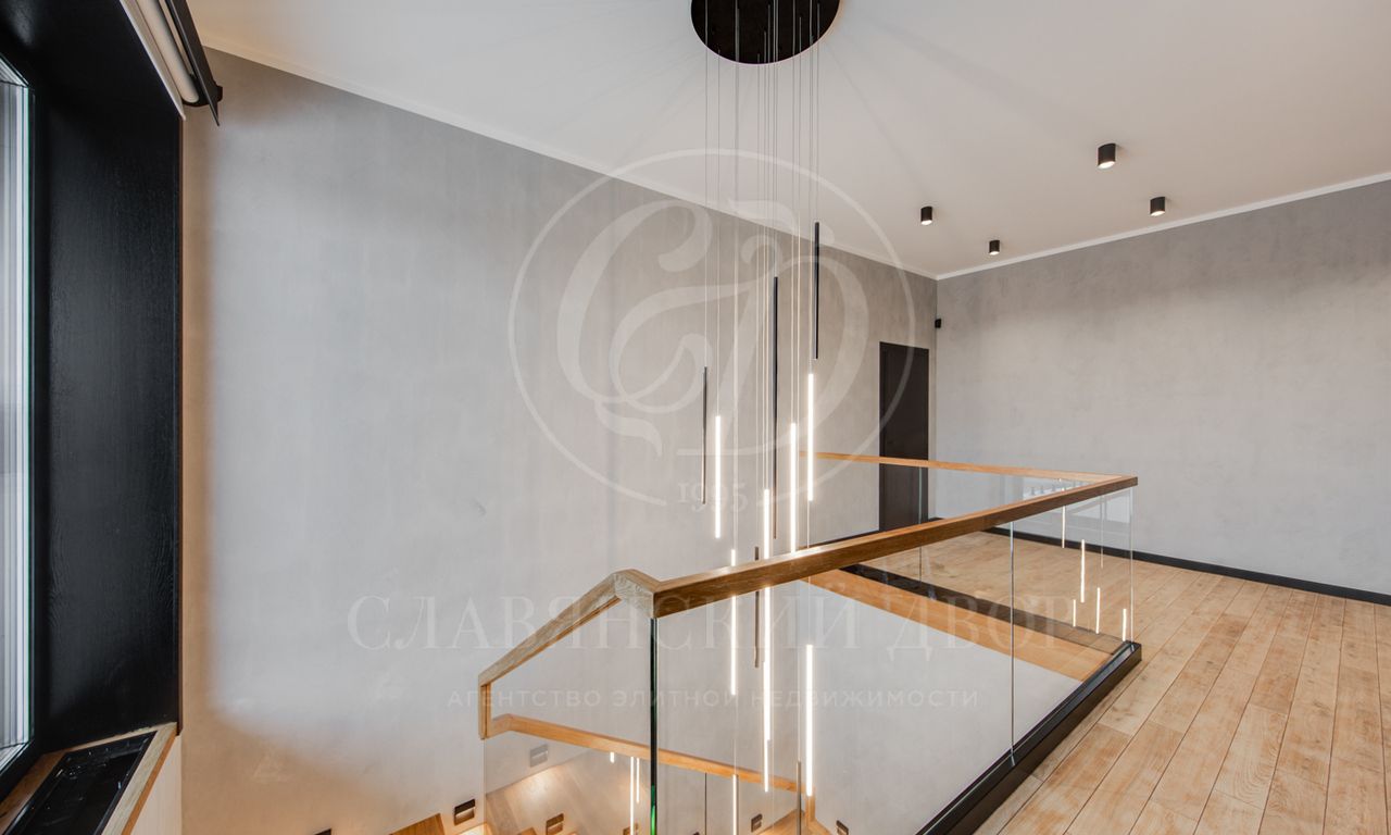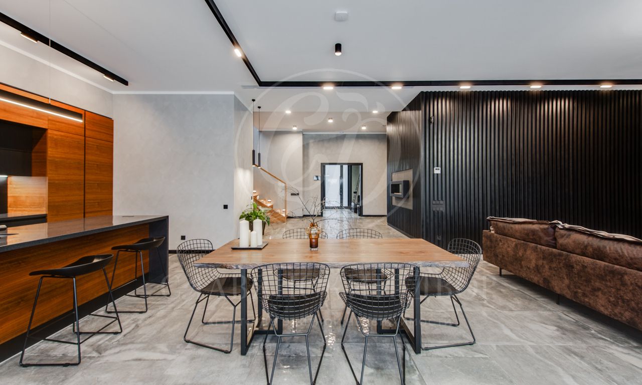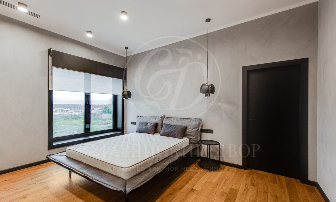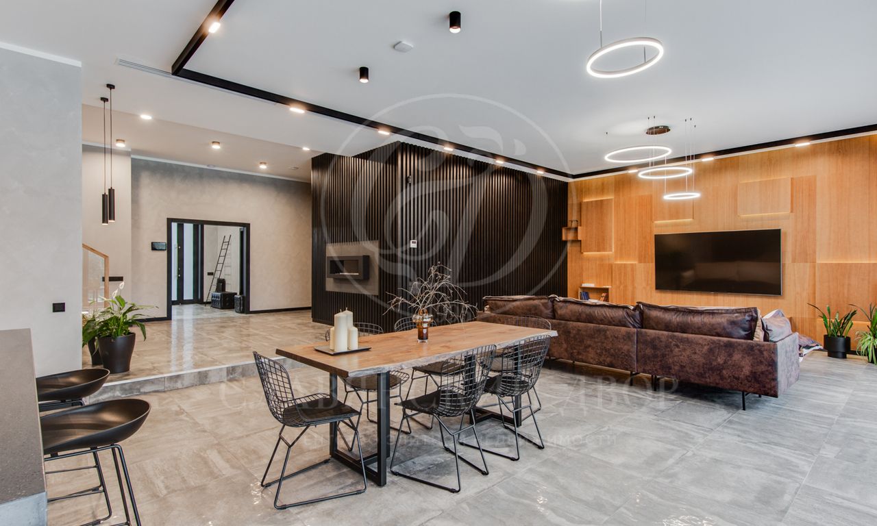 В доме выполнен дизайнерский ремонт в стиле ар-деко. В отделке использованы натуральные материалы. Эксплуатируемая кровля, просторная терраса с роскошным видом на участок, высокие потолки.