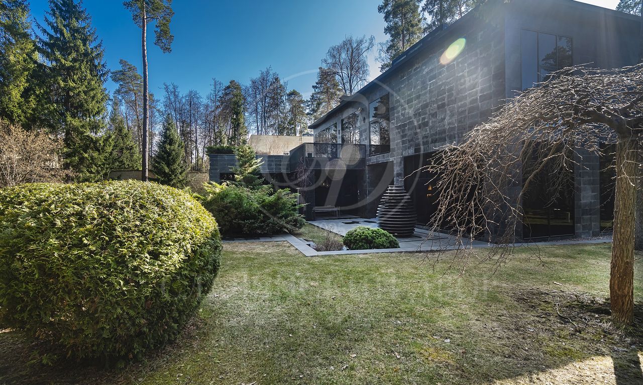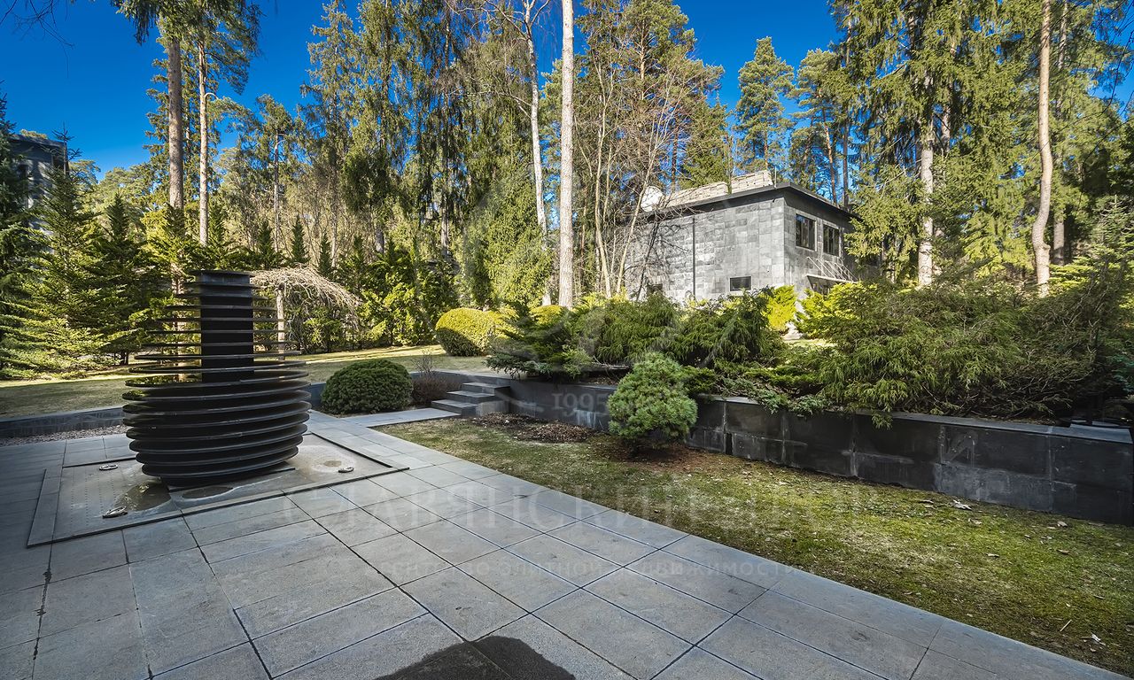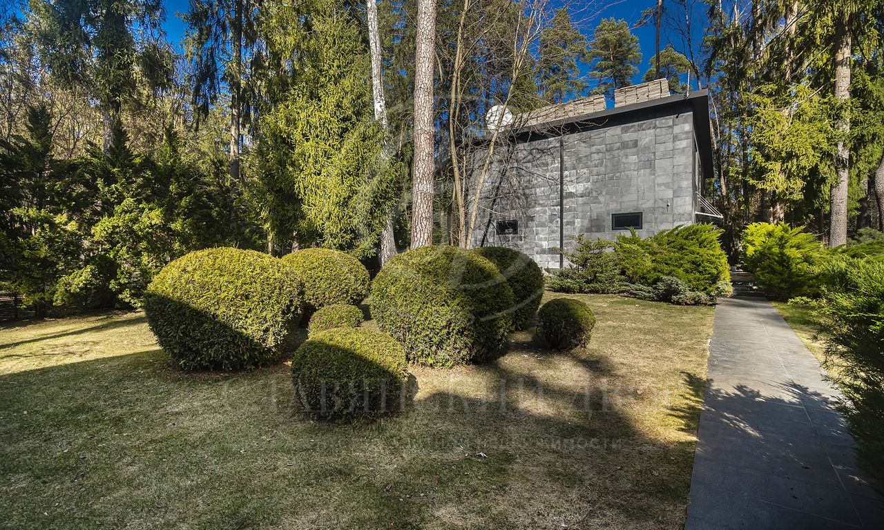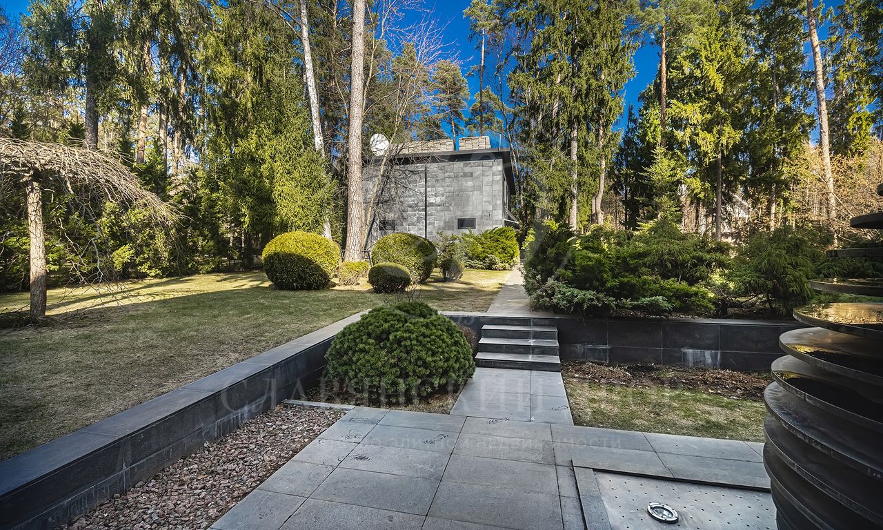 Участок прямоугольной формы с ландшафтным дизайном. На участке гостевой дом с гаражом общей площадью 227 кв. м. На первом этаже — кладовая, холл, котельная, гараж на 2 м/м, на втором этаже — холл, 2 спальни, ванная комната, гостиная-кухня.