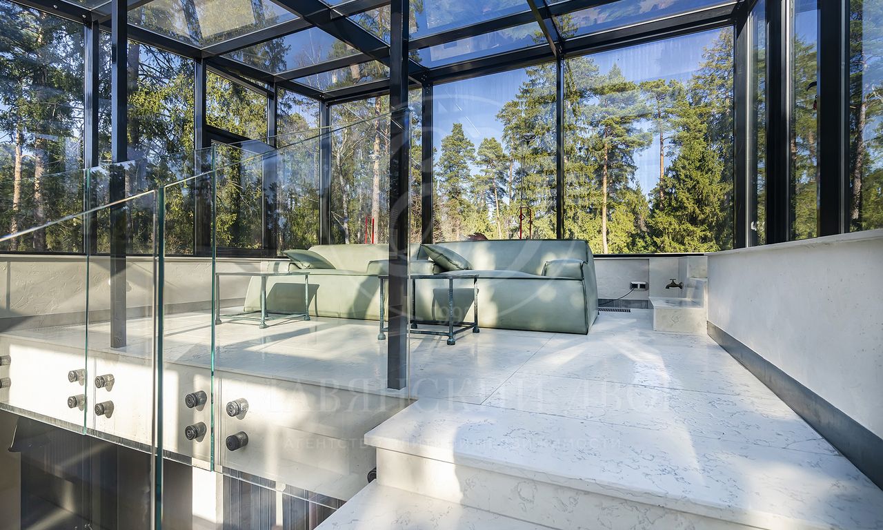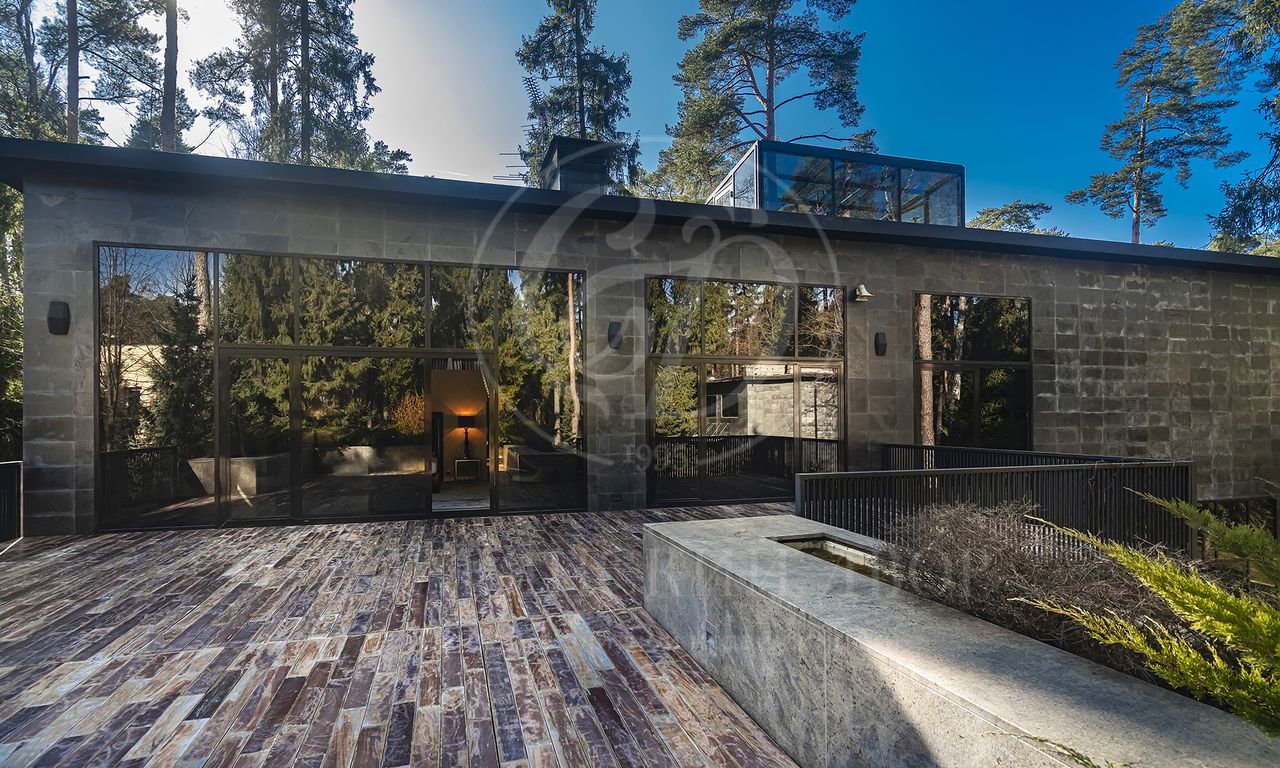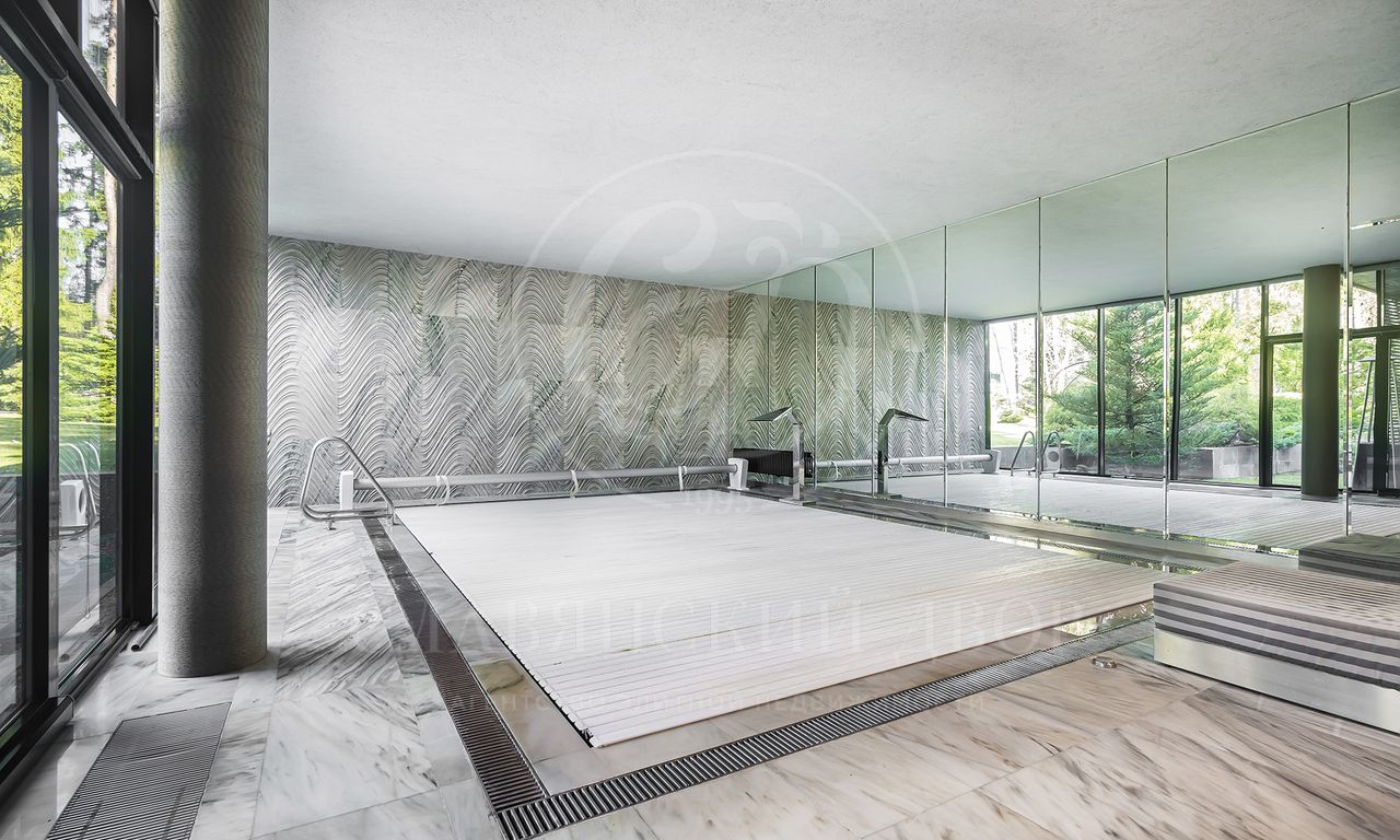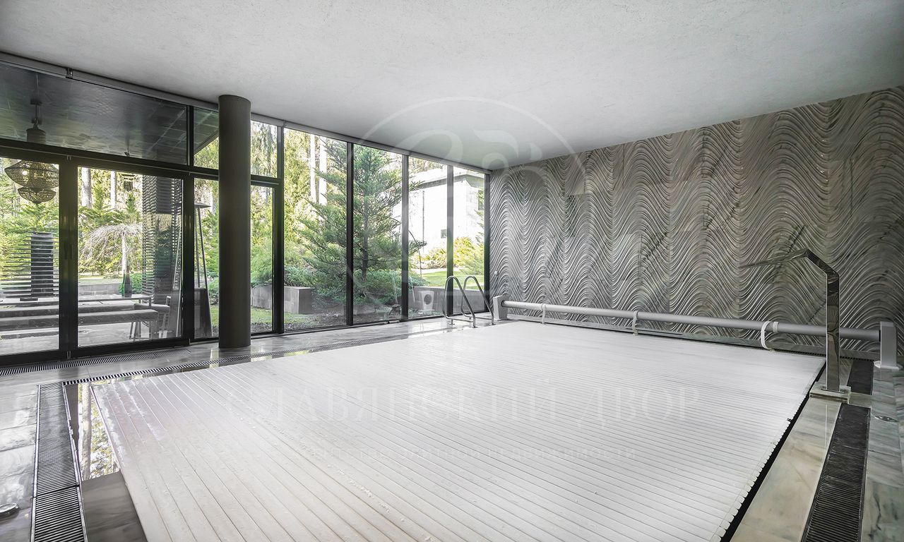 1 этаж: холл, гардеробная, с/у, кабинет, кухня, столовая, гостиная с камином и выходом на патио, спальня, бассейн, с/у, сауна;