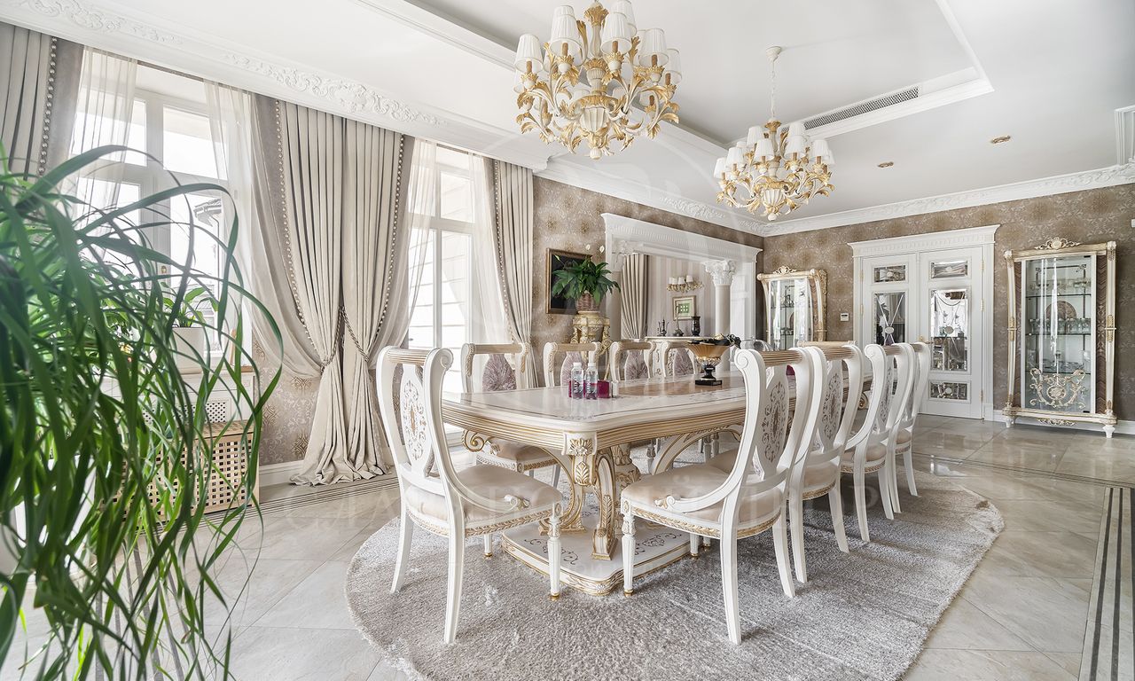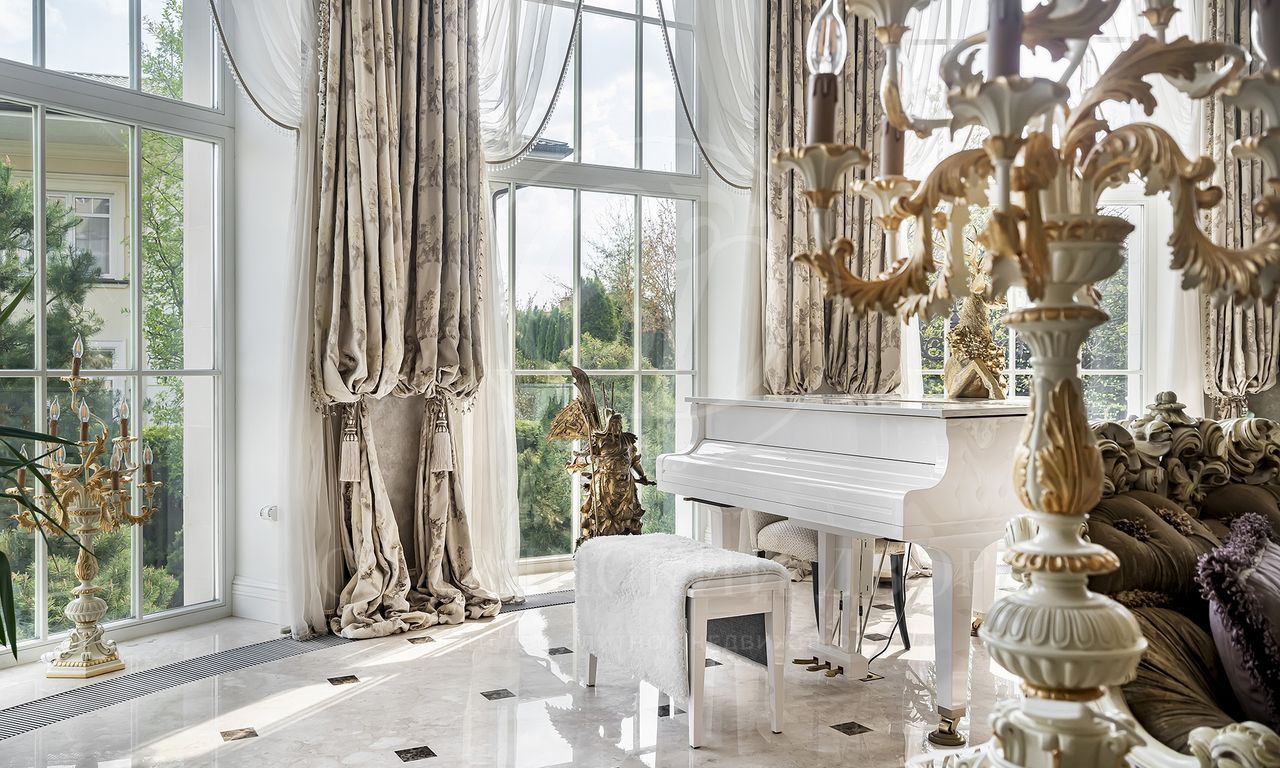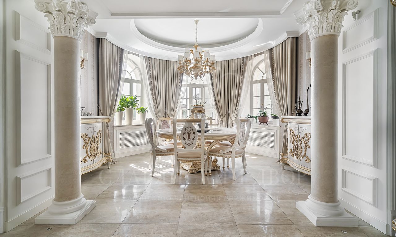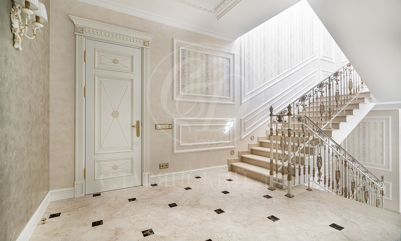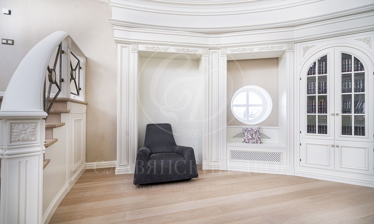 1 ЭТАЖ: входная группа, гардеробная для верхней одежды, малая гостиная, лифт, большая гостиная со вторым светом и с выходом на террасу, столовая с выходом на террасу ( терраса с маркизами на электроприводе), рояль, холл, с/у, кабинет женский с эркером, кабинет мужской с выходом на террасу , библиотека, гардеробная, чайная комната с круглым столом на 6-8 человек, вторая кухня с кладовой.