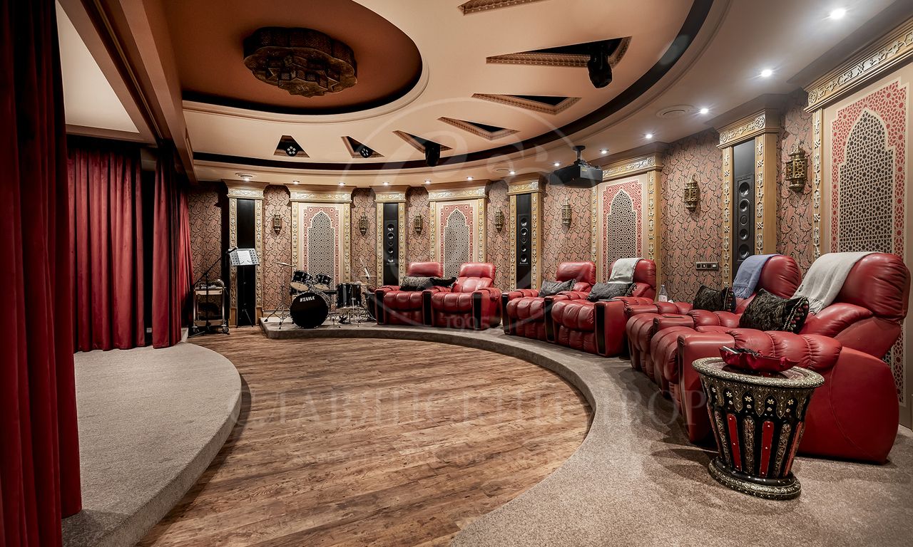 Развлекательная зона: многофункциональный кинотеатр, светомузыка, караоке, электрические ортопедические кресла, мини сцена, танцпол, управление с айпада (система «умный дом»).