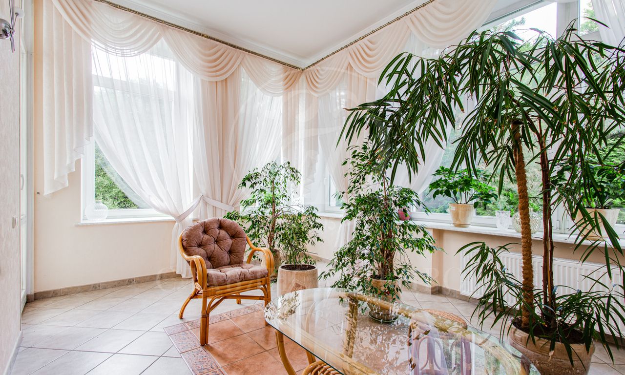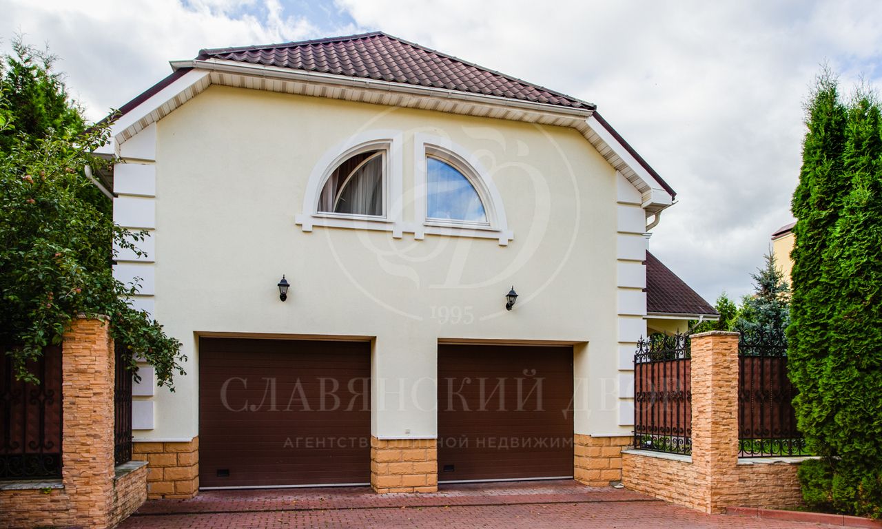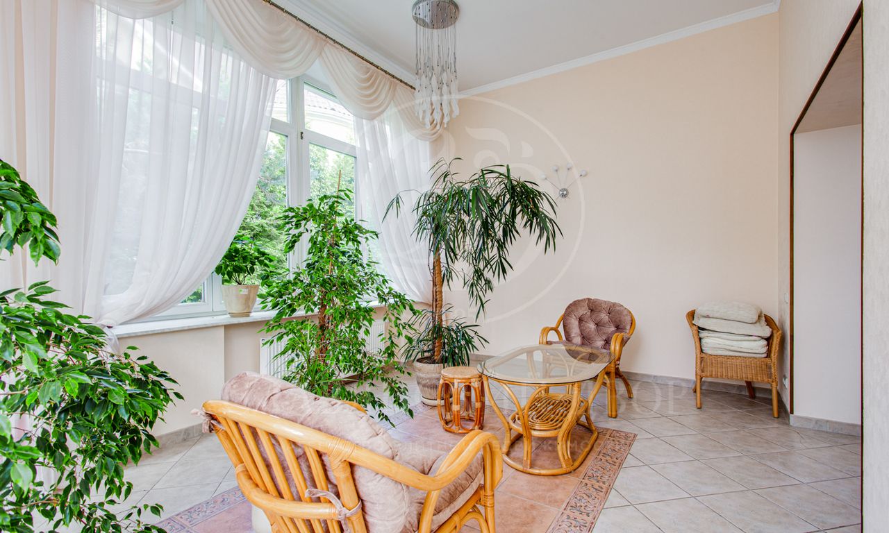 1 этаж: холл, гостиная с камином, кухня — столовая, кабинет, зимний сад, хоз.помещение, гараж на 2 м/м с квартирой для персонала на 2-м этаже (отдельный вход).