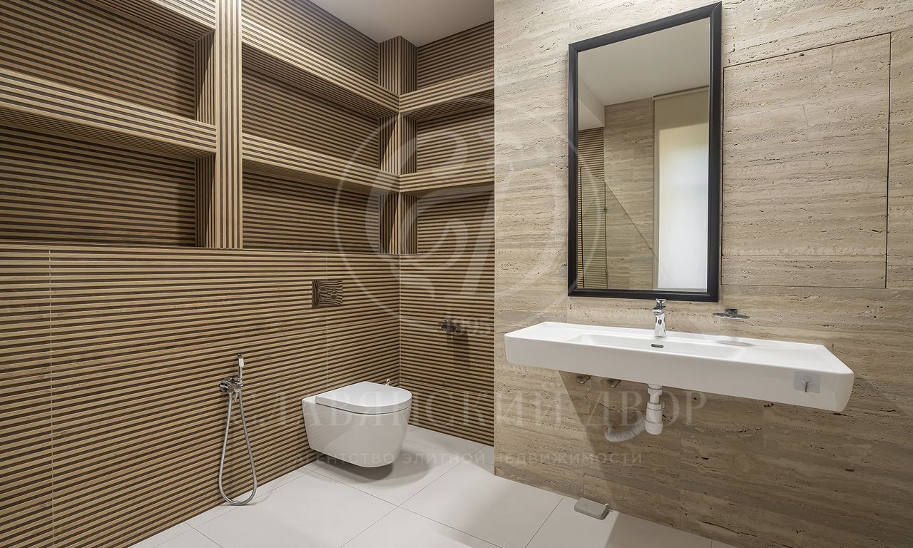 1 этаж: холл, с/у, гардеробная, гостиная с камином, кухня, столовая, кабинет, спальня с выходом на участок с собственной ванной комнатой, постирочная, подсобное помещение.