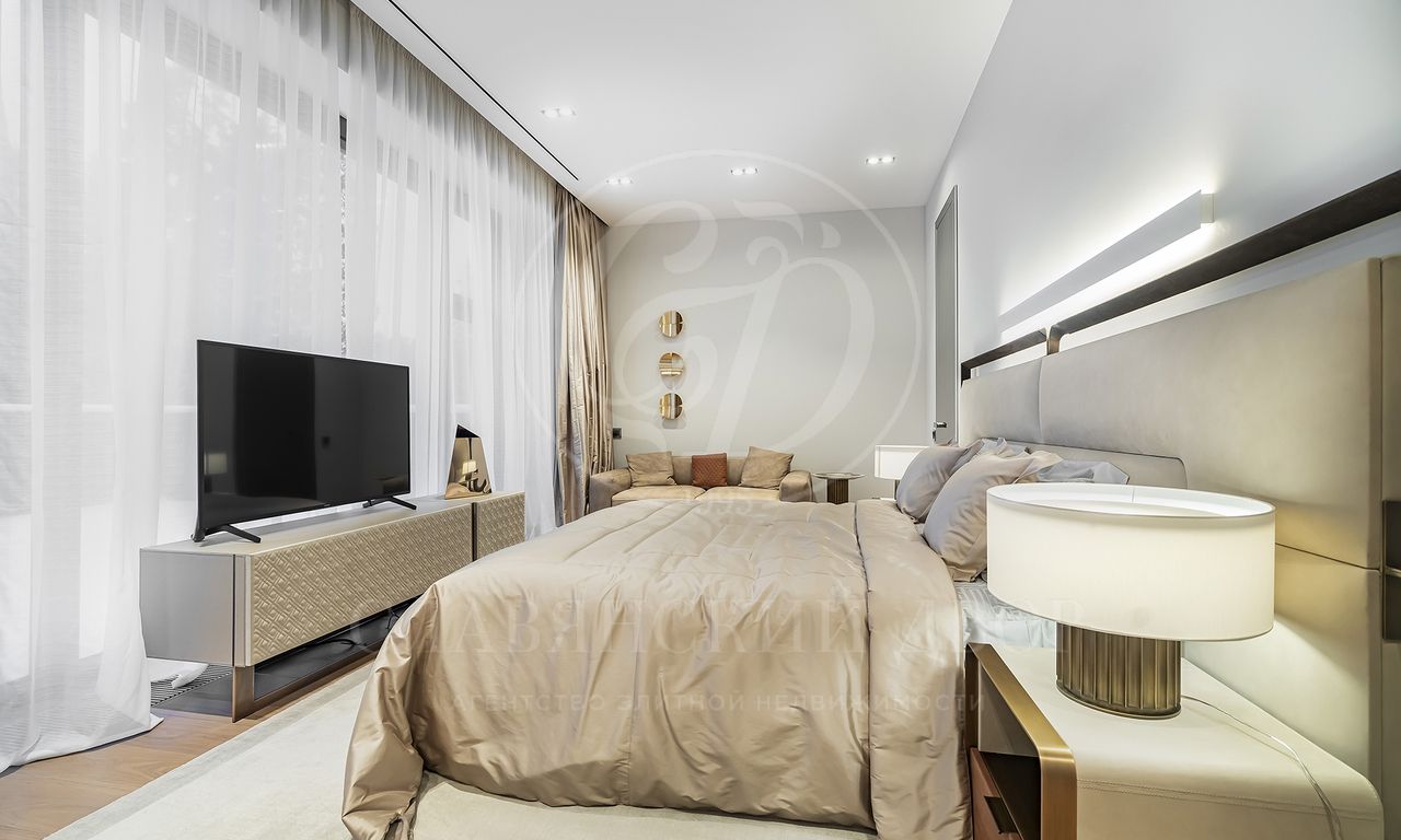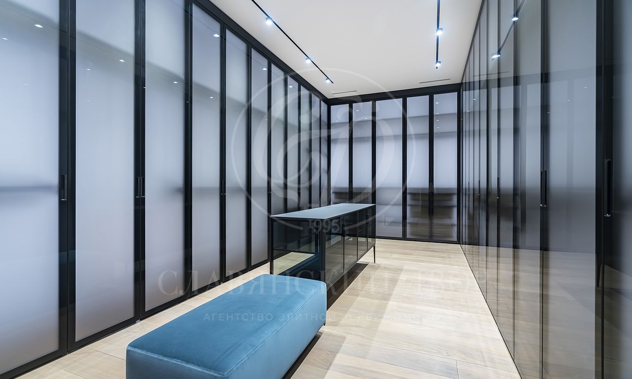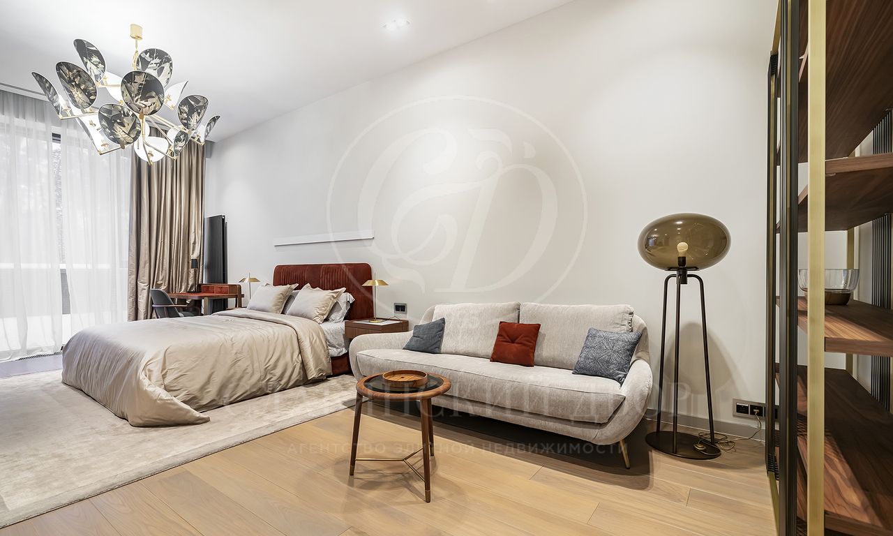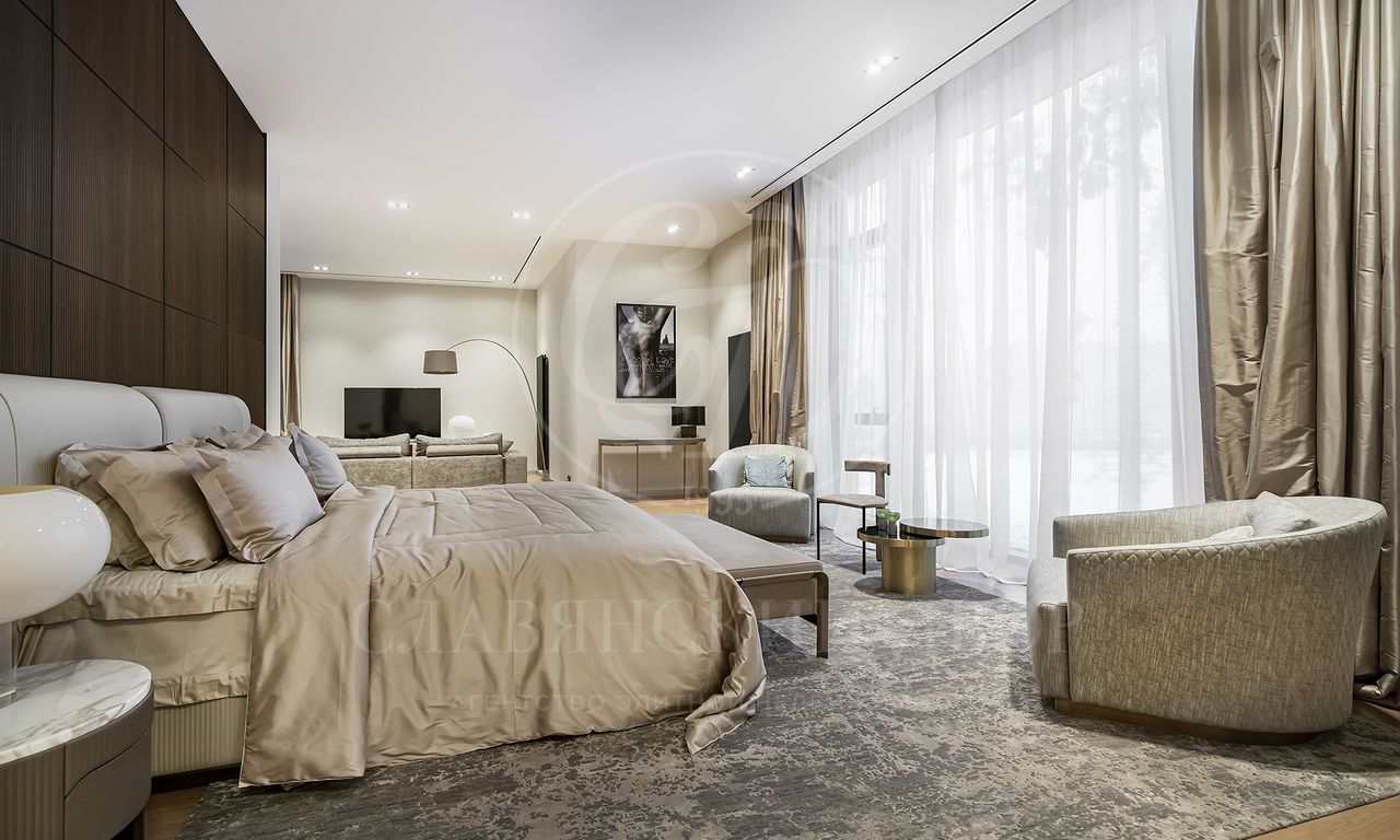 просторная мастер-спальня с зонами гостиной и библиотеки, ванная комната с панорамными окнами и вместительная гардеробная; 3 спальни с гардеробными и с/у; просторный холл с зонами гостиной и