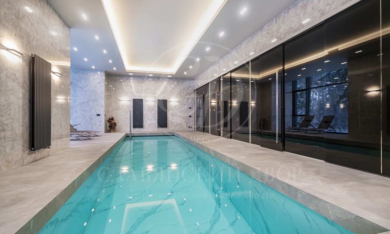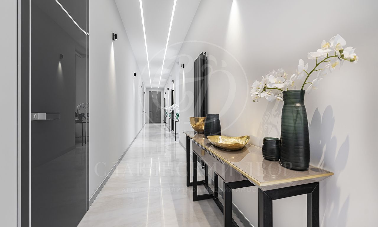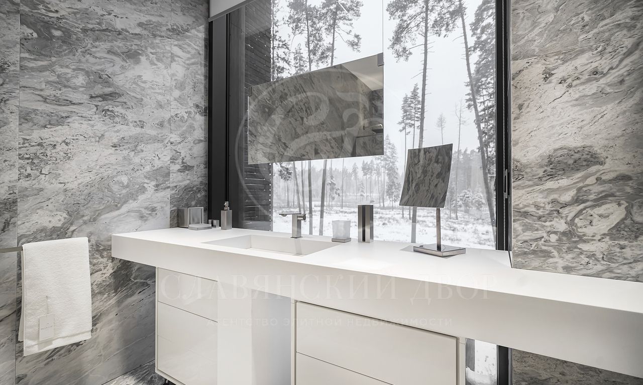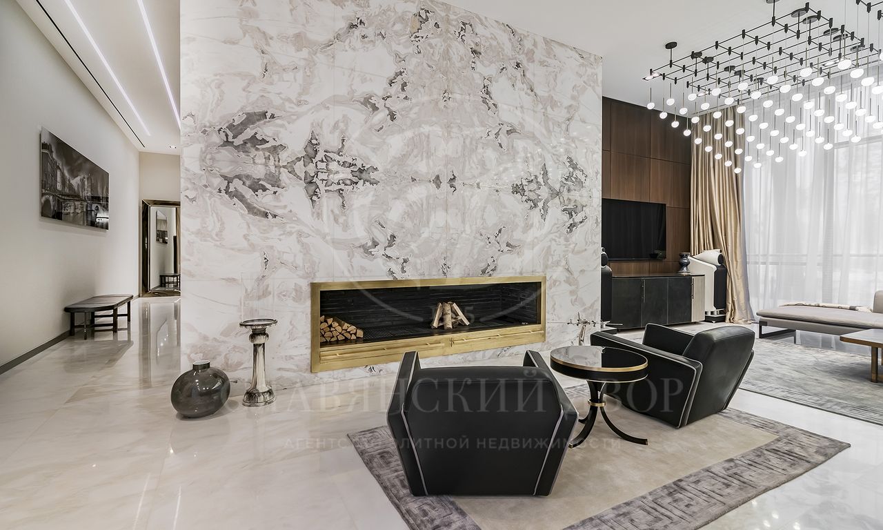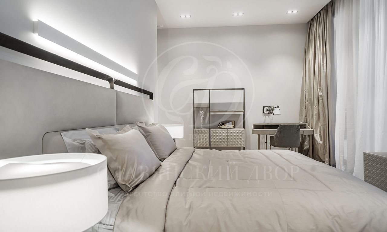 просторная мастер-спальня с зонами гостиной и библиотеки, ванная комната с панорамными окнами и вместительная гардеробная; 3 спальни с гардеробными и с/у; просторный холл с зонами гостиной и