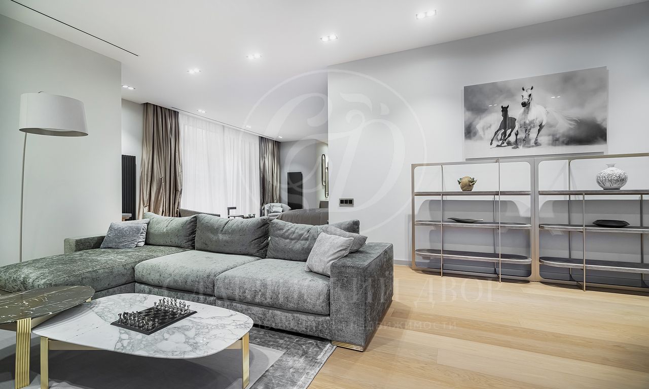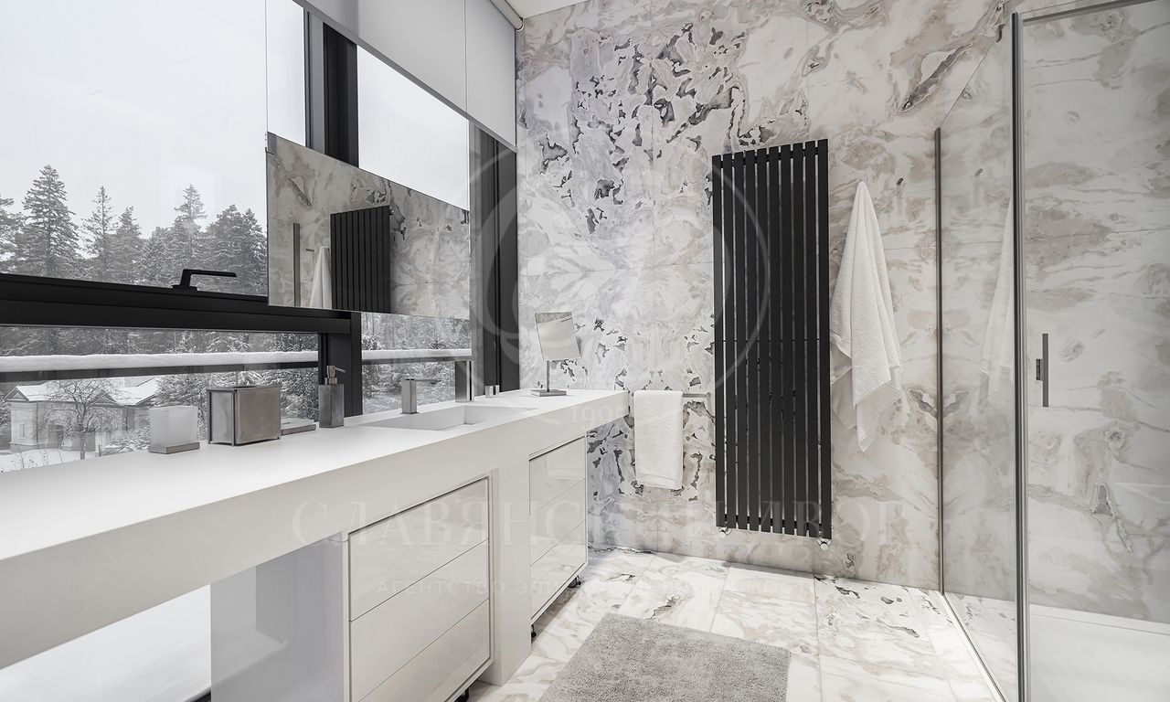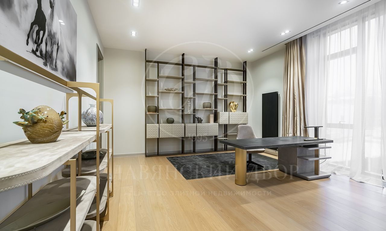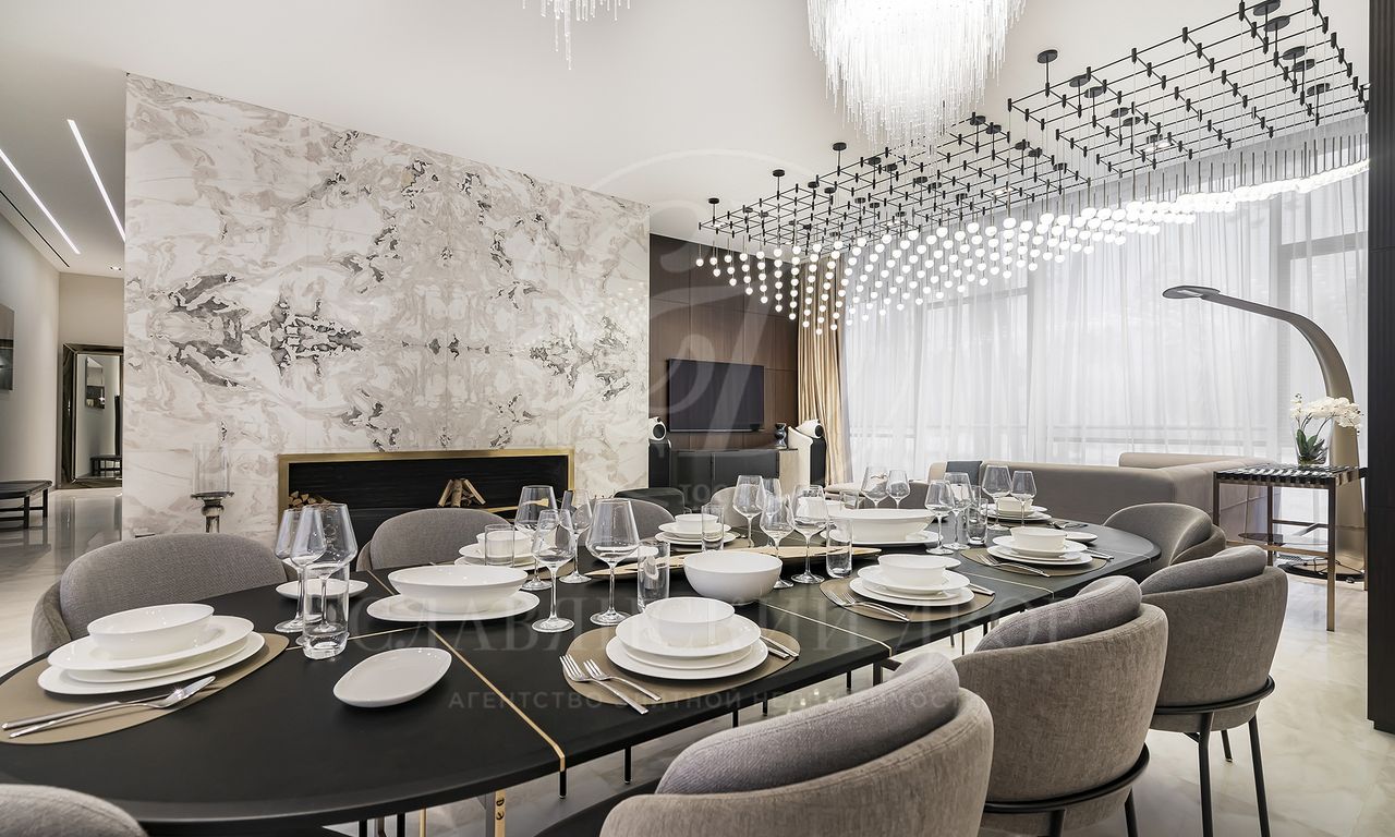 просторная мастер-спальня с зонами гостиной и библиотеки, ванная комната с панорамными окнами и вместительная гардеробная; 3 спальни с гардеробными и с/у; просторный холл с зонами гостиной и