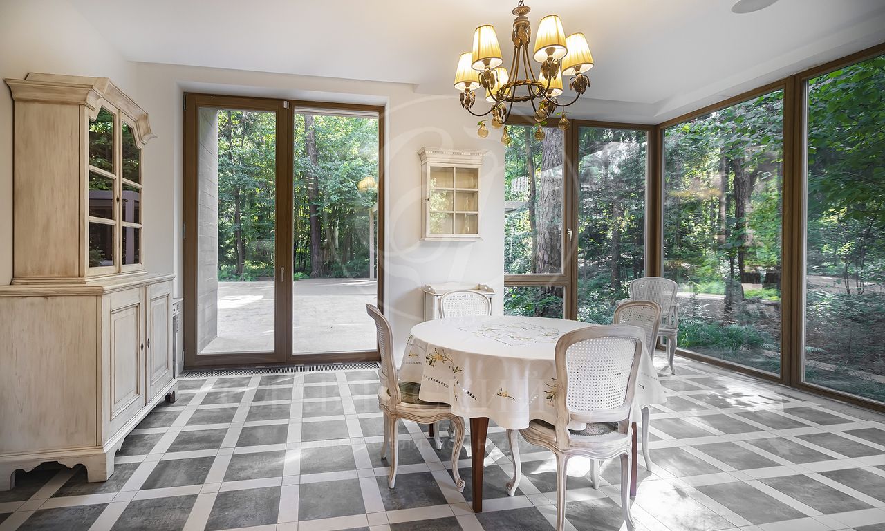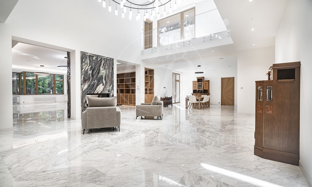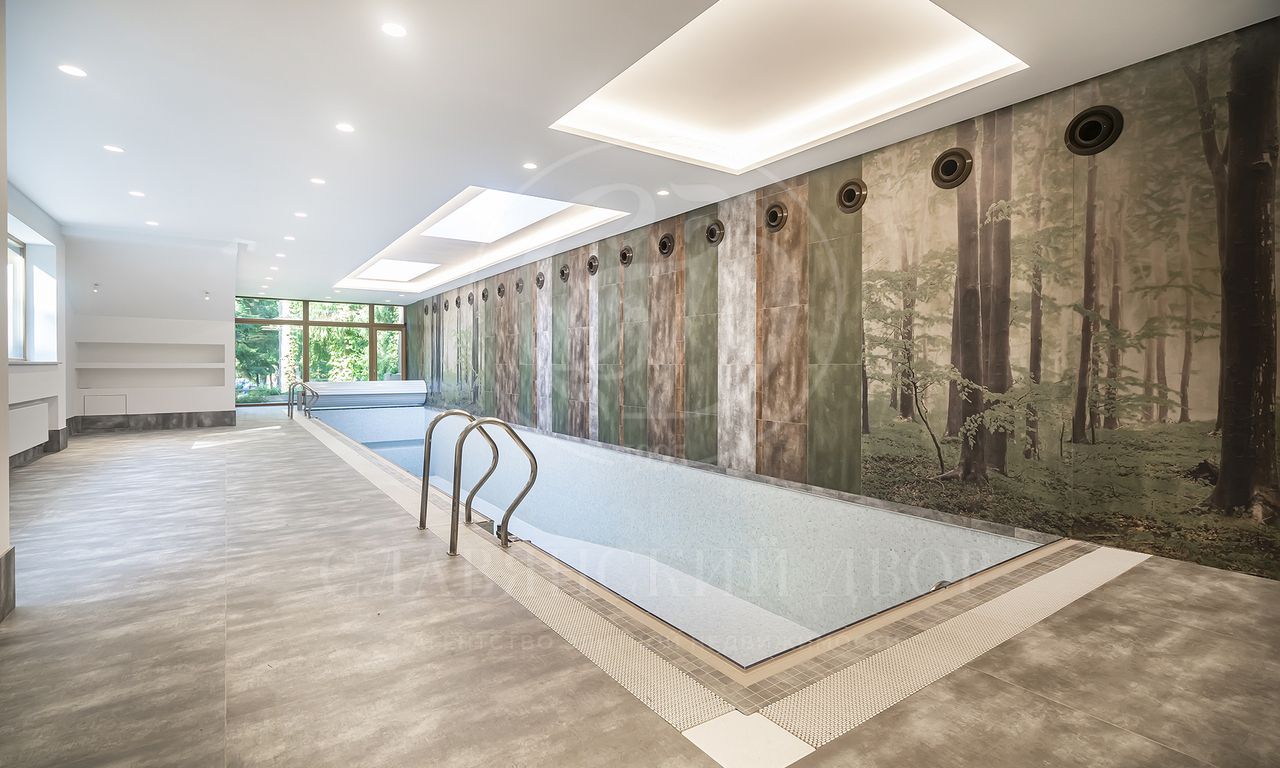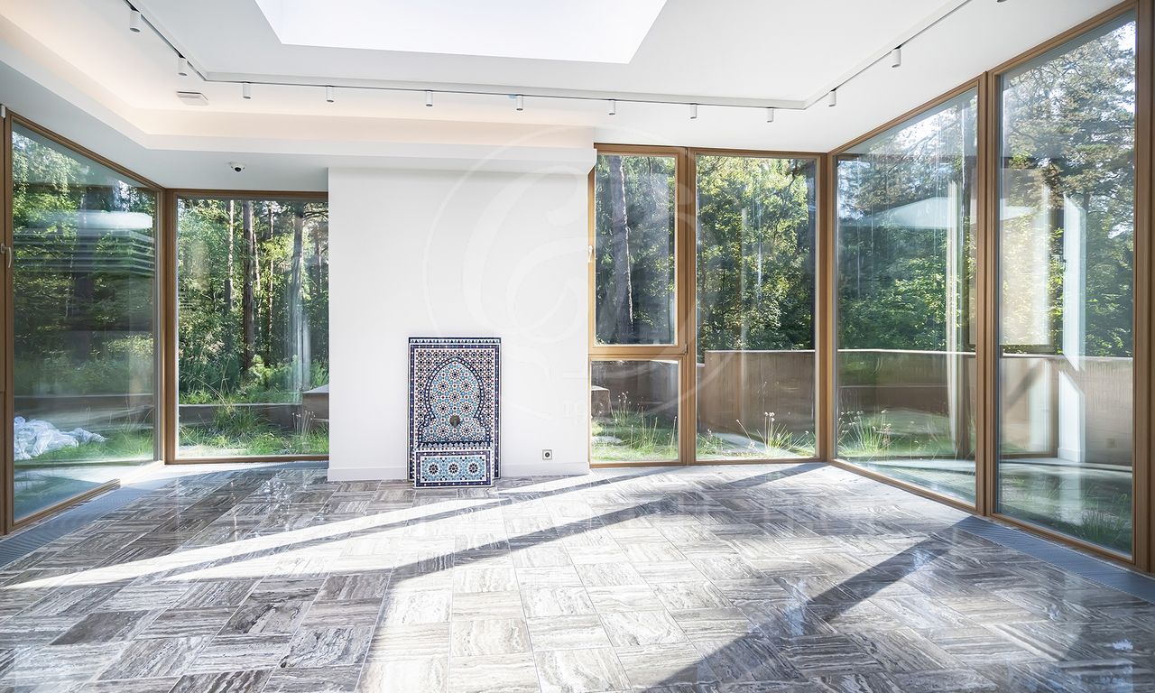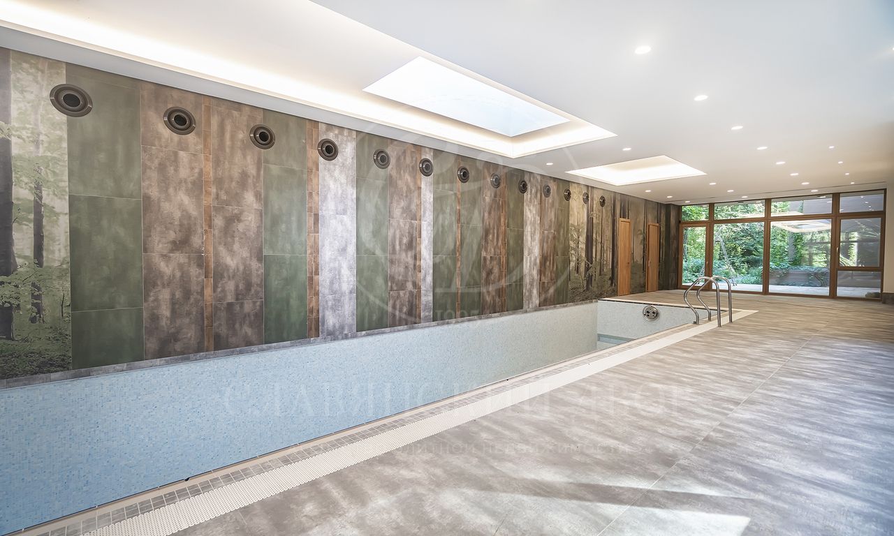 1 этаж: прихожая, холл, гардеробная, с/у, гостиная с камином, зимний сад, столовая, кухня, терраса, бассейн, сауна, хамам, душ, спальня, ванная комната.