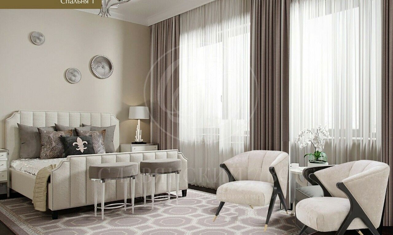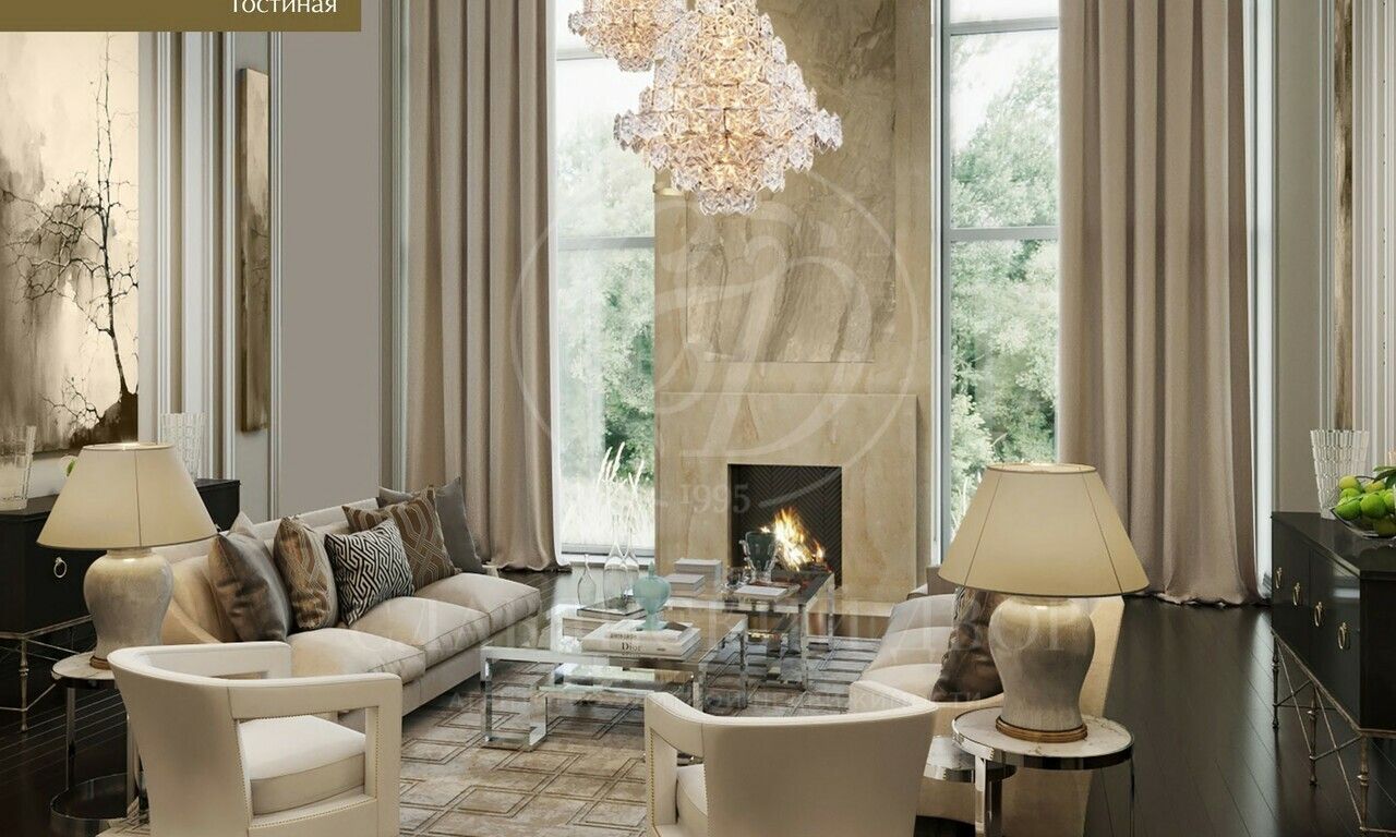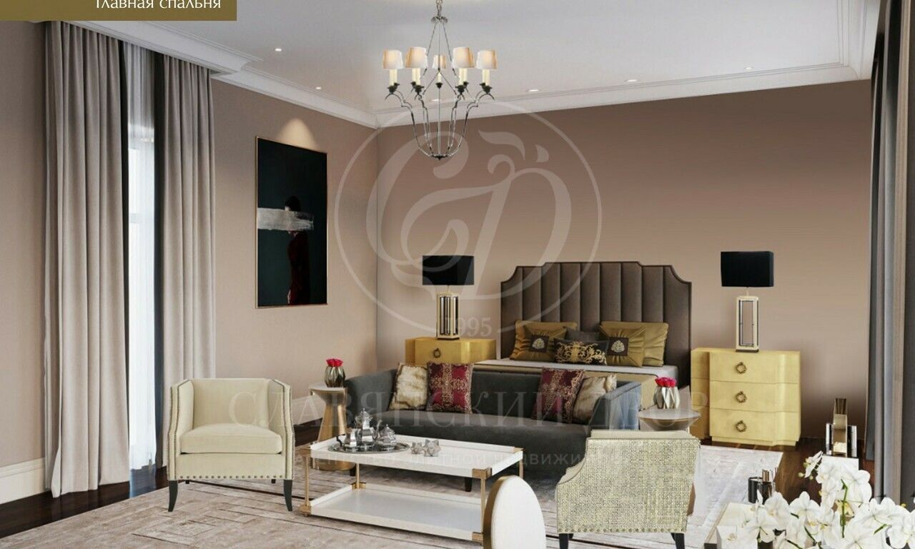 В доме планируются:4 спальни, 4 ванные комнаты, гостевой с/у, 5 гардеробных комнат, 2 гостиные, кабинет, кинозал, спортзал и зона СПА, большая столовая, кухня, встроенный гараж, двухуровневая открытая терраса.