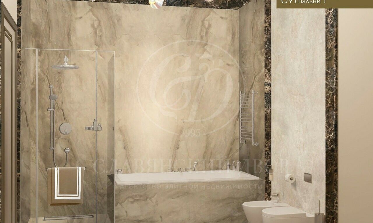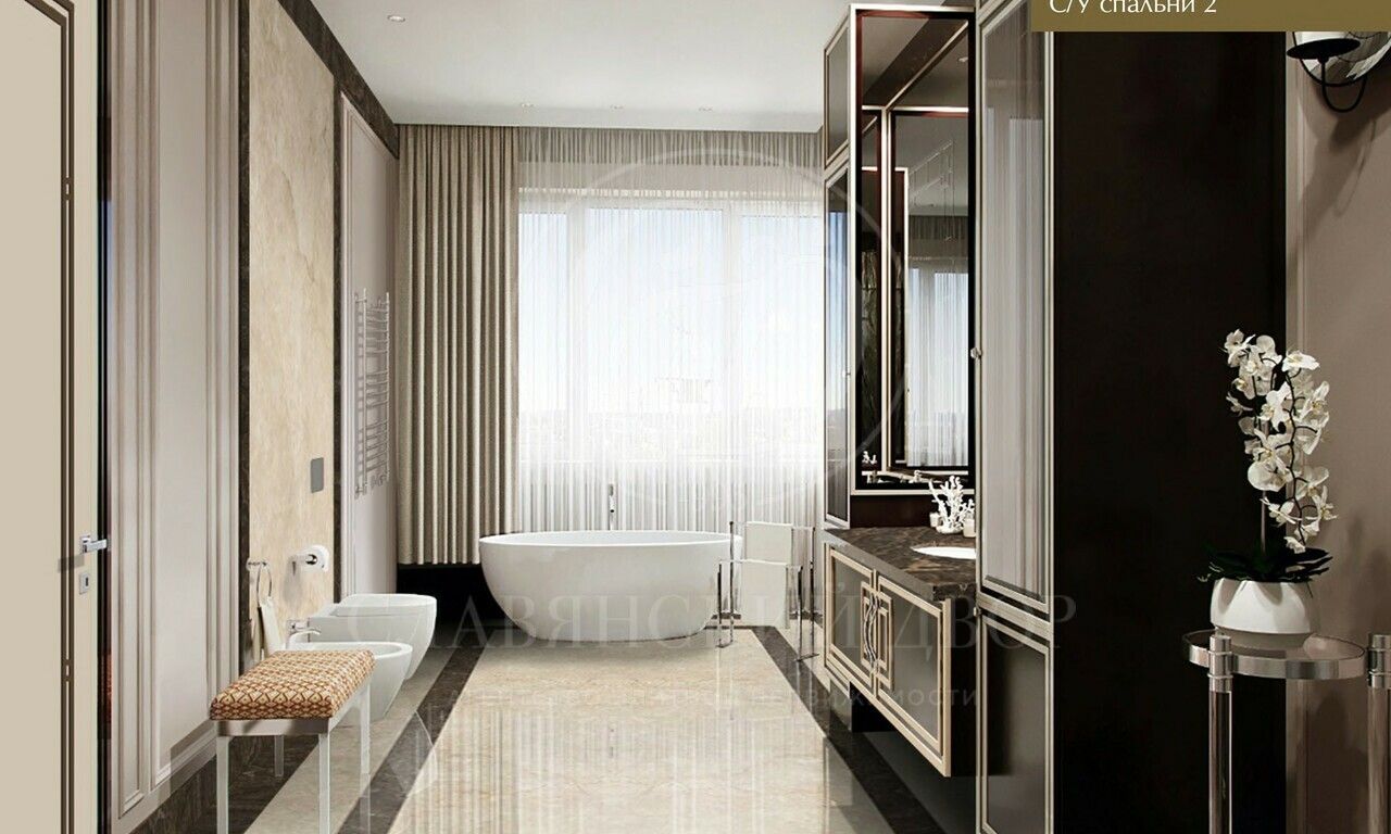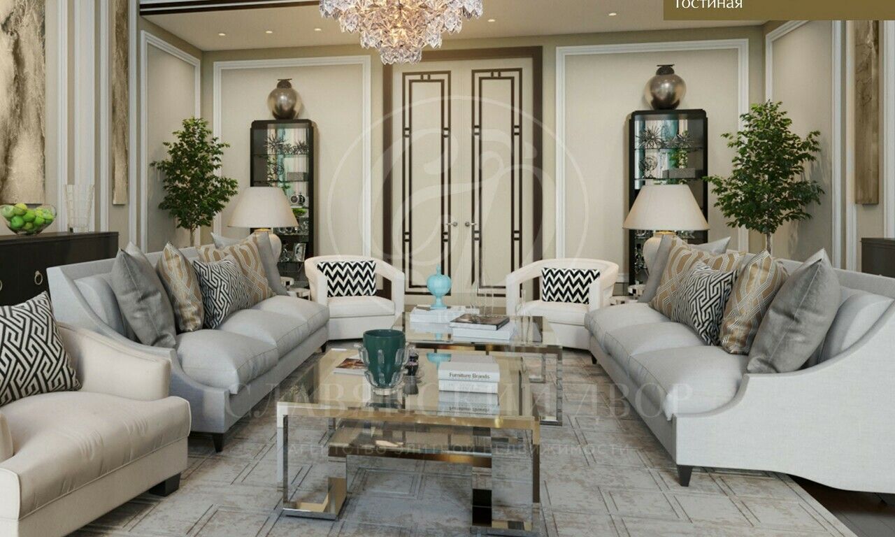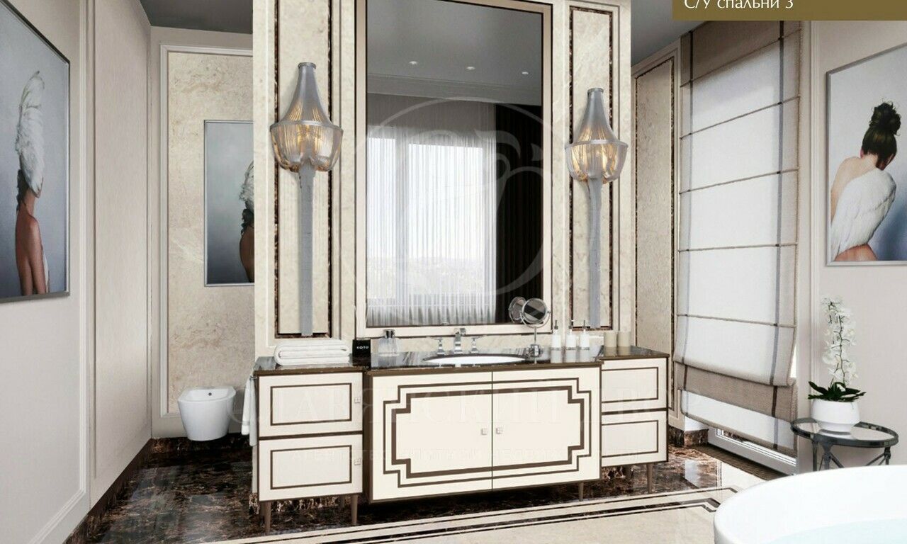 В доме планируются:4 спальни, 4 ванные комнаты, гостевой с/у, 5 гардеробных комнат, 2 гостиные, кабинет, кинозал, спортзал и зона СПА, большая столовая, кухня, встроенный гараж, двухуровневая открытая терраса.