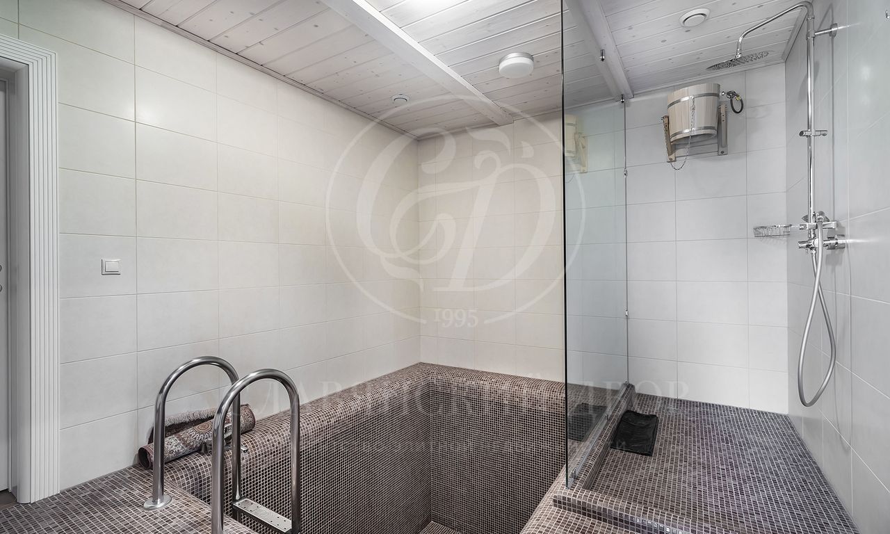 камином, кухня-столовая с выходом на террасу с зоной барбекю, СПА (сауна, купель, душевая, санузел, комната отдыха), постирочная, кладовая, гараж на 2 м/м с мойкой для машин;