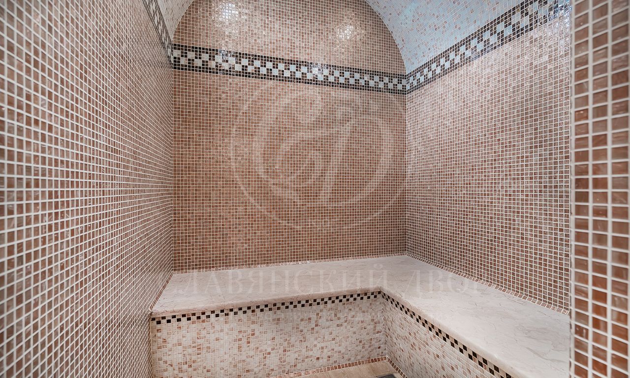 1 этаж: холл с парадной лестницей, гардеробная, гостиная с камином и выходом в сад, кухня, столовая со вторым светом, гостевой с/у, кинотеатр в восточном стиле, зона SPA: бассейн, хаммам, сауна, зона отдыха, раздевалка с душевой, выход на террасу. Хозяйский гараж. Помещение для охраны на втором этаже с отдельным входом.