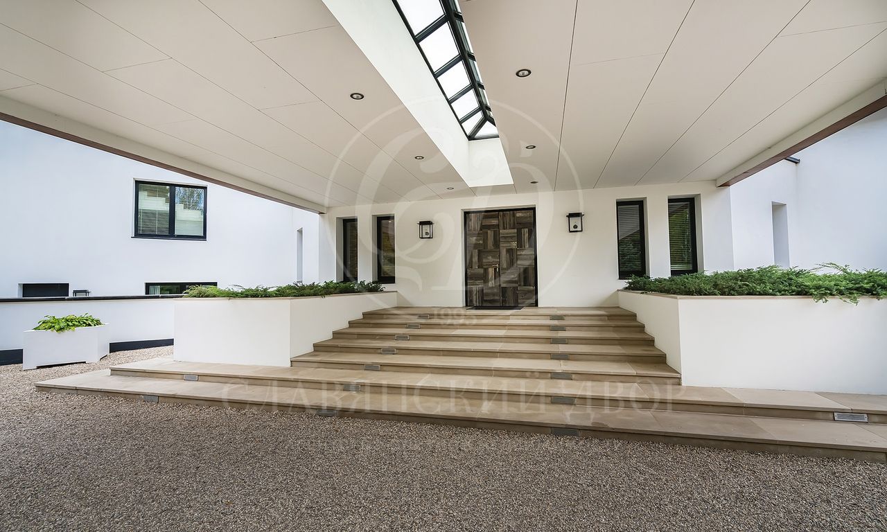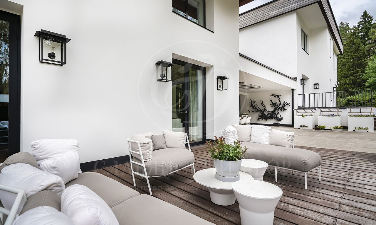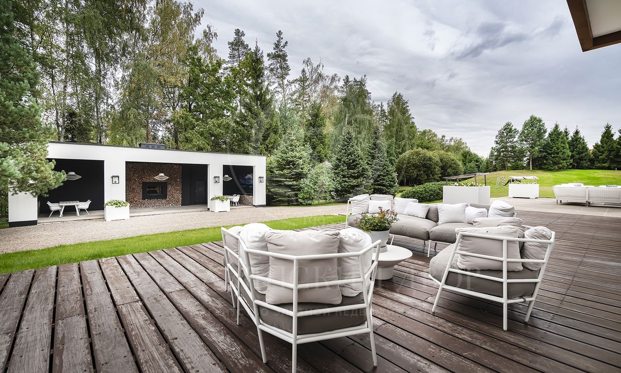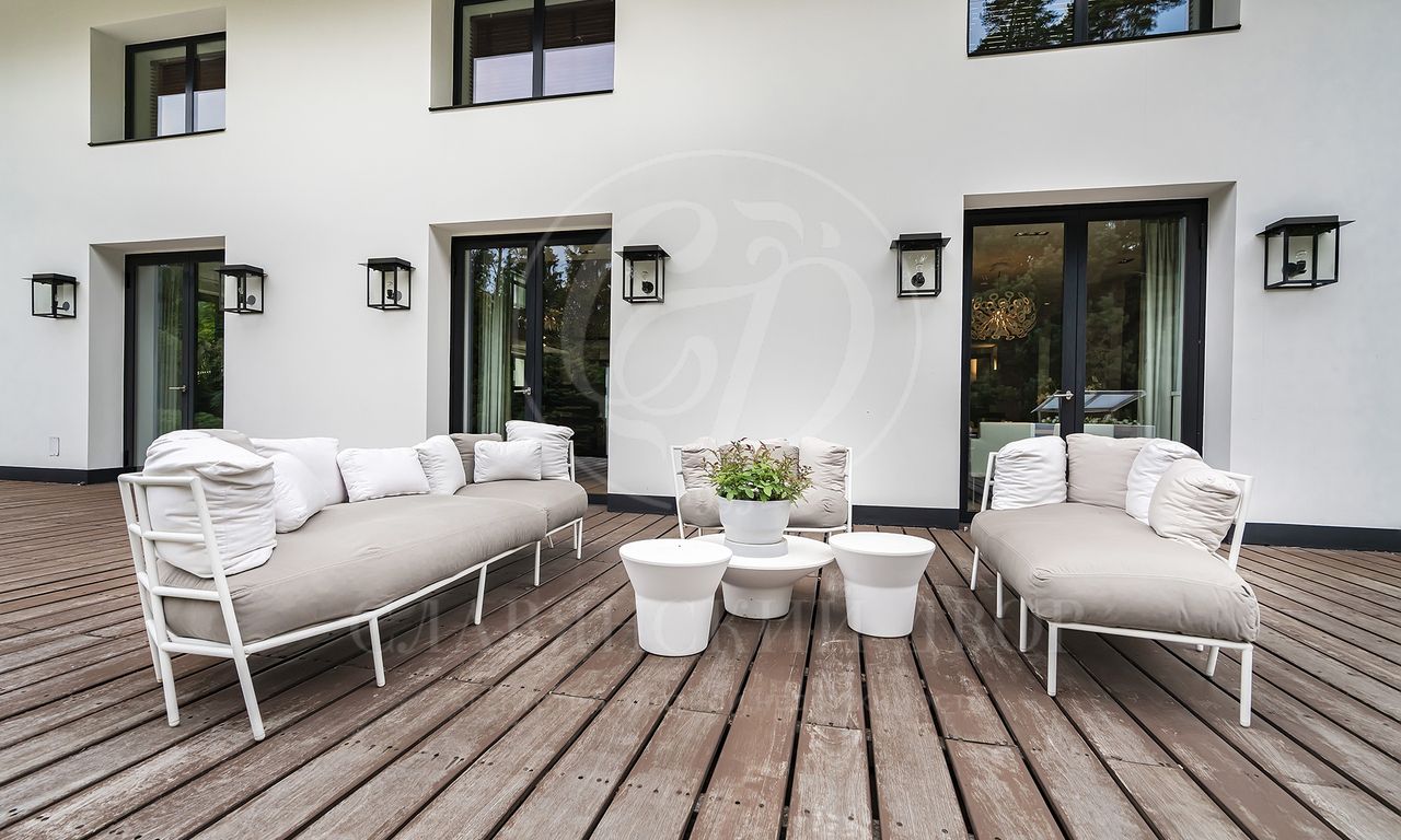 В доме большая открытая терасса, открытый бассейн. На участке выполнен ландшафтный дизайн и расположены детская площадка, а так же зона барбекю. Отдельно стоящий дом для персонала с помещением для охраны и 3 спальными блоками.
