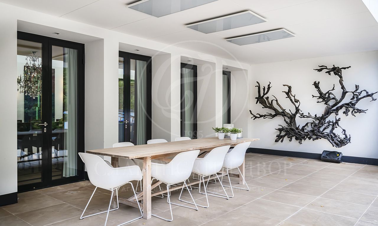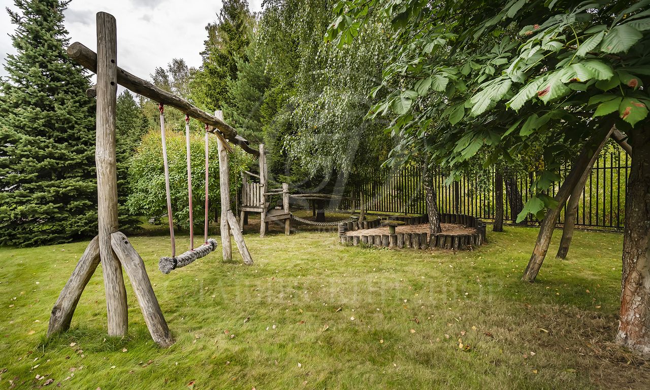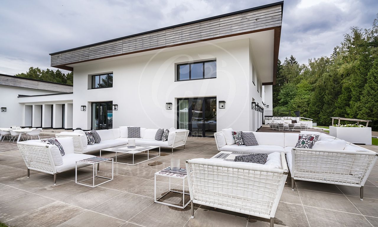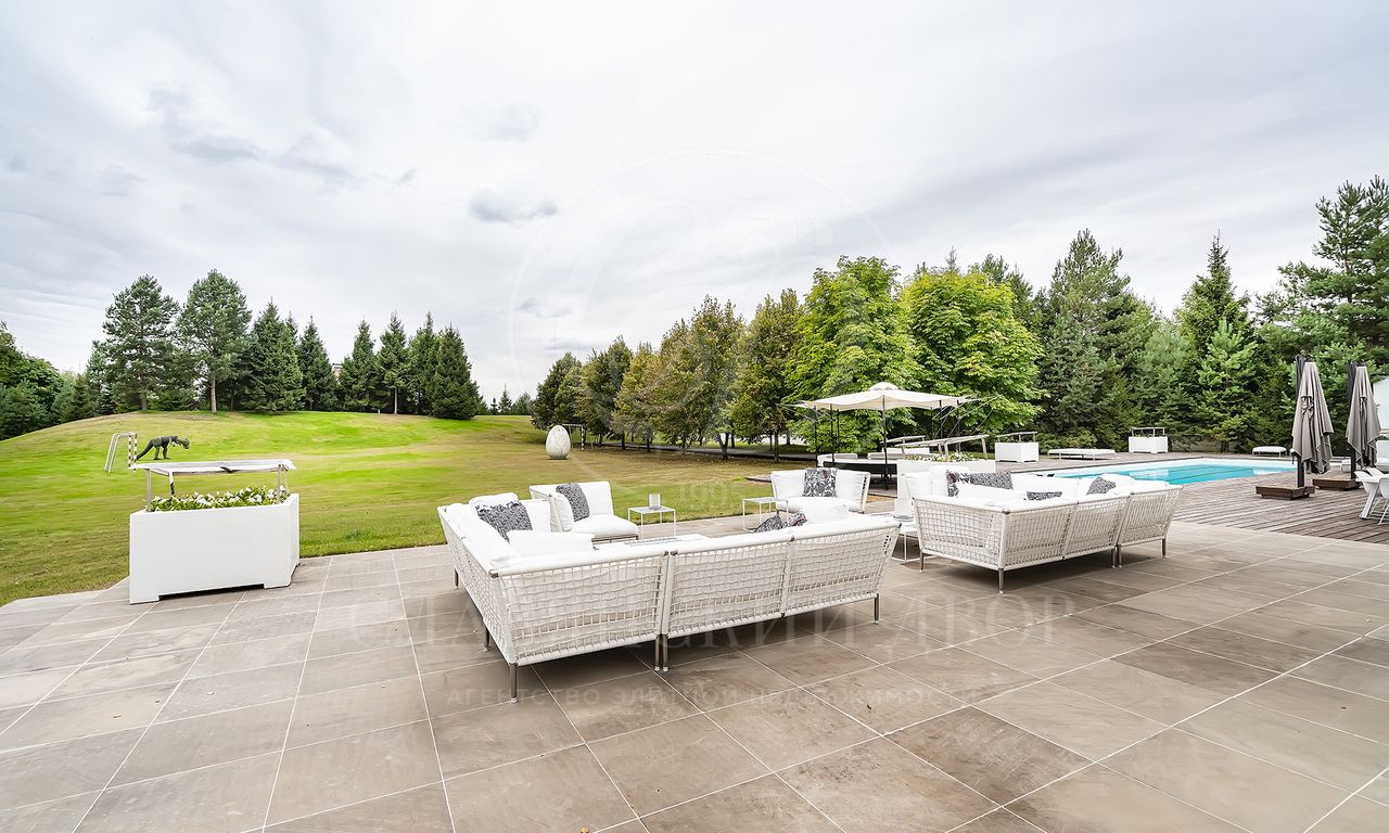 В доме большая открытая терасса, открытый бассейн. На участке выполнен ландшафтный дизайн и расположены детская площадка, а так же зона барбекю. Отдельно стоящий дом для персонала с помещением для охраны и 3 спальными блоками.