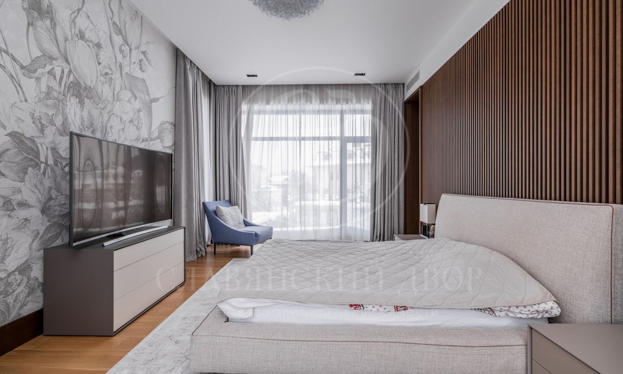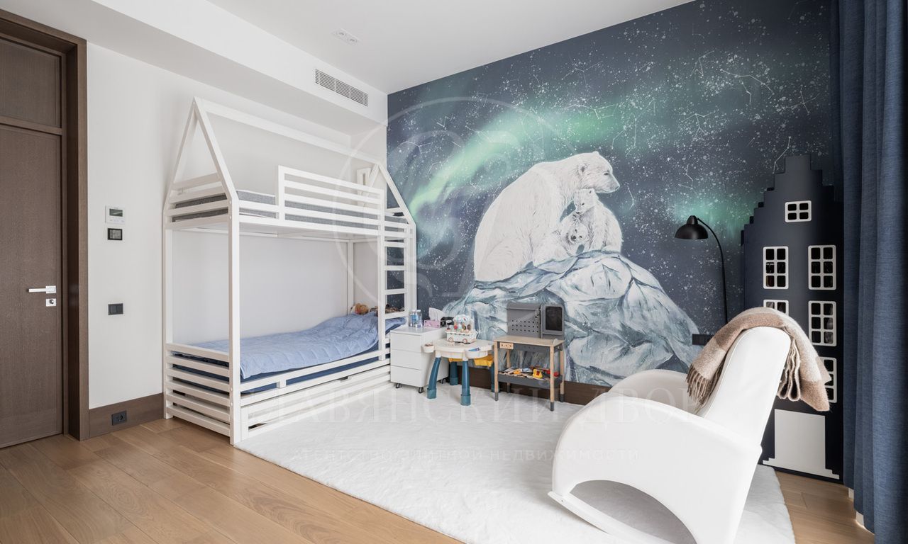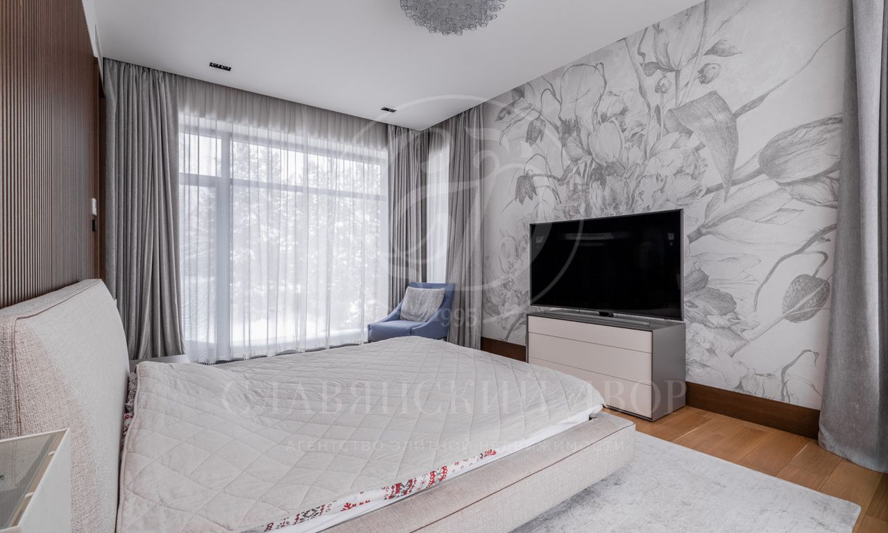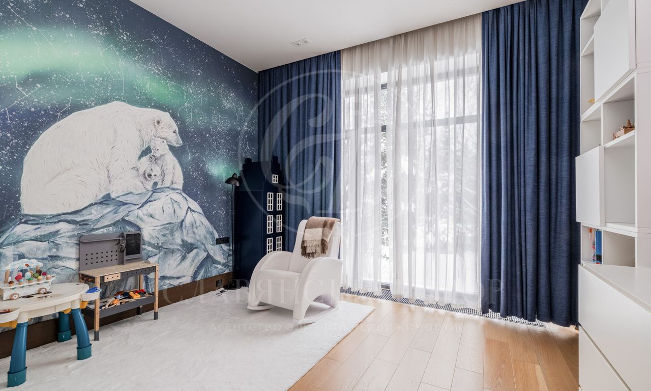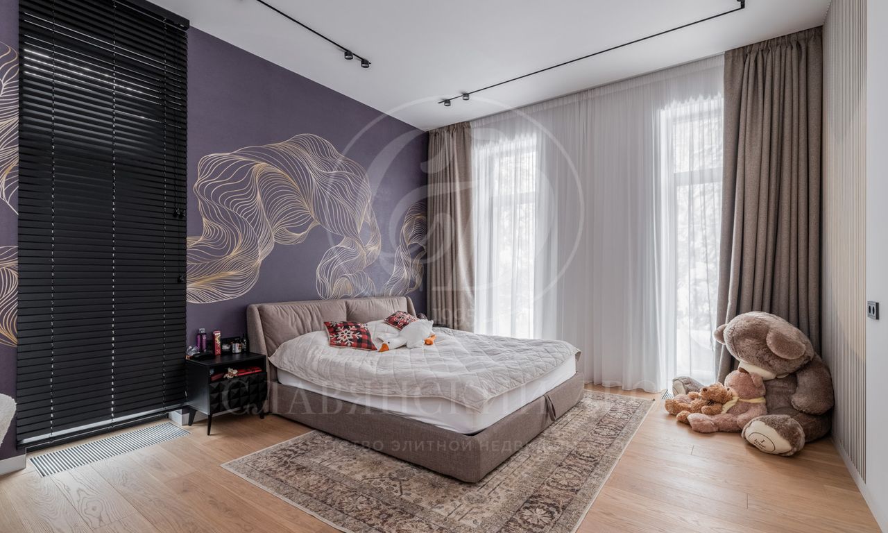 Второй этаж: мастер-спальня с ванной и гардеробной комнатами, две гостевые спальни с санузлами и гардеробными, четыре детские спальни с санузлами.