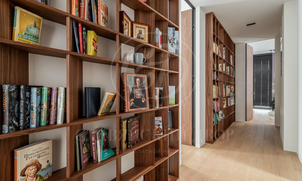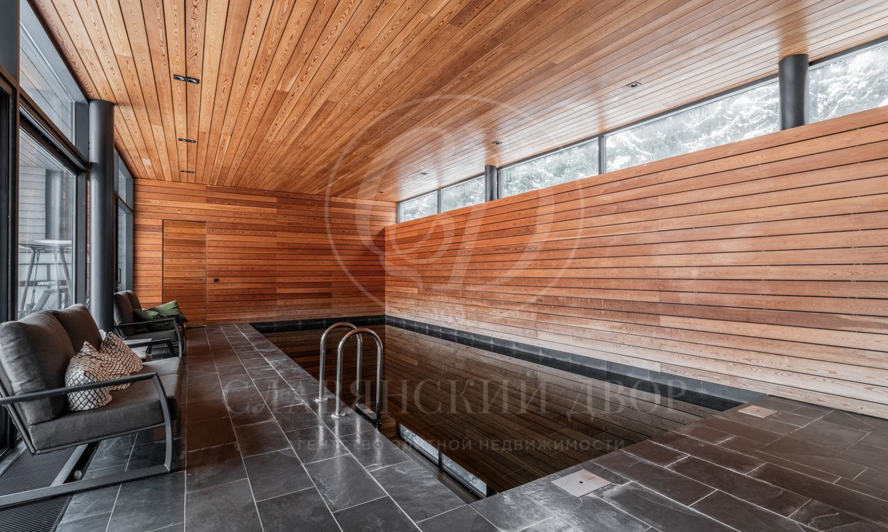 Первый этаж: холл, гардеробная, гостевой с/у, гостиная-столовая с камином, кухня, кладовая, застекленная терраса, Гостевая спальня-кабинет с с/у, SPA-зона (бассейн с выходом на участок, сауна, душевая, санузел). Блок для персонала: спальня, кухня, постирочная. Гараж на 2 автомобиля. Котельная с отдельным входом.