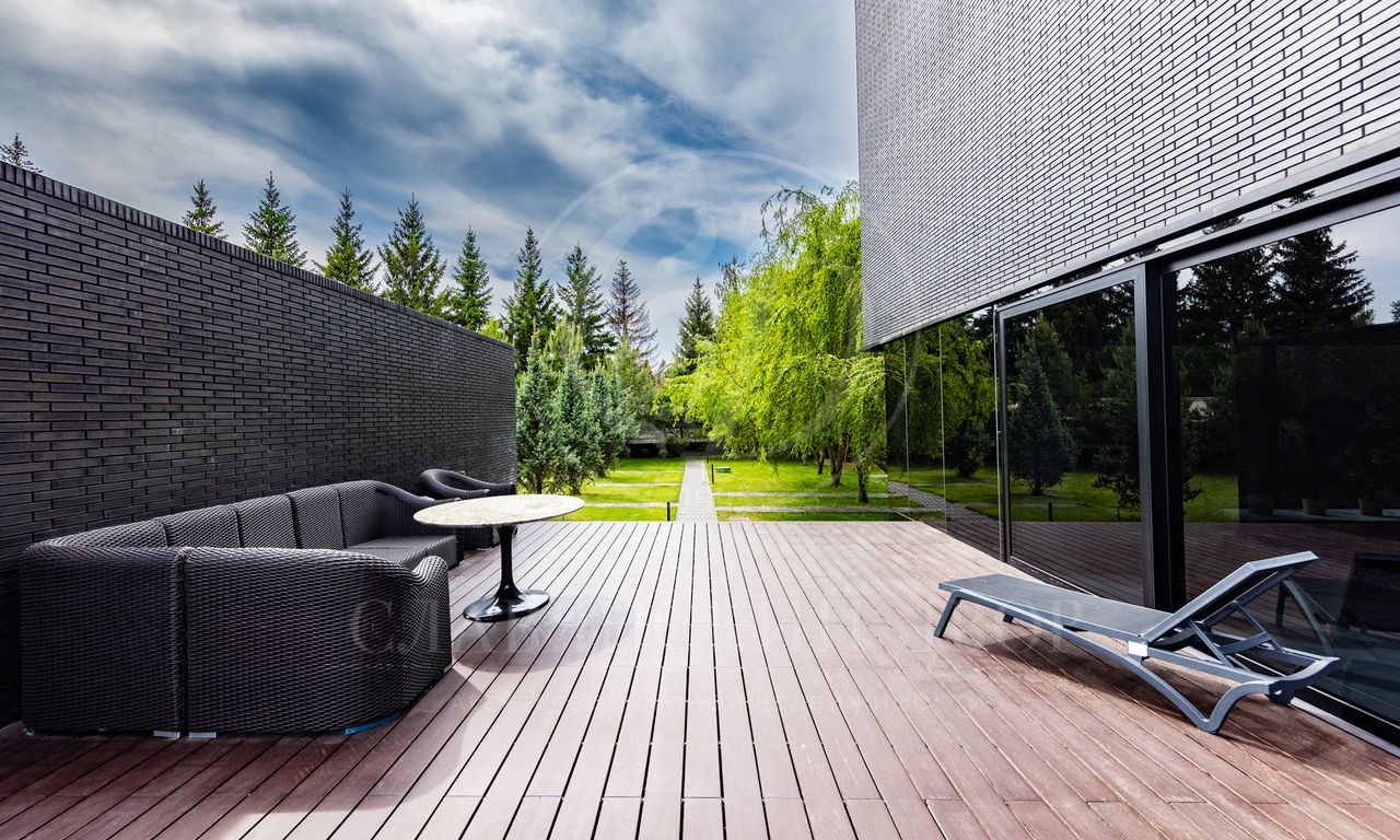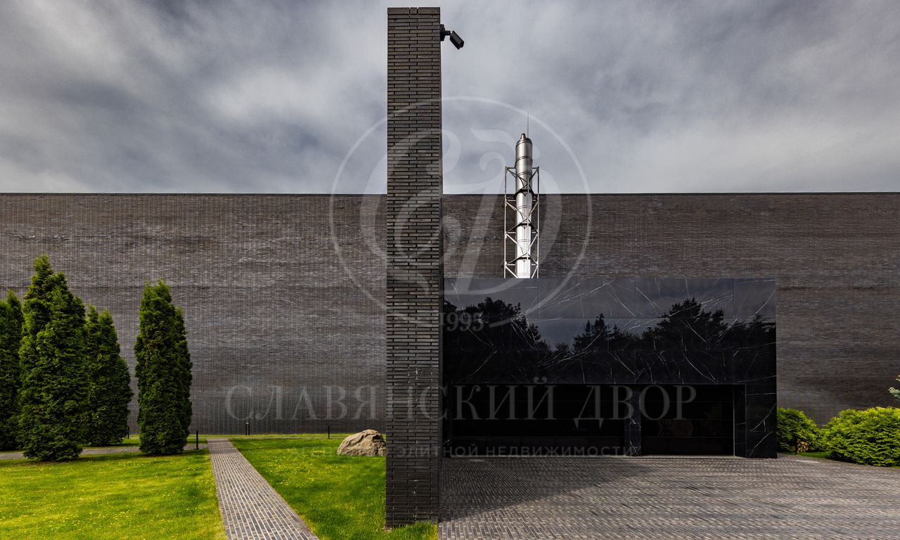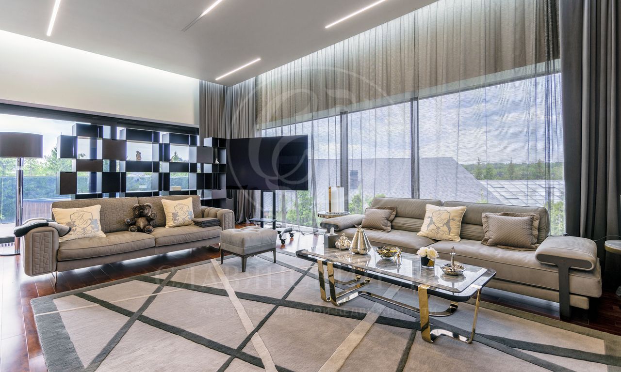 Современная резиденция, площадью 2300 м2, спроектирована в стиле hi-tech: плоская кровля, панорамное остекление и фасад с отделкой натуральным камнем. Контраст гладких стеклянных поверхностей с фактурным кирпичом подчеркивает архитектурную чистоты и актуальность формы.