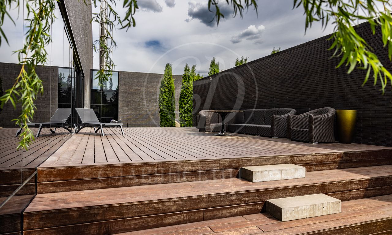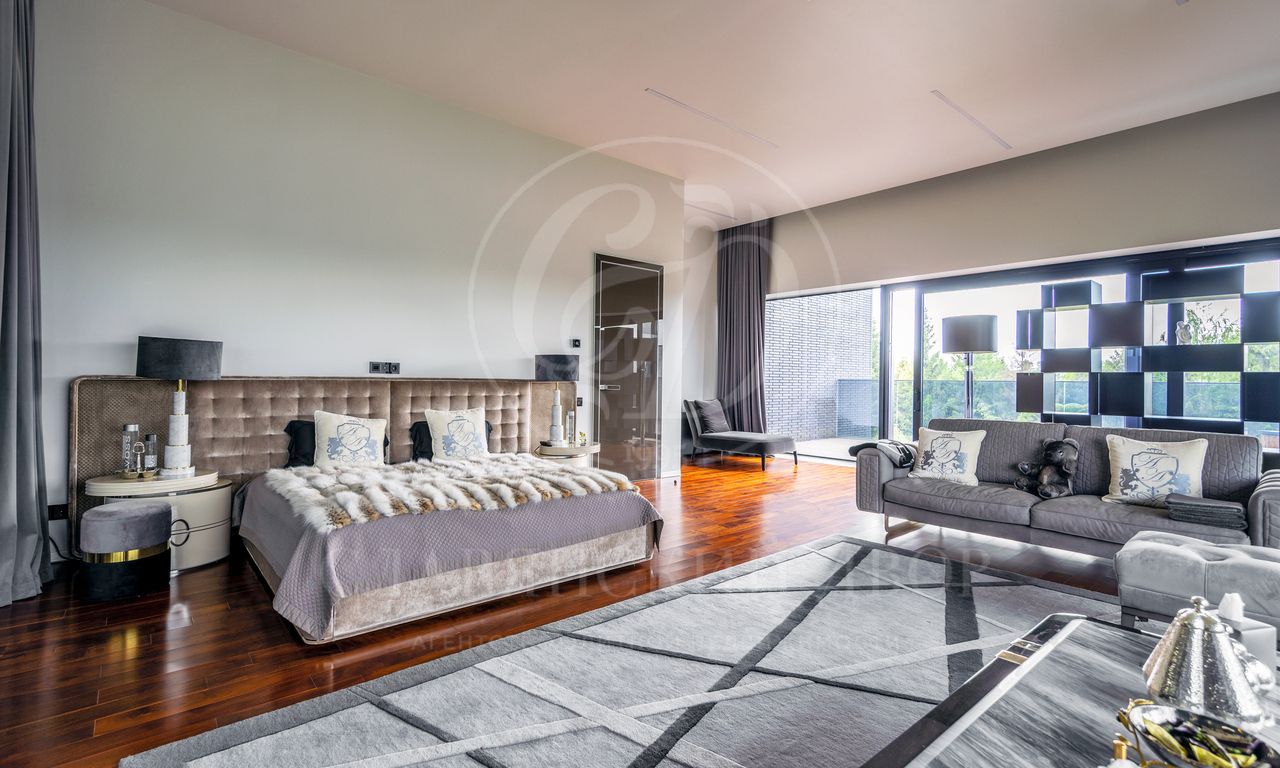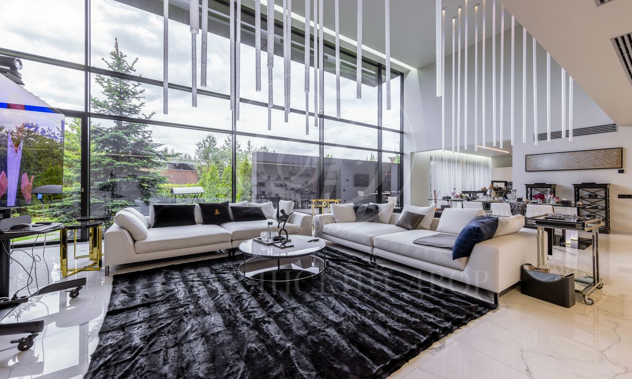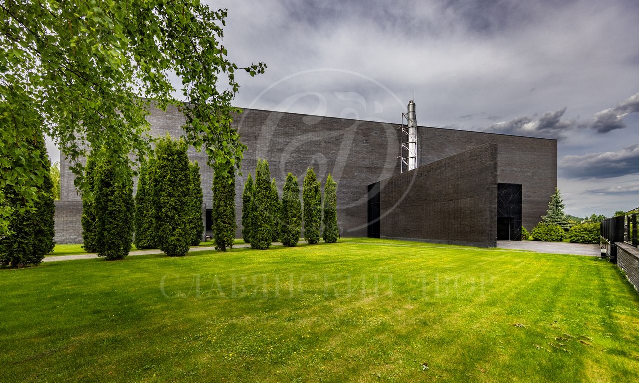 Современная резиденция, площадью 2300 м2, спроектирована в стиле hi-tech: плоская кровля, панорамное остекление и фасад с отделкой натуральным камнем. Контраст гладких стеклянных поверхностей с фактурным кирпичом подчеркивает архитектурную чистоты и актуальность формы.