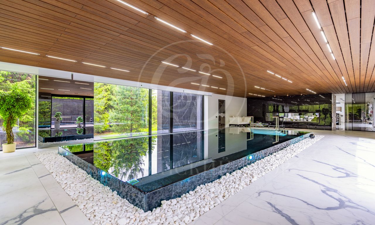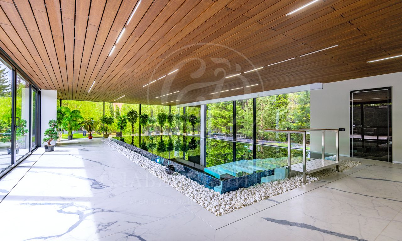 Особое впечатление производит SPA-зона с бассейном: стеклянные стены открывают вид в сад, потолок отделан натуральным деревом, создавая атмосферу уединенного курорта.