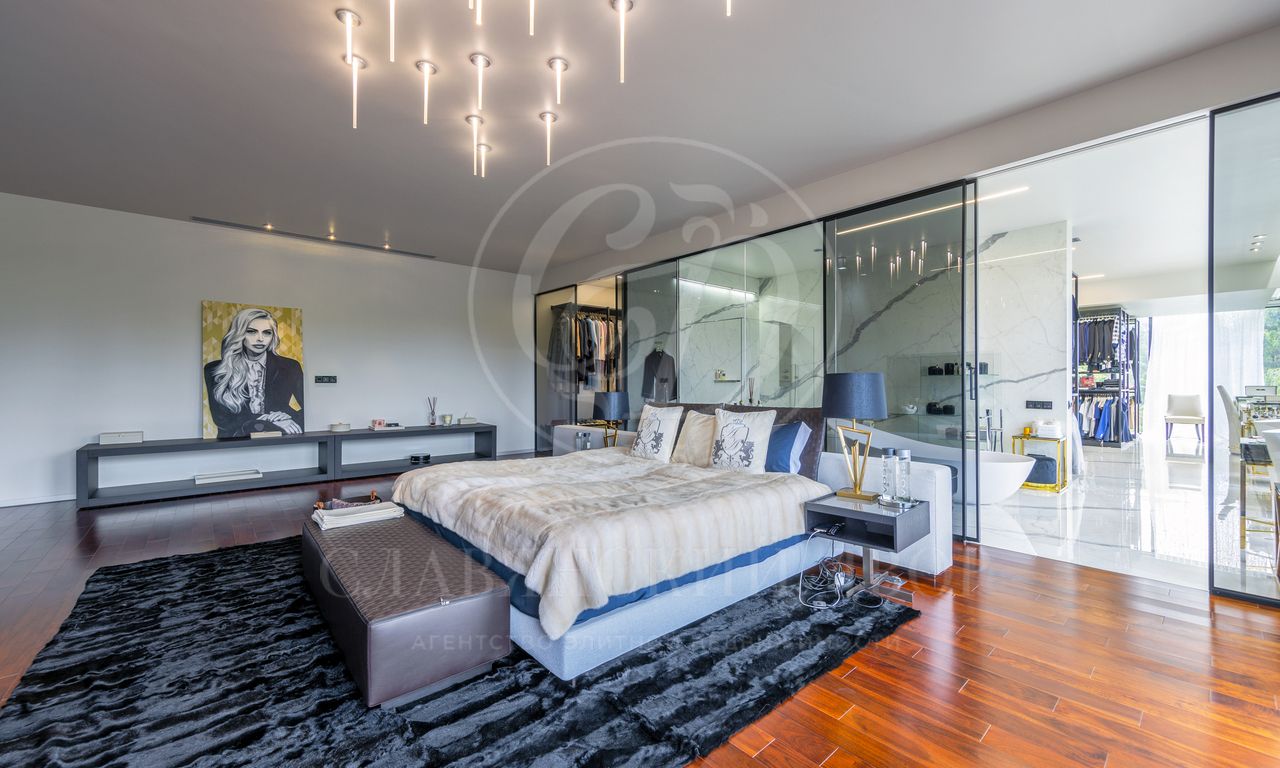 2 этаж: гостевая спальня с санузлом, мастер-блок со спальней, гардеробной и ванной комнатой, 2 детские спальни с индивидуальными гардеробными и санузлами, просторная детская игровая комната, гостевая спальня с кабинетом санузлом и душевой