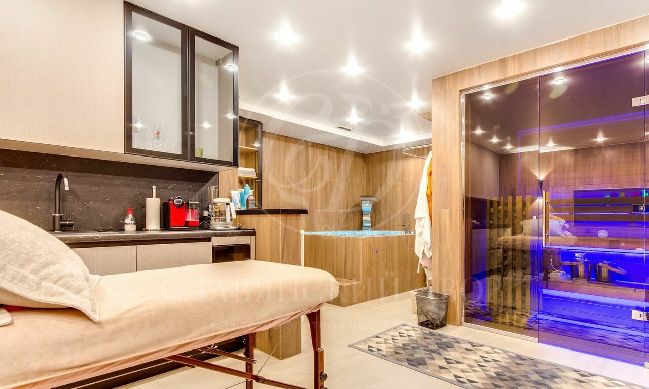 На первом уровне гостевая спальня, спа-зона с хамамом, массажным кабинетом и джакузи.