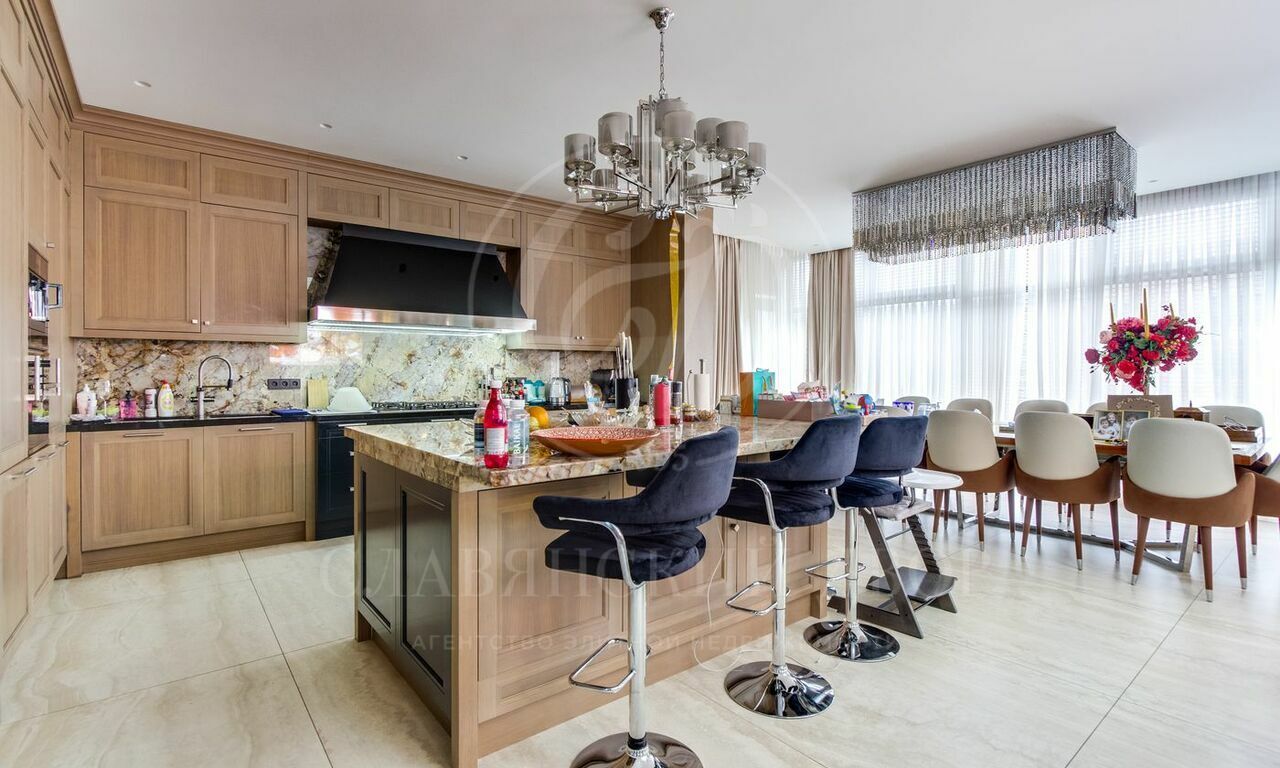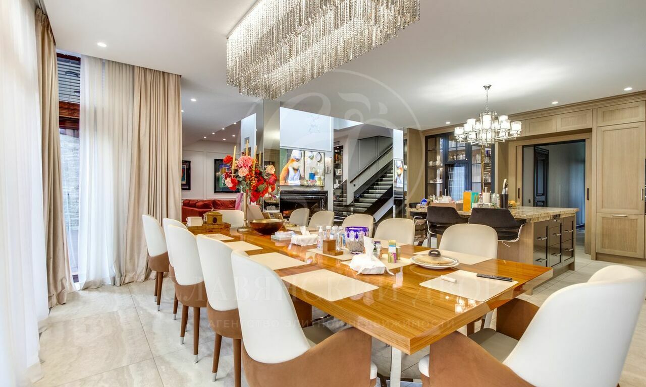 Кухня оборудована по последнему слову техники, что позволяет готовить настоящие кулинарные шедевры. Обеденная зона с большим столом и мягкими стульями станет идеальным пространством для семейных ужинов и званых обедов.