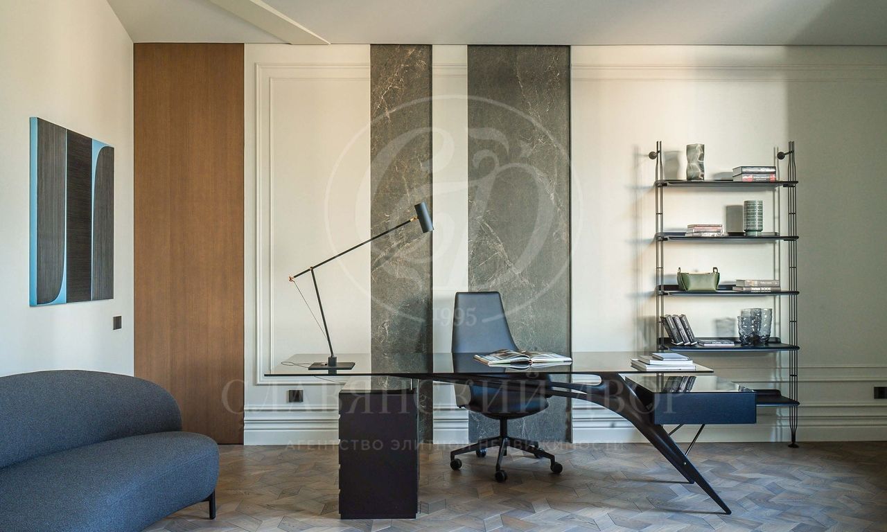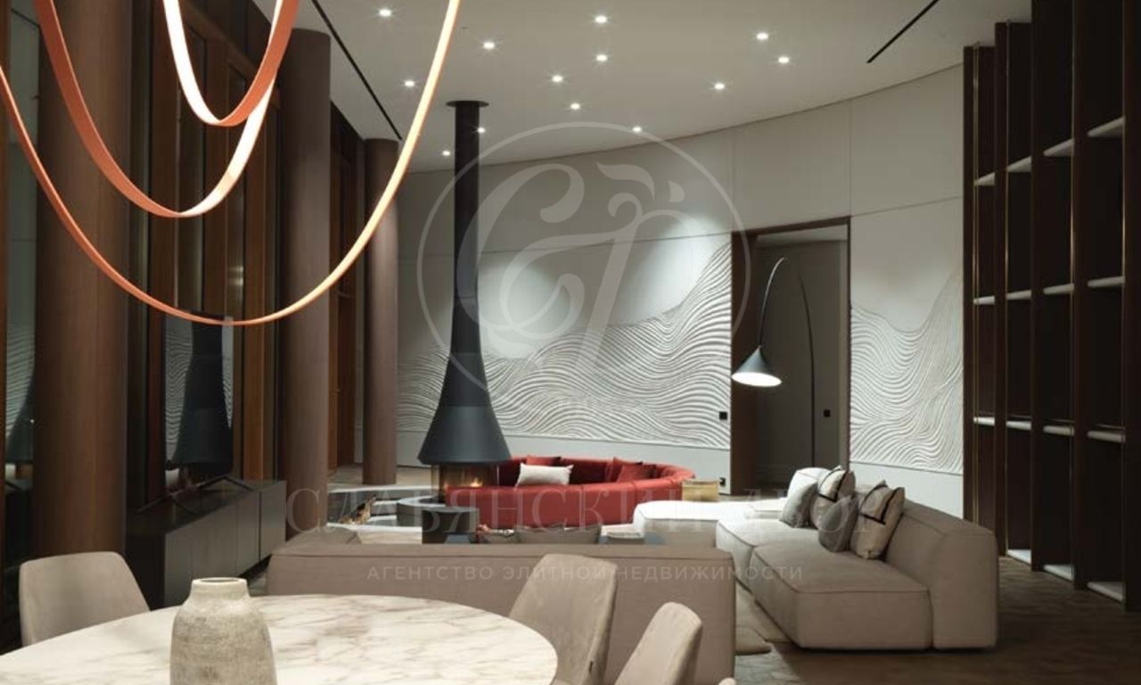 Главное помещение особняка — трехзонная столовая-гостиная общей площадью 126 кв.м. Помещение объединяет гипсовый барельеф, украшающий радиусную стену. В отделке дома используются натуральные материалы и нейтральная цветовая гамма. Главный яркий акцент в гостиной — утопленный в пол диван глубокого ярко-бордового оттенка. Lounge-зона у очага — не только модное, но и уютное место для неспешных душевных бесед у камина.