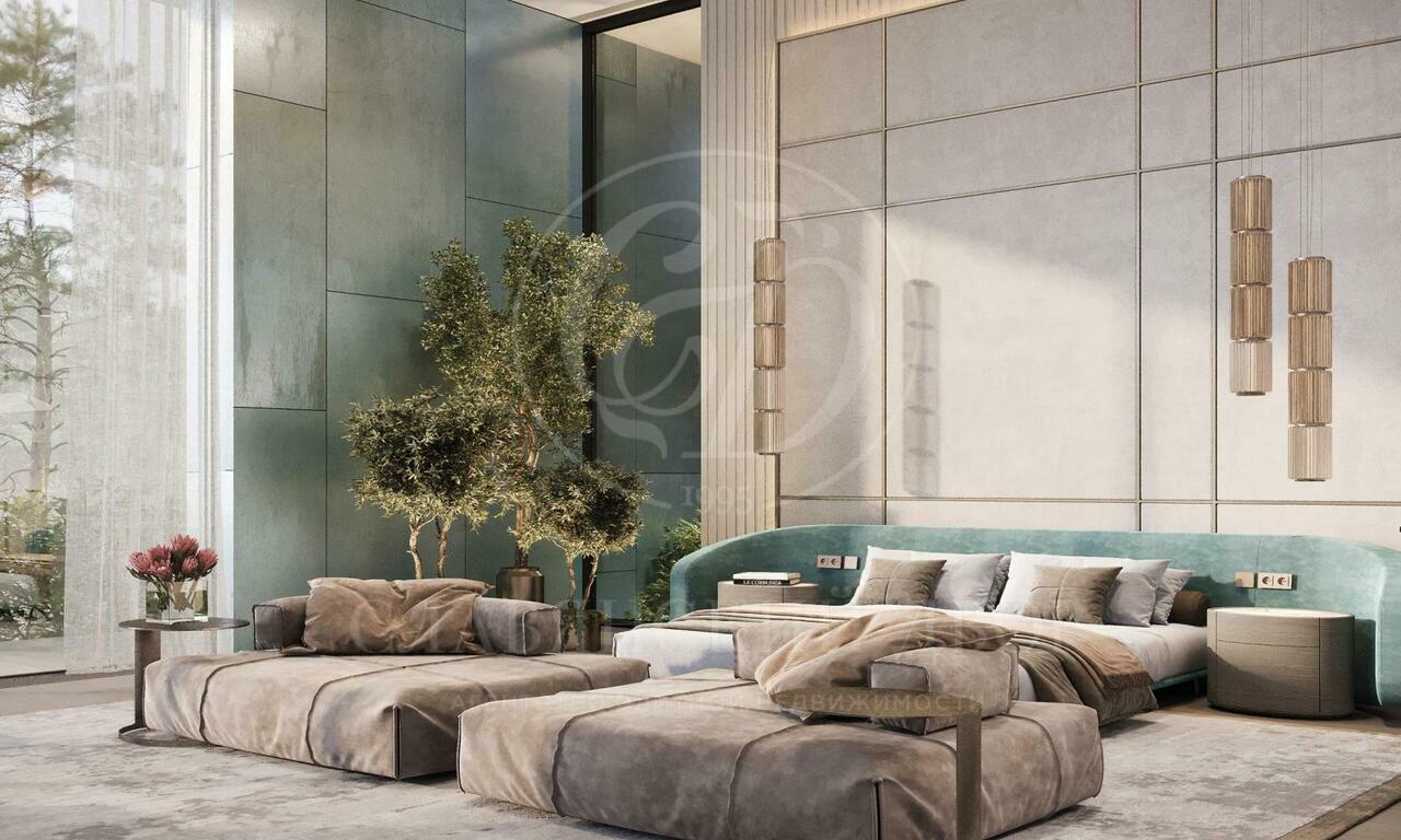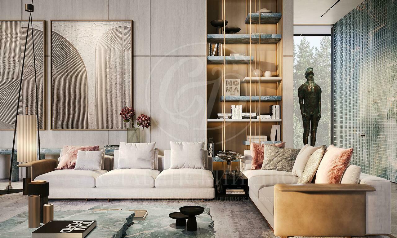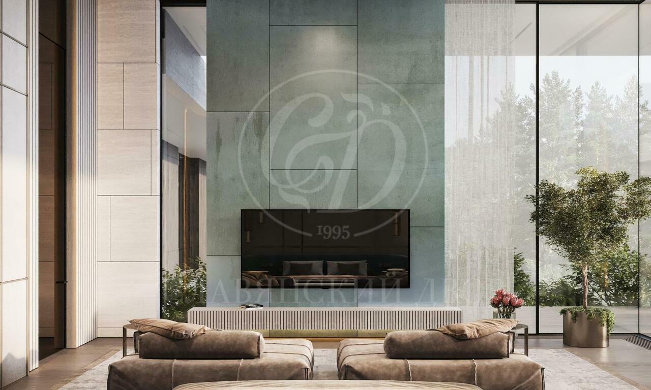 Планировка дома продумана до мелочей: просторный холл, несколько гардеробных и санузлов, каминный зал-столовая, основная и рабочие кухни с кладовыми, женский и мужской кабинеты (один из которых может служить спальней), отдельная зона для персонала с собственным входом, постирочная, бельевая, серверная, гараж на 3 машины и мастерская (имеет рядом санузел и можно сделать блок спальни). В жилой части — мастер-блок с будуаром, гардеробной, ванной и спальней, а также две детские спальни, каждая с гардеробной и с/у. Проект по вентиляции предусматривает увлажнение, по электрике выполнялся с учётом возможности установить «умный дом». Высота потолков — впечатляющие 6 метров, это придаёт пространству объём и лёгкость. Имеется готовый дизайн-проект интерьеров от студии SL, выдержанный в лаконичном и современном стиле.