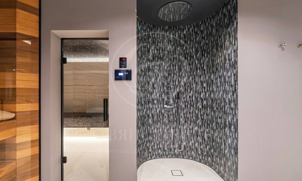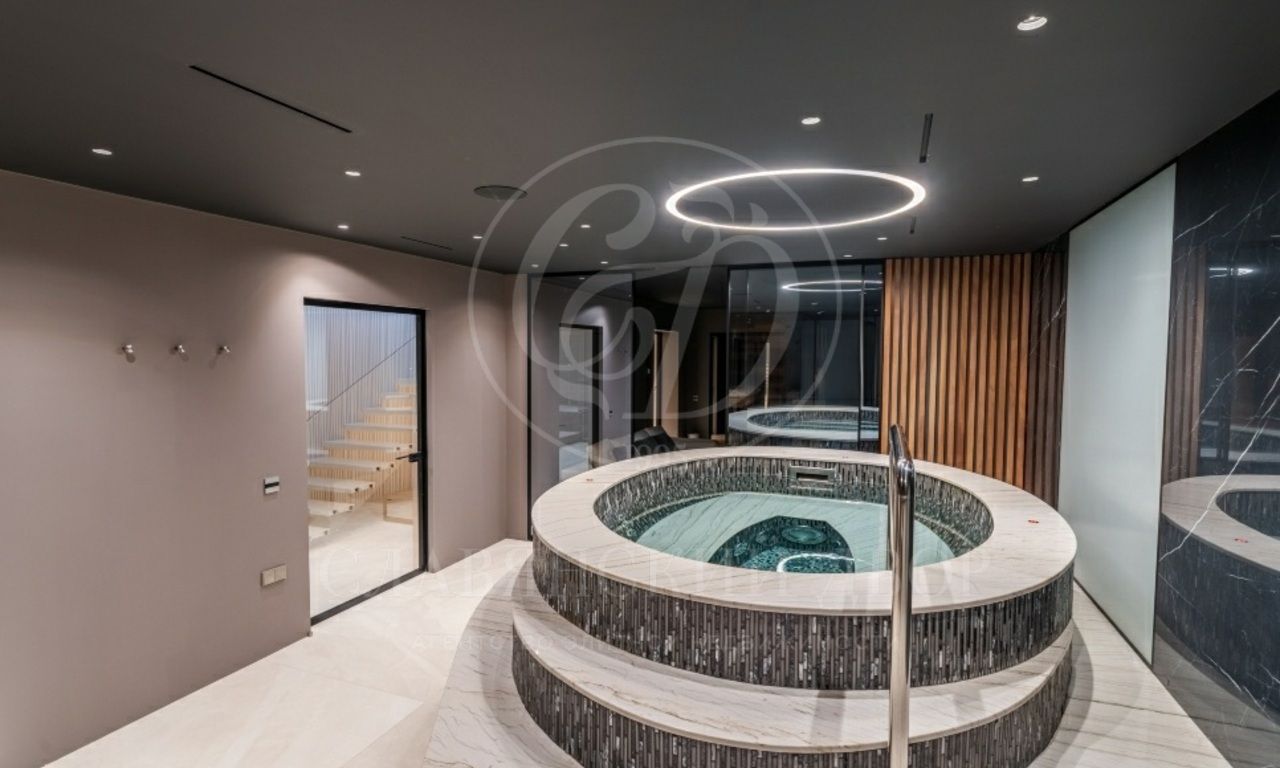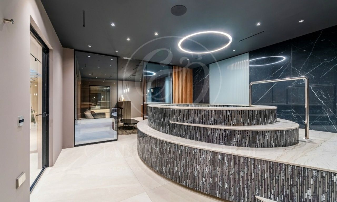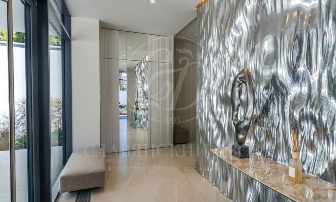 Легкость конструкции и утонченная архитектура этого дома делают его поистине впечатляющим. Несущие столбы из нержавеющей стали и четкая геометрия здания создают ощущение, будто дом парит в воздухе. Гостиная с двусторонним паровым камином и панорамными видами, кухня- столовая с выходом на террасу, четыре спальни, кабинет и спа-зона с сауной, хаммамом, джакузи и купелью — всё это создает функциональную атмосферу гармонии.
