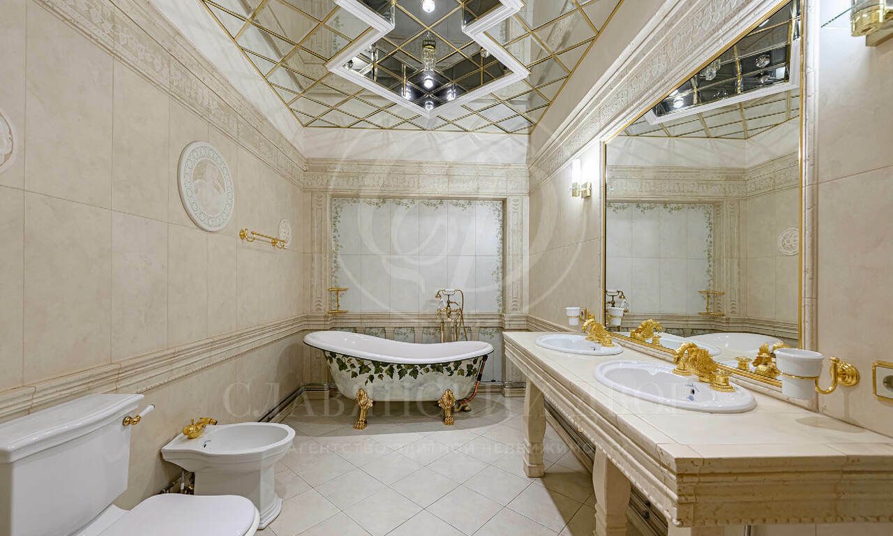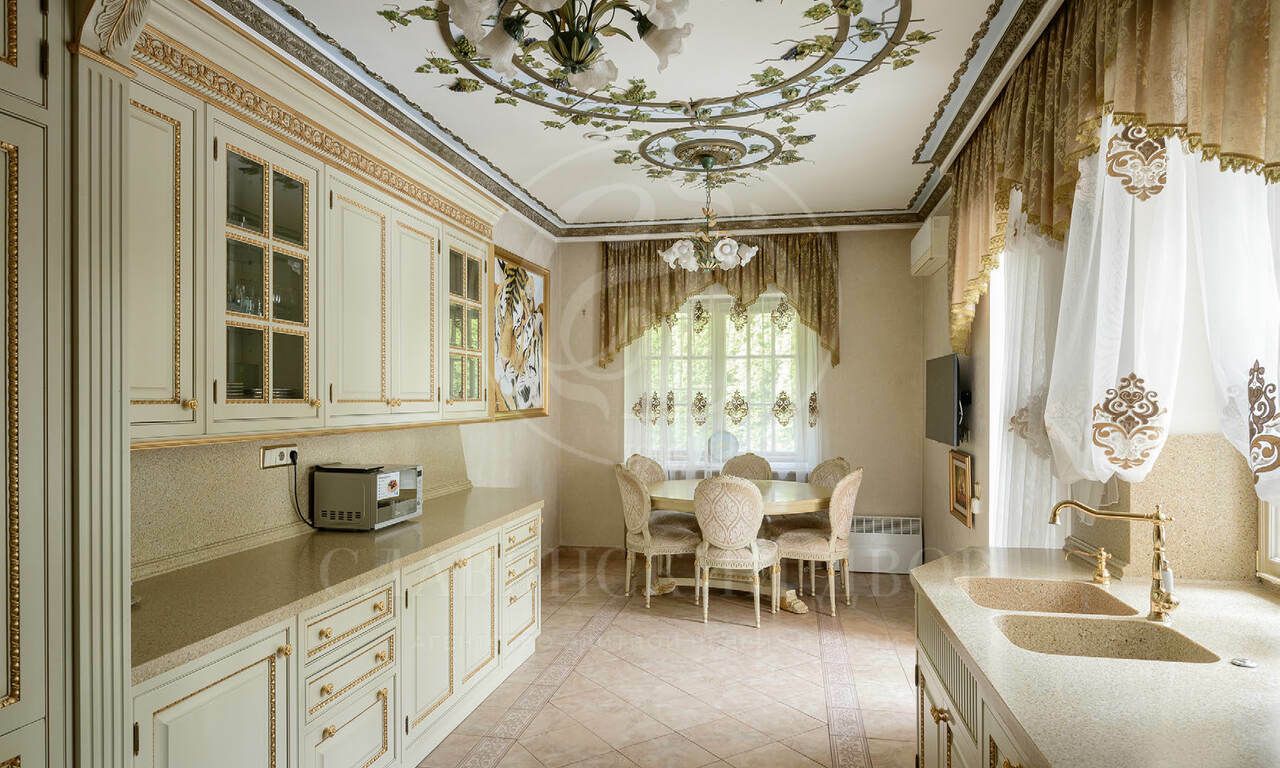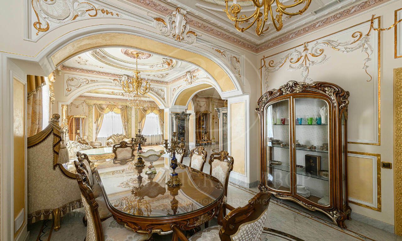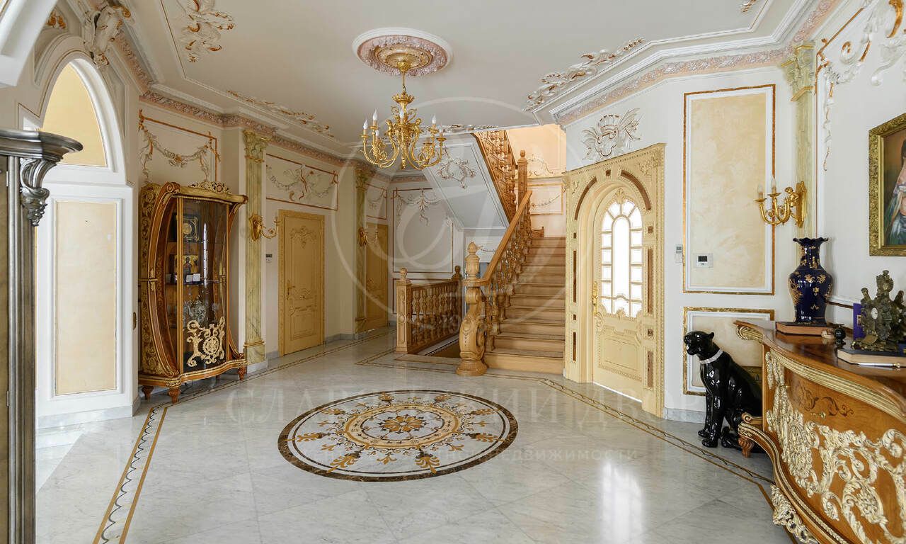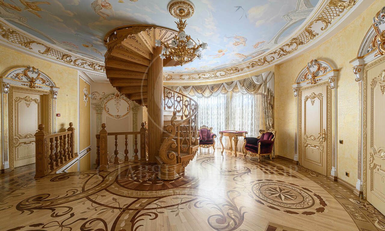 На продажу предлагается элегантная резиденция , созданная по индивидуальному проекту в классическом стиле. В отделке использованы материалы премиум класса, Стены в доме — декоративная штукатурка, роспись, натуральное дерево и мрамор. Пол — художественный паркет и мрамор. Потолки — ручная роспись. Двери и подоконники — массив дерева и мрамор.