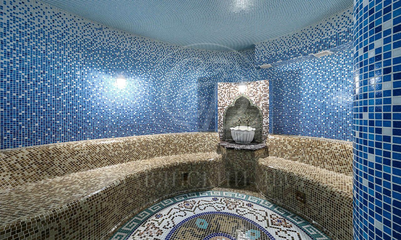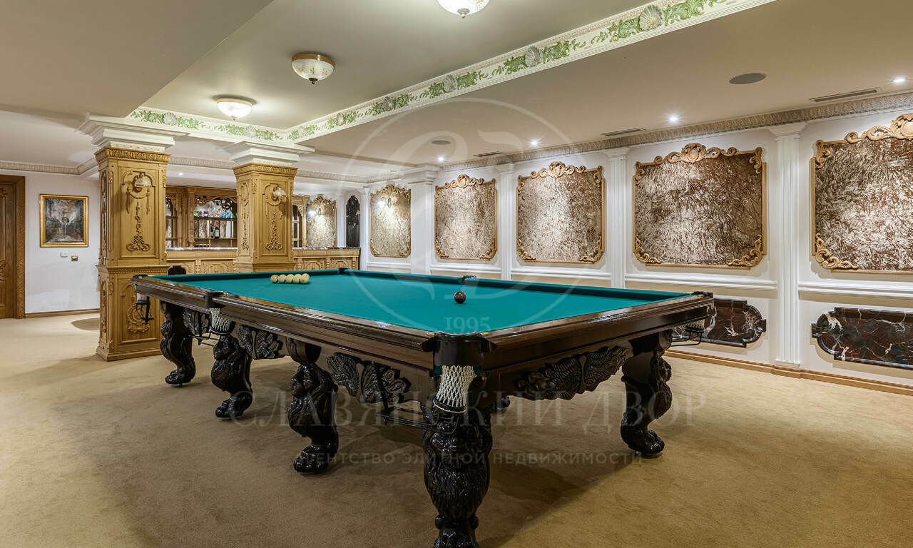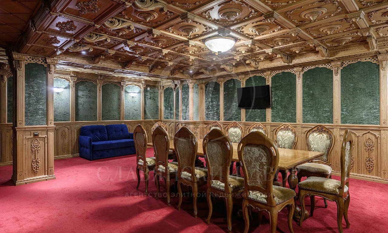 Цокольный этаж: бильярдная с баром, переговорная, винное хранилище, хаммам с комнатой отдыха, гостевой с/у, блок для персонала (спальня, кухня, с/у), технические помещения (постирочная, оружейная, кладовые, генераторная, котельная, электрощитовая).