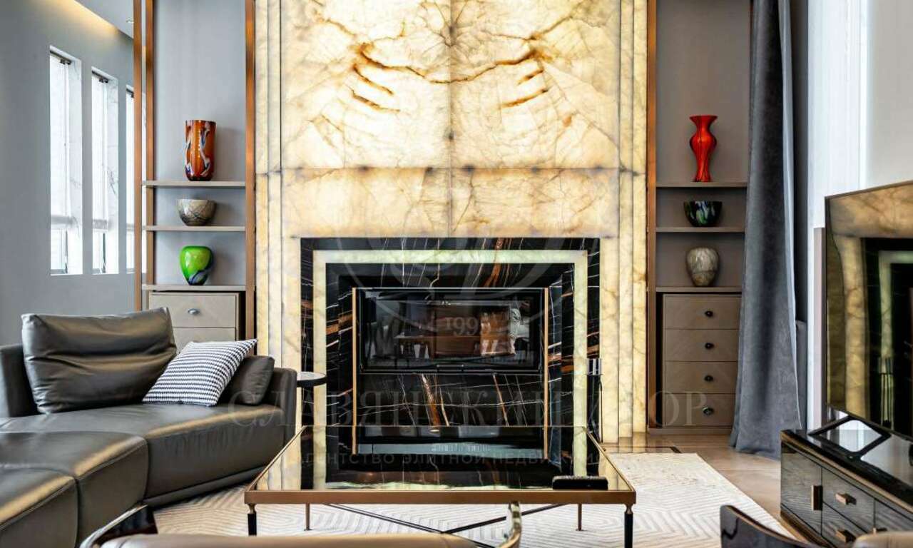 Уютная гостинная с камином, в отделке которого использовался оникс с подсветкой.
