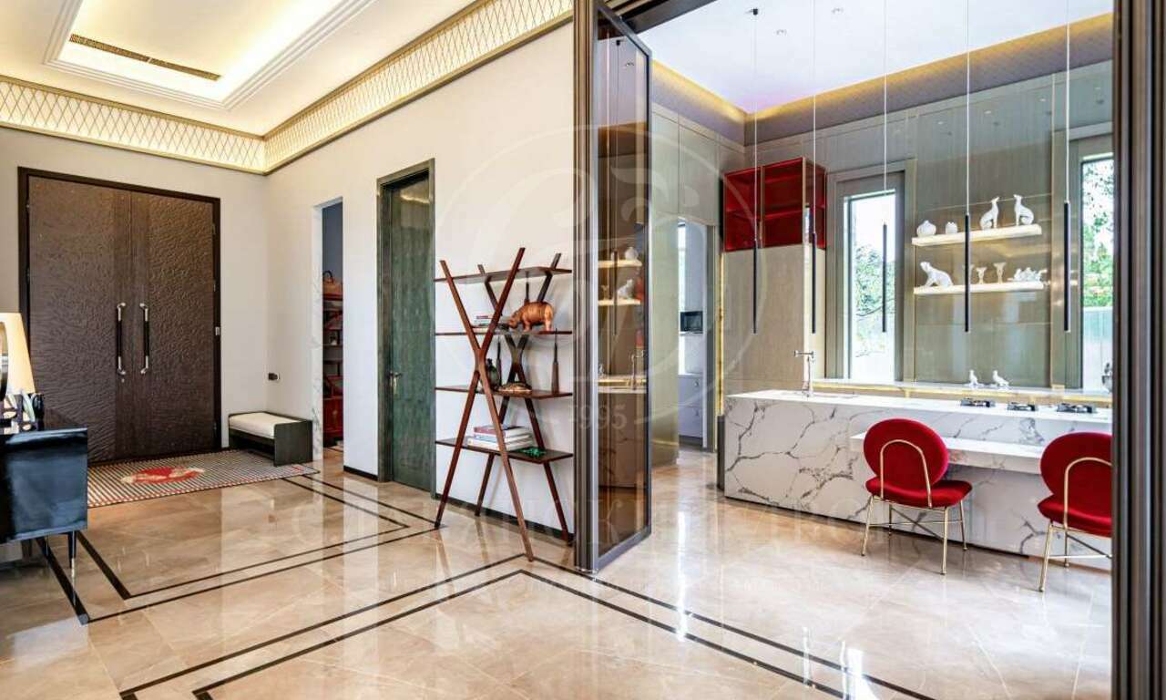 Современная обустроенная кухня с отдельной комнатой для хранения и выходом на террасу