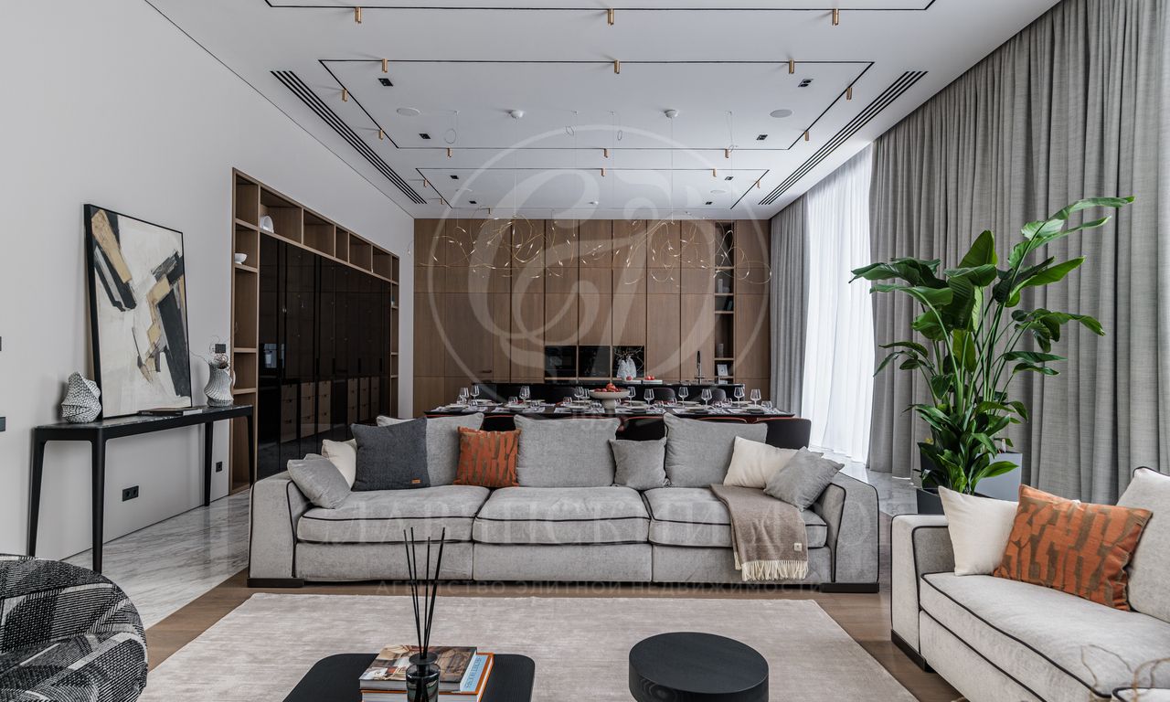 Стильная гостиная сочетает современный дизайн и комфорт. Уникальная световая установка на потолке добавляет динамичности, а минималистичные полки и декоративные элементы завершают образ, подчеркивая утонченность интерьера.