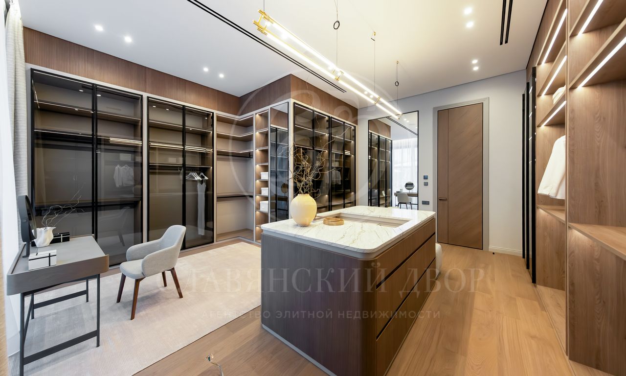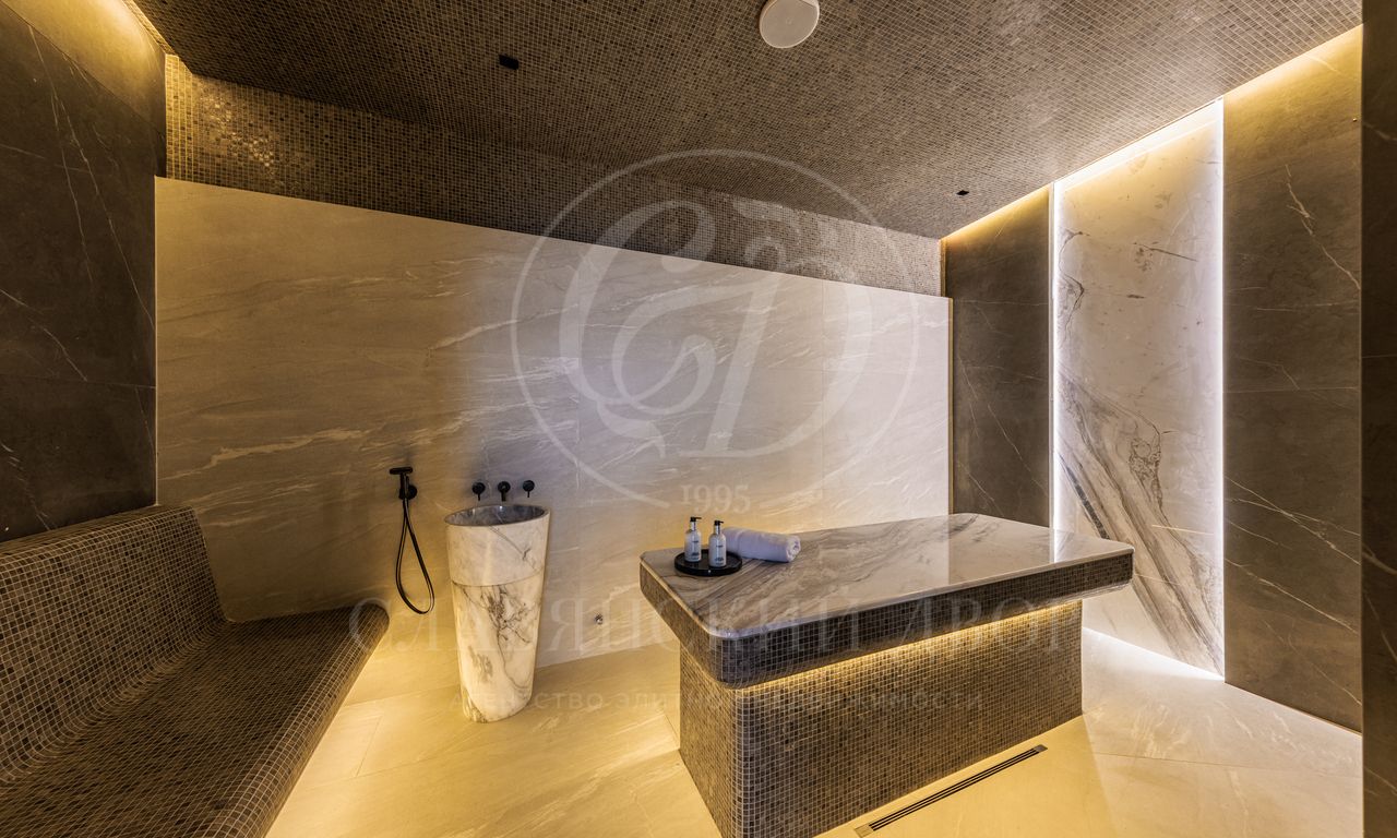 1 этаж: холл, кухня-гостиная с выходом на террасу и в зону BBQ, столовая, рабочая кухня, гардеробные, лифт, гостевой с/у, гостевая спальня с с/у и гардеробной, зона СПА: бассейн, сауна, хаммам, массажный кабинет, тренажерный зал, раздевалка, комната для водителя, помещения свободного назначения, кладовые, гараж: 4 машиноместа.