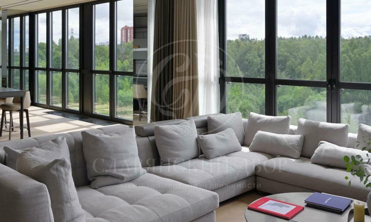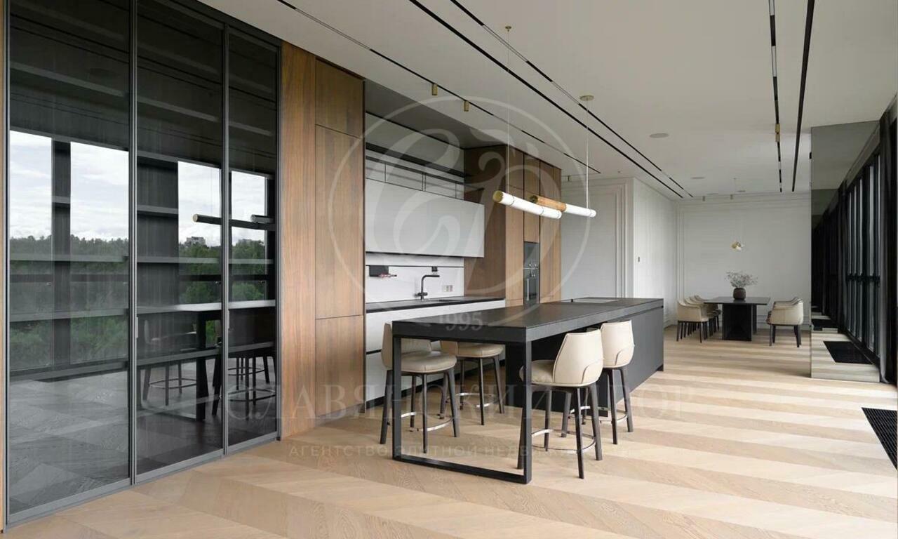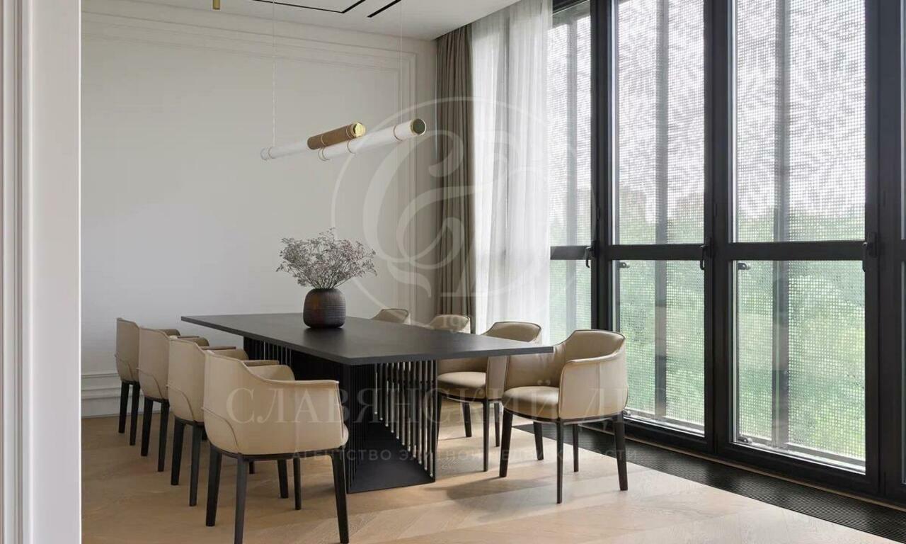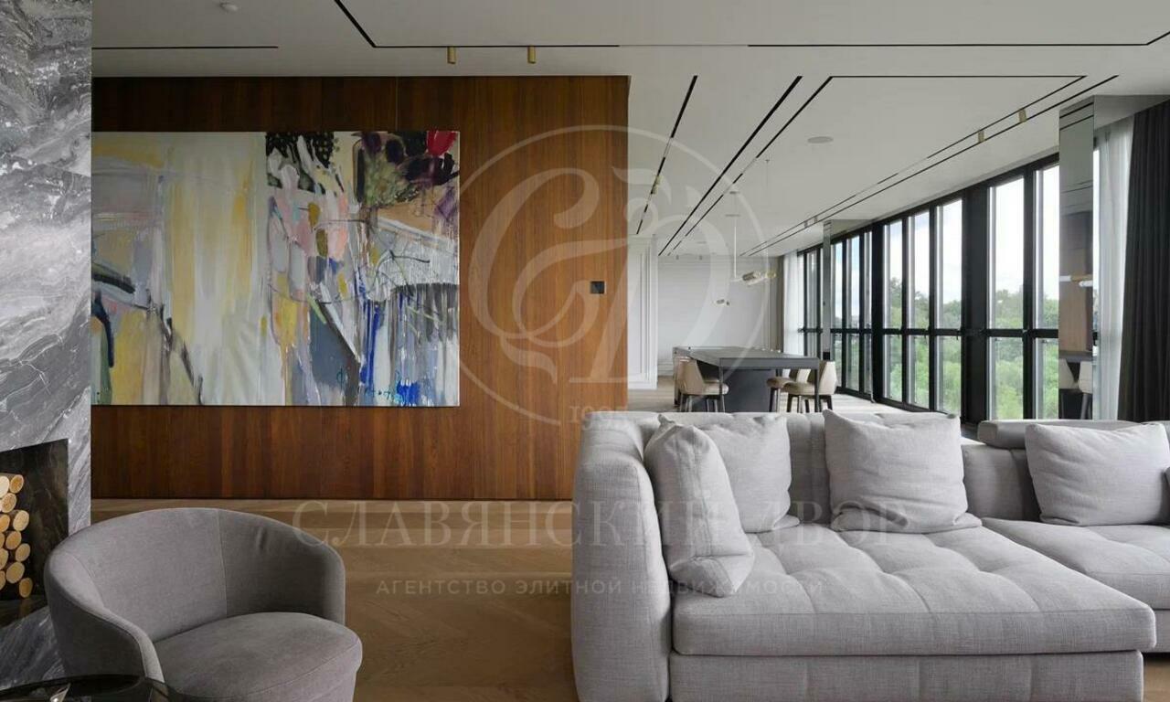 Гостиная-столовая —центральное общественное пространство с панорамными видами на Сколково и реку. Пространство оформлено сдержанно, но торжественно. Коллекция современного искусства подобрана галеристкой Мариной Гисич.