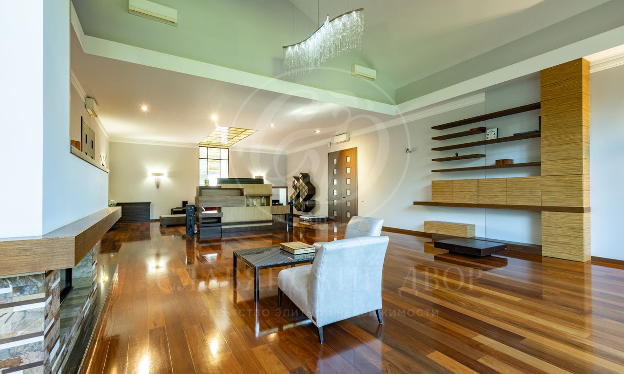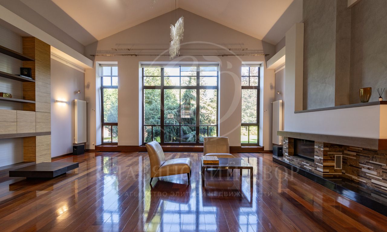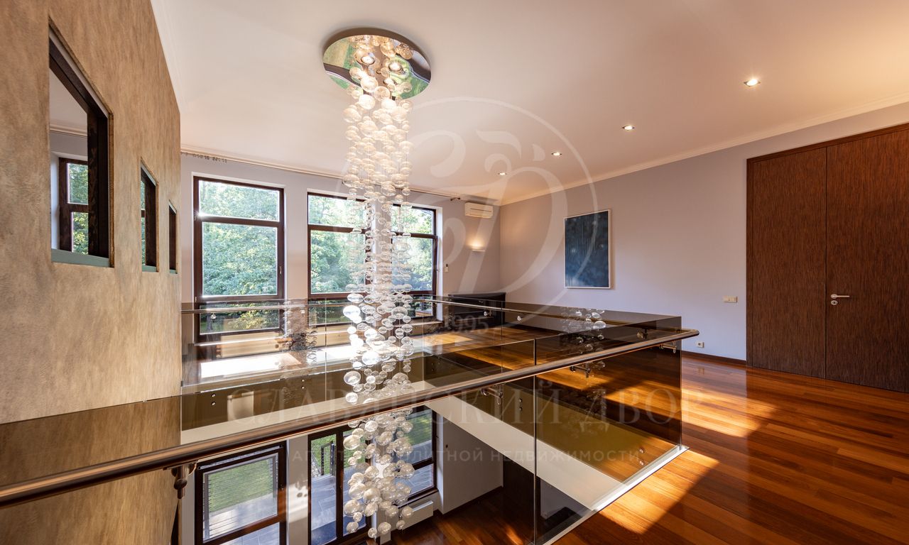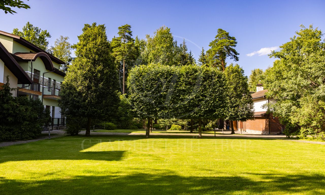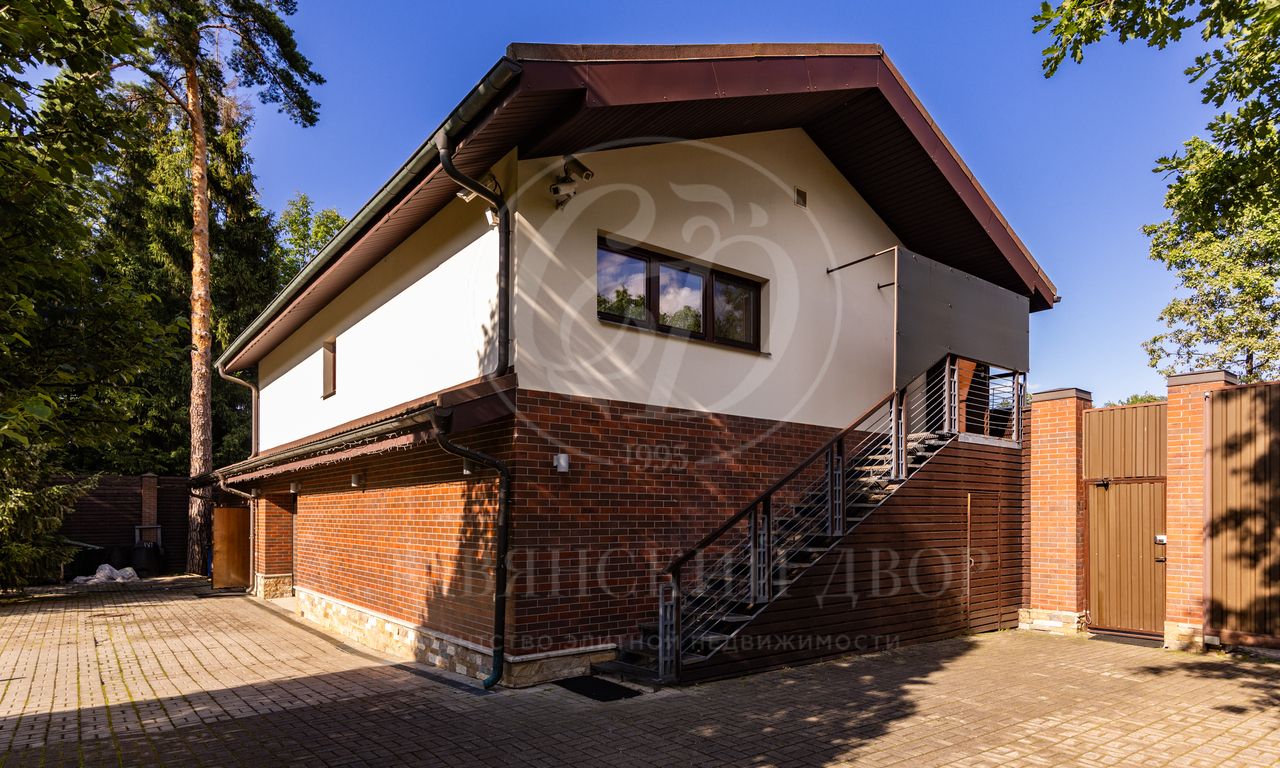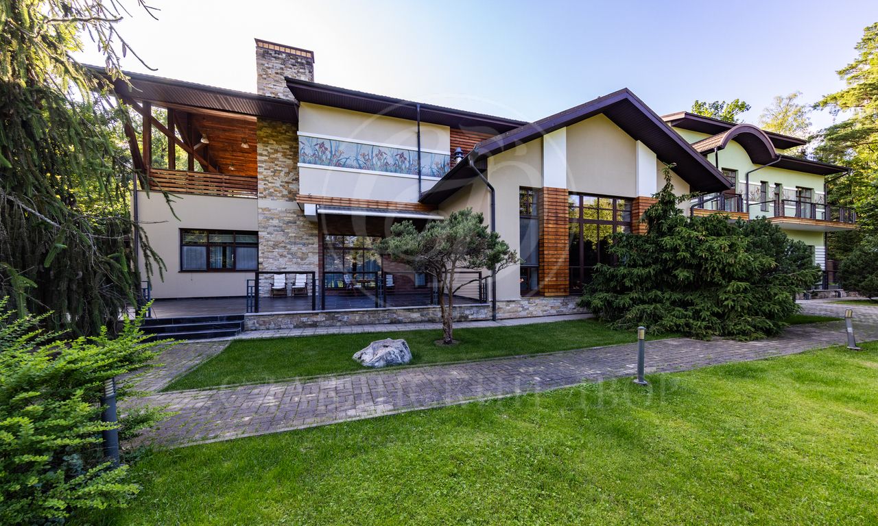 Дом расположен на живописном лесном участке площадью 60 соток с аллеей у парадного входа. Благодаря продуманному ландшафтному дизайну и хвойному массиву по периметру участка здесь царит редкое ощущение покоя. Фасад выполнен в выразительном сочетании фактур и материалов. Архитектура привлекает внимание сложной геометрией и нестандартными объемами.
