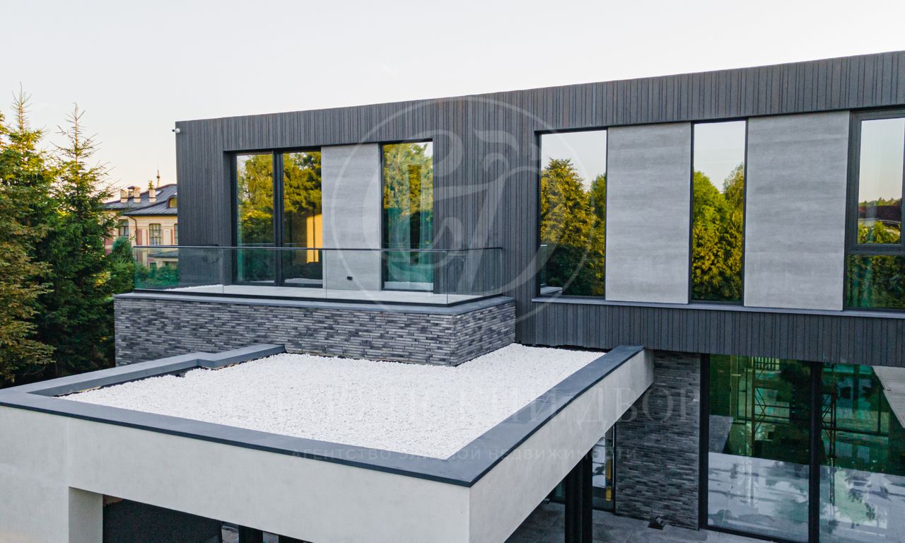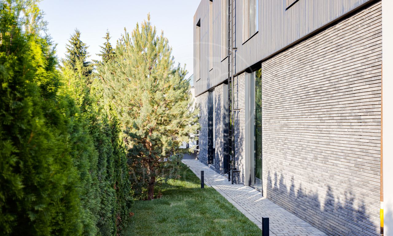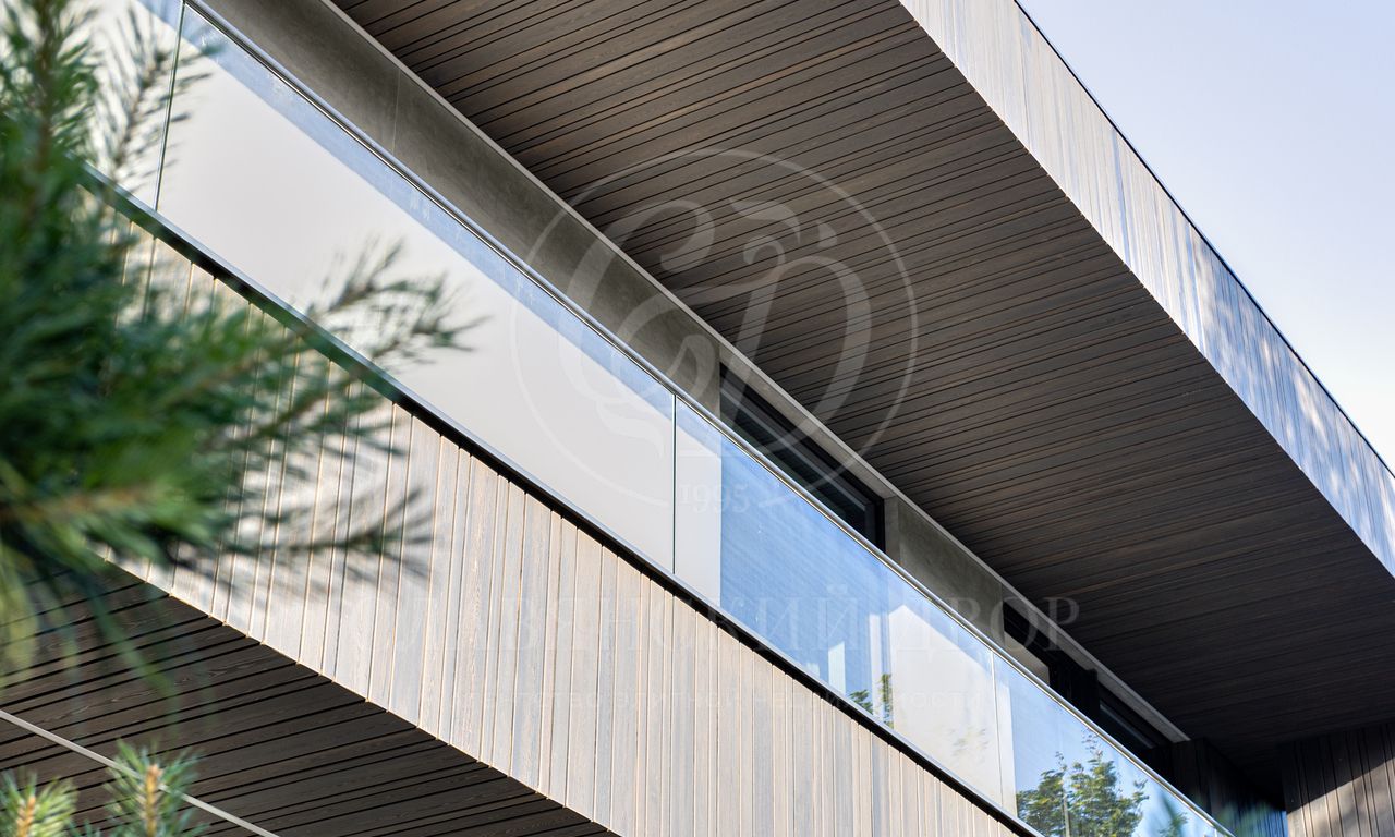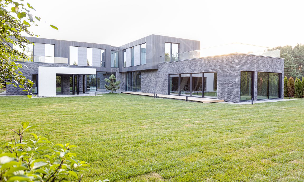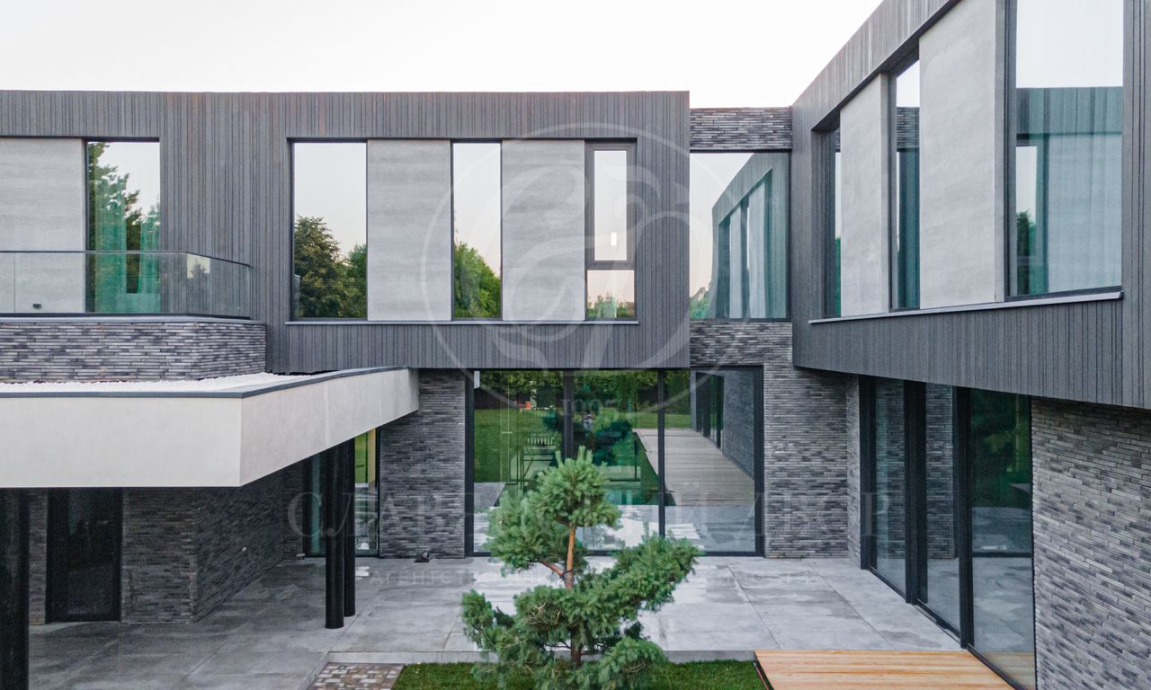 Планировочное решение дома имеет четкое функциональное зонирование. Внутреннее пространство разделено на приватную, общественную, СПА зону и блок персонала. В отделке фасадов применена крупноформатная керамика LAMINAM контрастных цветов и разноширокий термированный планкен.