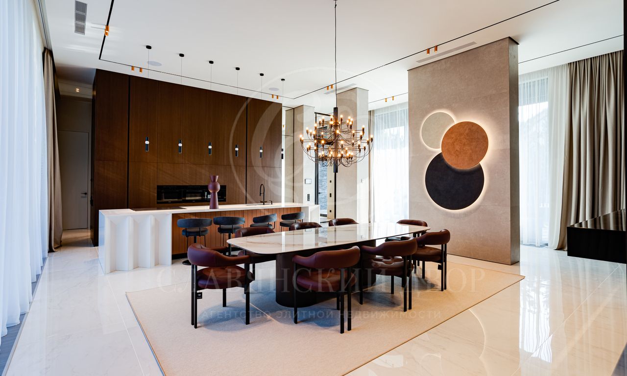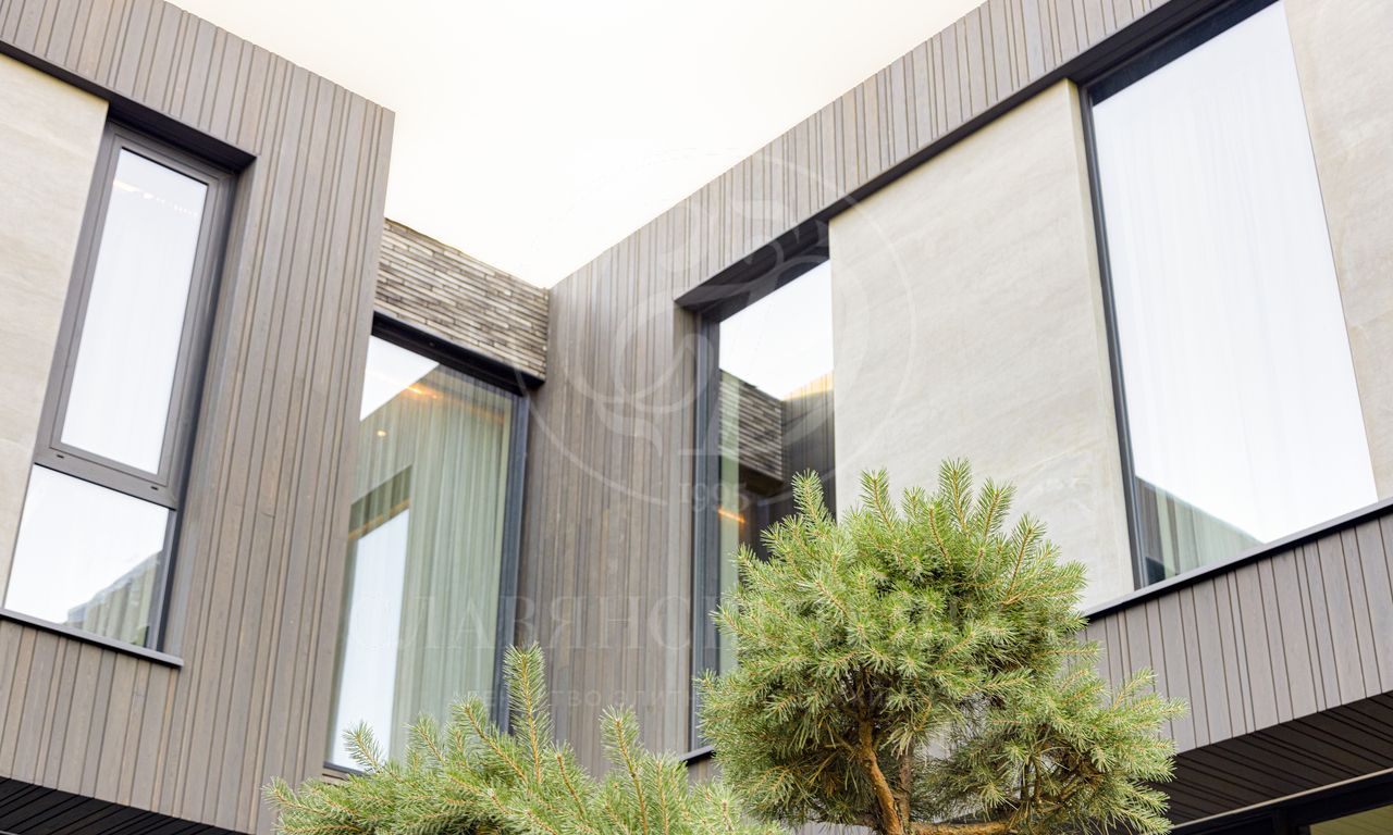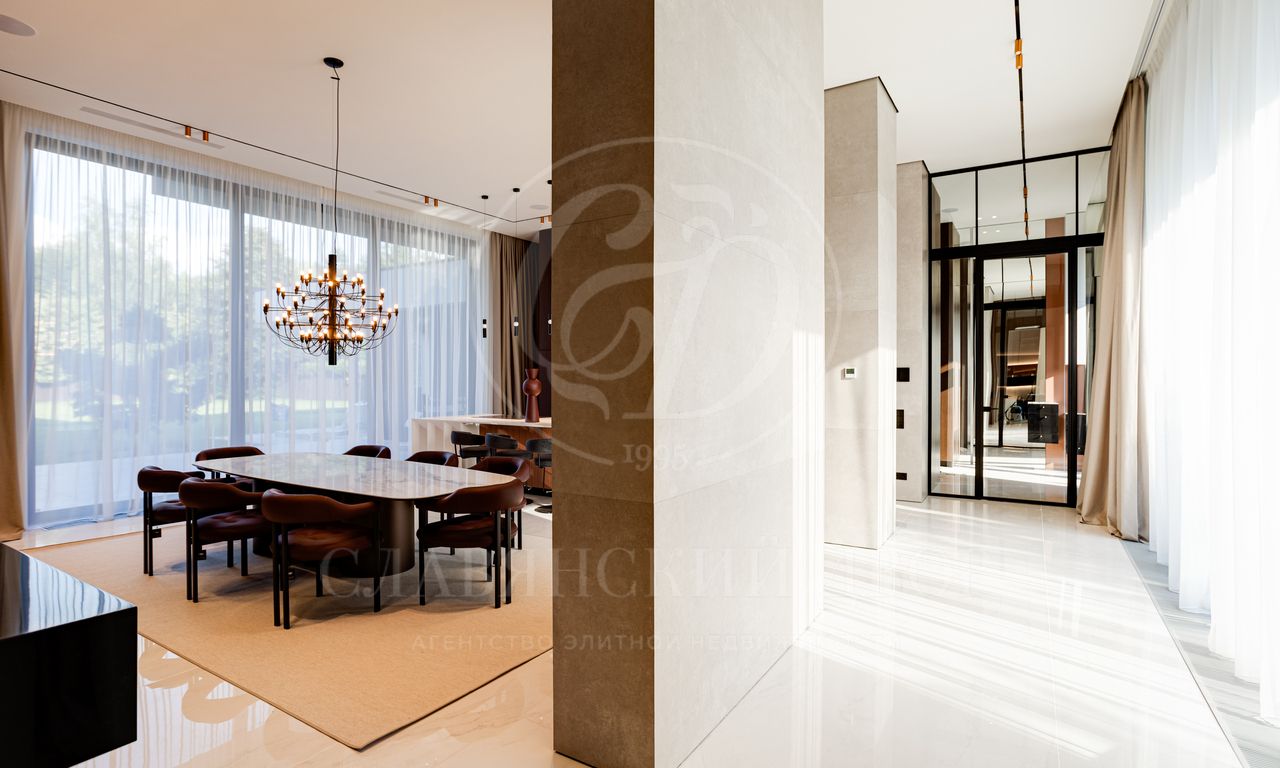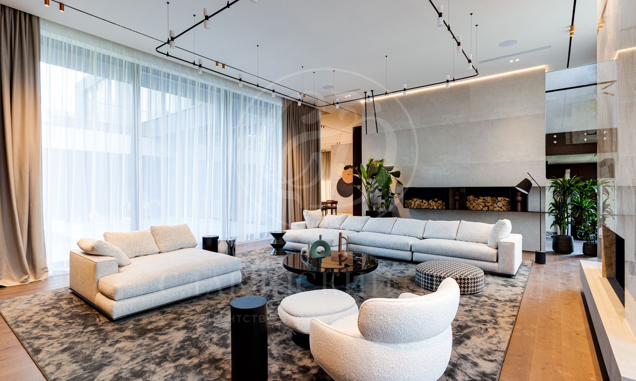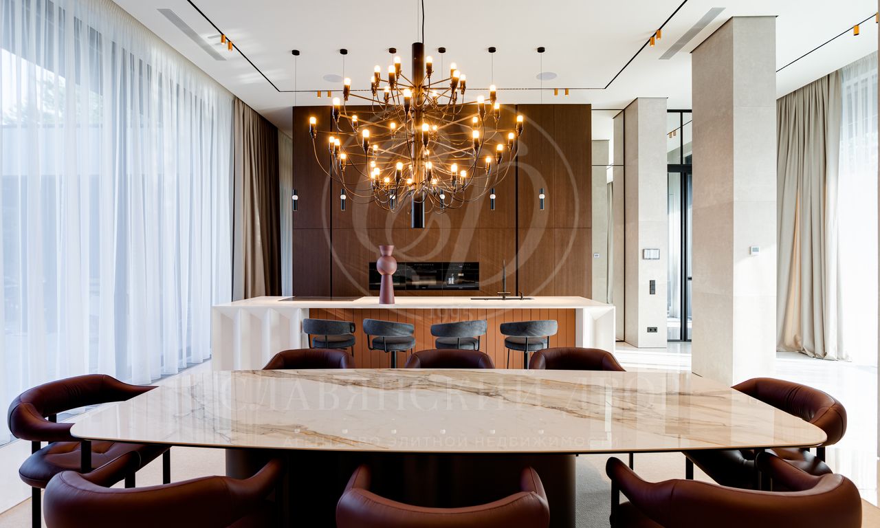 Большие площади остекления визуально связывают внутреннее пространство дома с улицей. Во внутренней отделке дома применяются качественные отделочные материалы — инженерная доска FINEX, керамика LAMINAM, натуральный камень, столярные изделия и панели, двери UNION. Дом оборудован приточно-вытяжной системой с канальным кондиционированием воздуха. В котельной установлены котлы Viessman. Мебель — MINOTTI, POLIFORM, MERIDIANI, Cattelan Italia. Освещение — CENTRSVET, Flos, Vibia. Сантехника — HANSGROHE, Villeroy&Boch, Salini. Бытовая техника — Miele, ASKO.