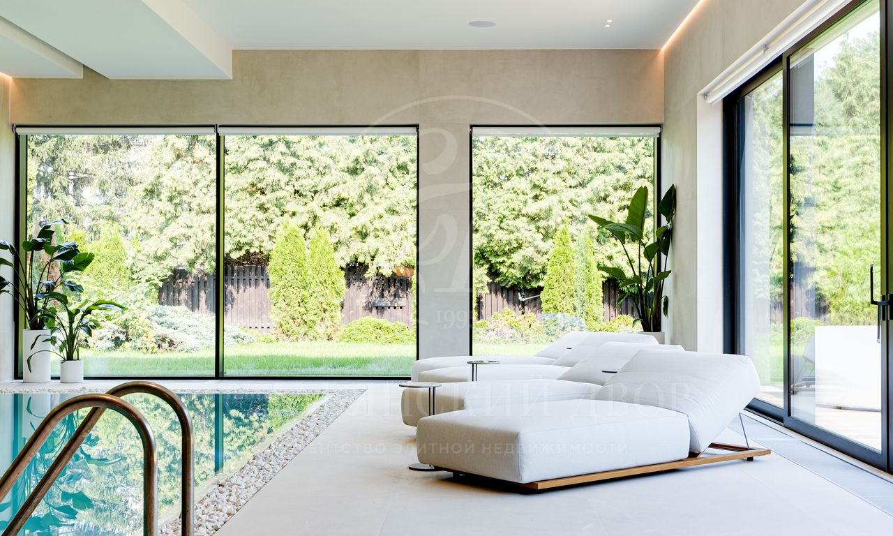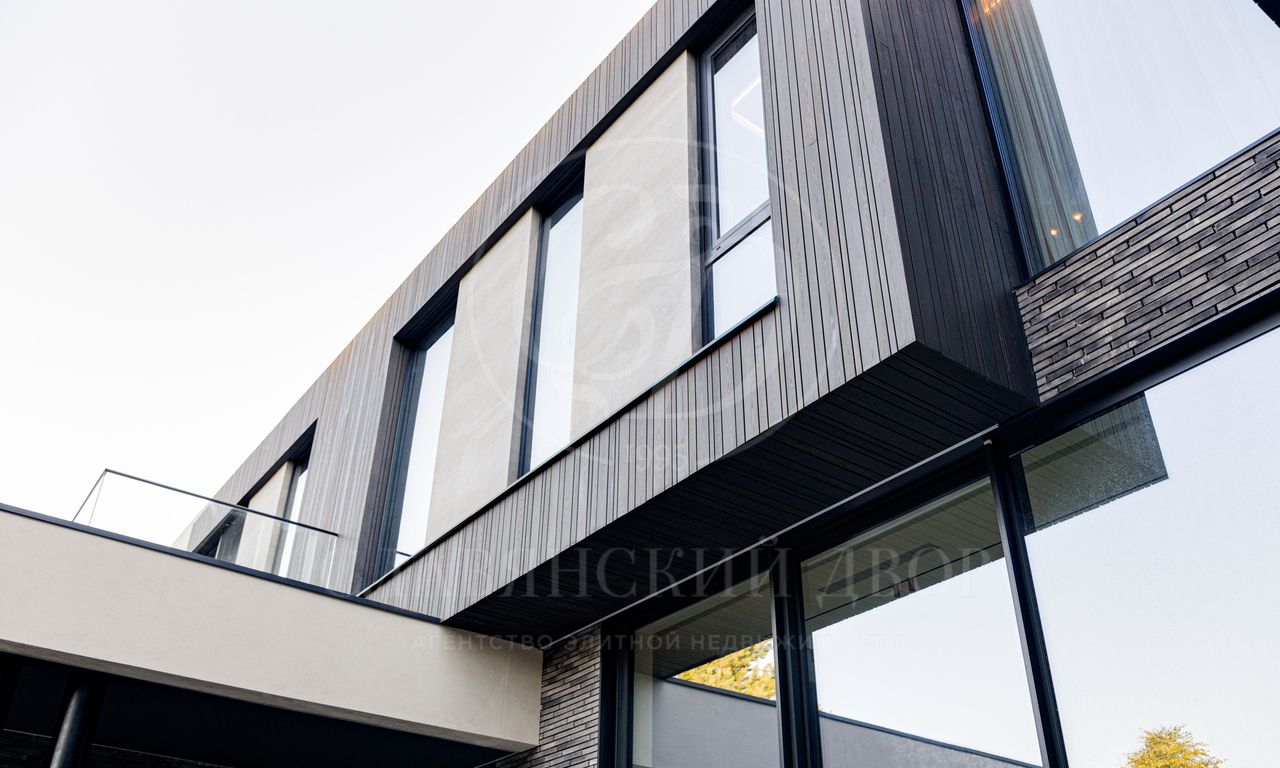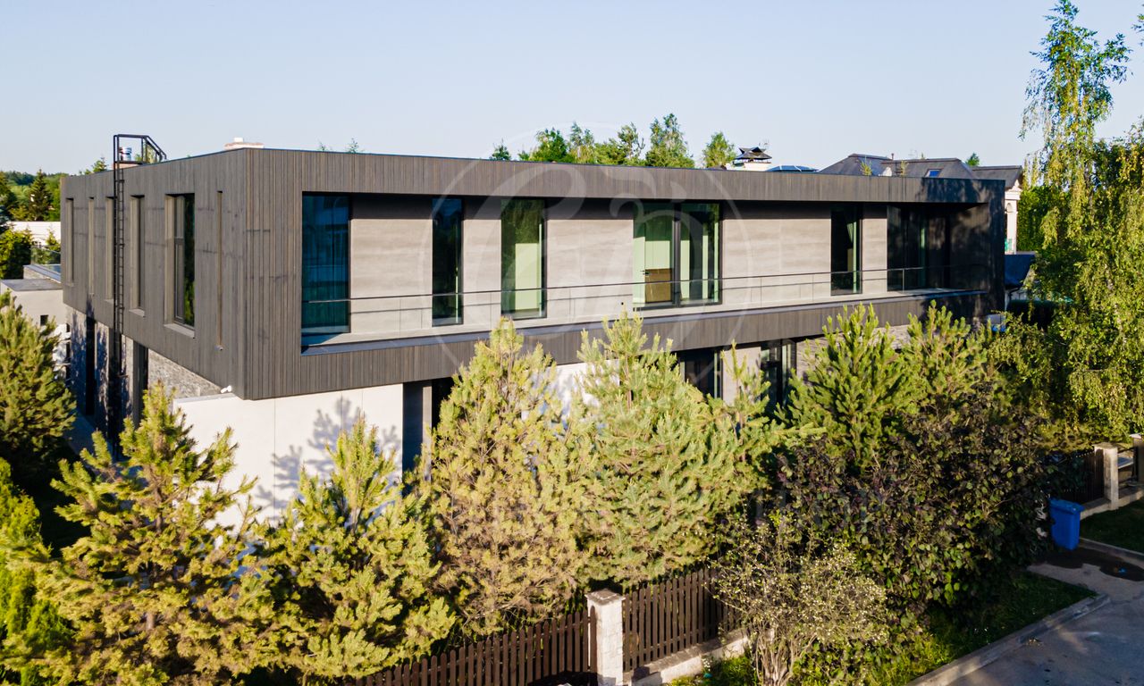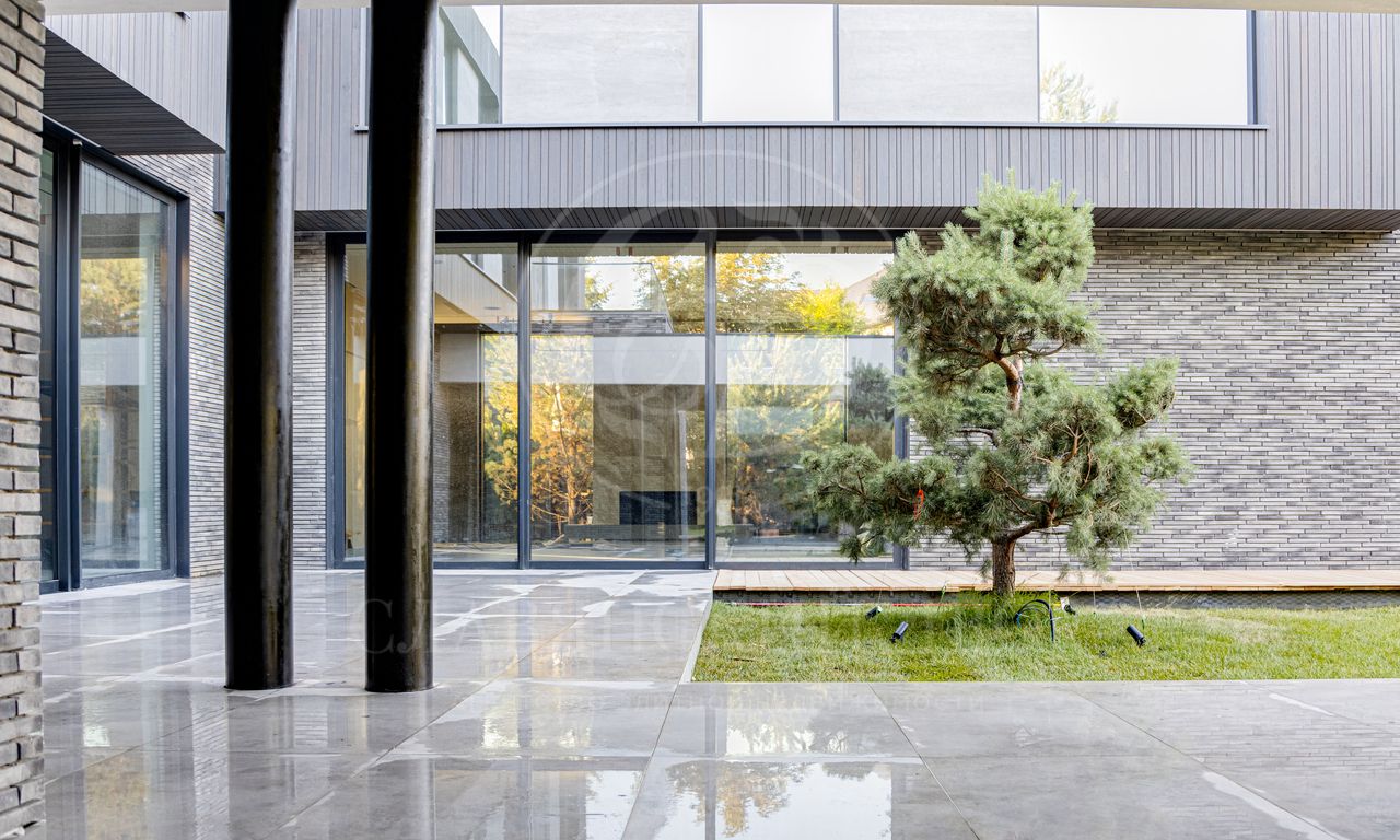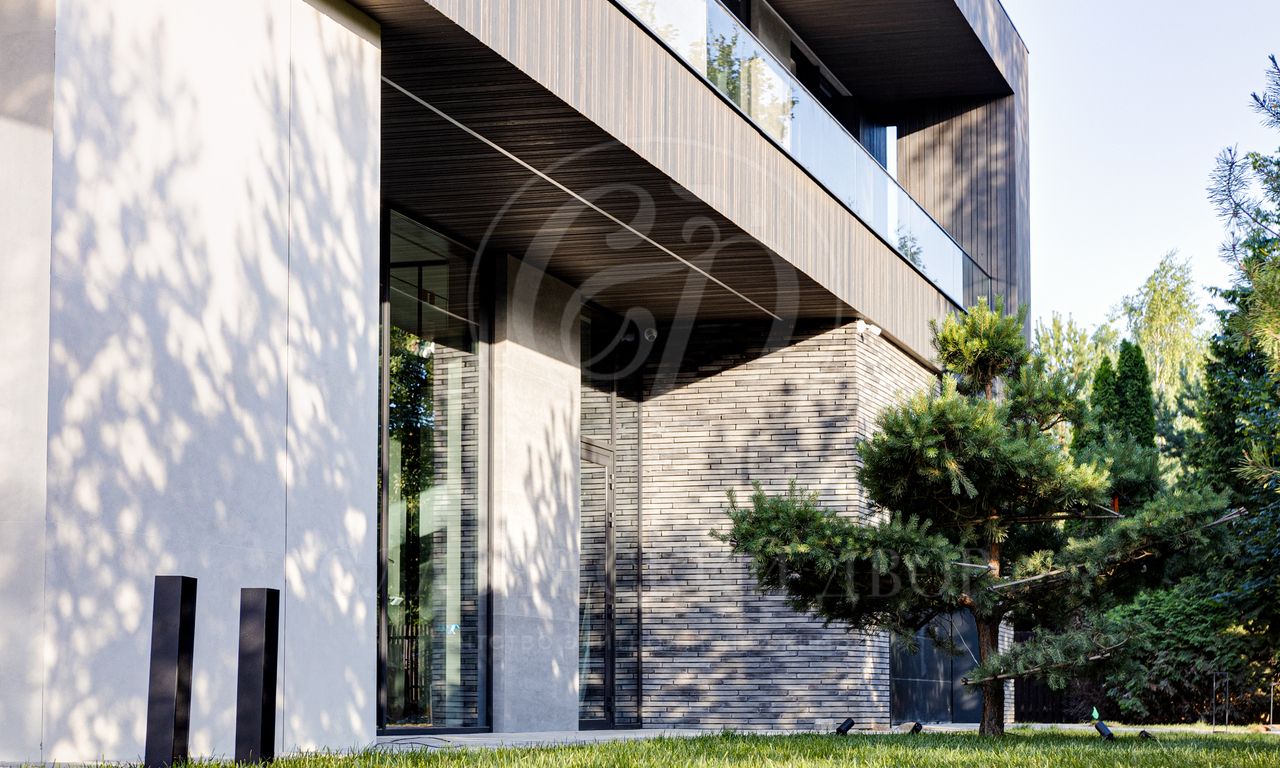 Большие площади остекления визуально связывают внутреннее пространство дома с улицей. Во внутренней отделке дома применяются качественные отделочные материалы — инженерная доска FINEX, керамика LAMINAM, натуральный камень, столярные изделия и панели, двери UNION. Дом оборудован приточно-вытяжной системой с канальным кондиционированием воздуха. В котельной установлены котлы Viessman. Мебель — MINOTTI, POLIFORM, MERIDIANI, Cattelan Italia. Освещение — CENTRSVET, Flos, Vibia. Сантехника — HANSGROHE, Villeroy&Boch, Salini. Бытовая техника — Miele, ASKO.
