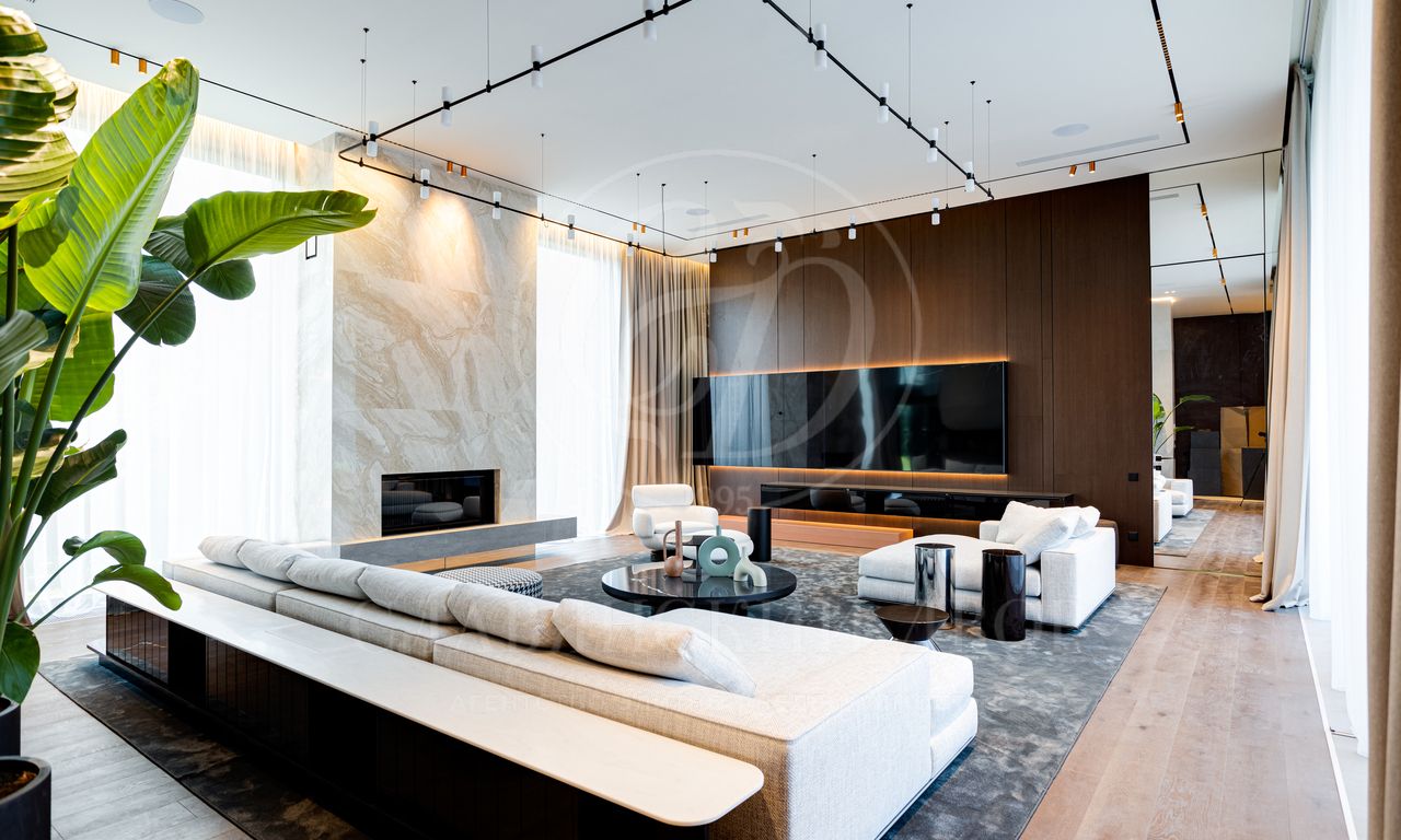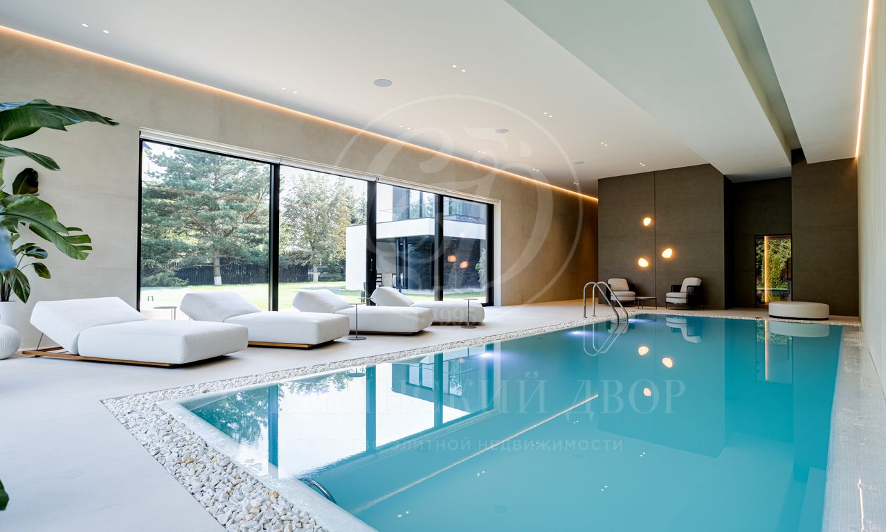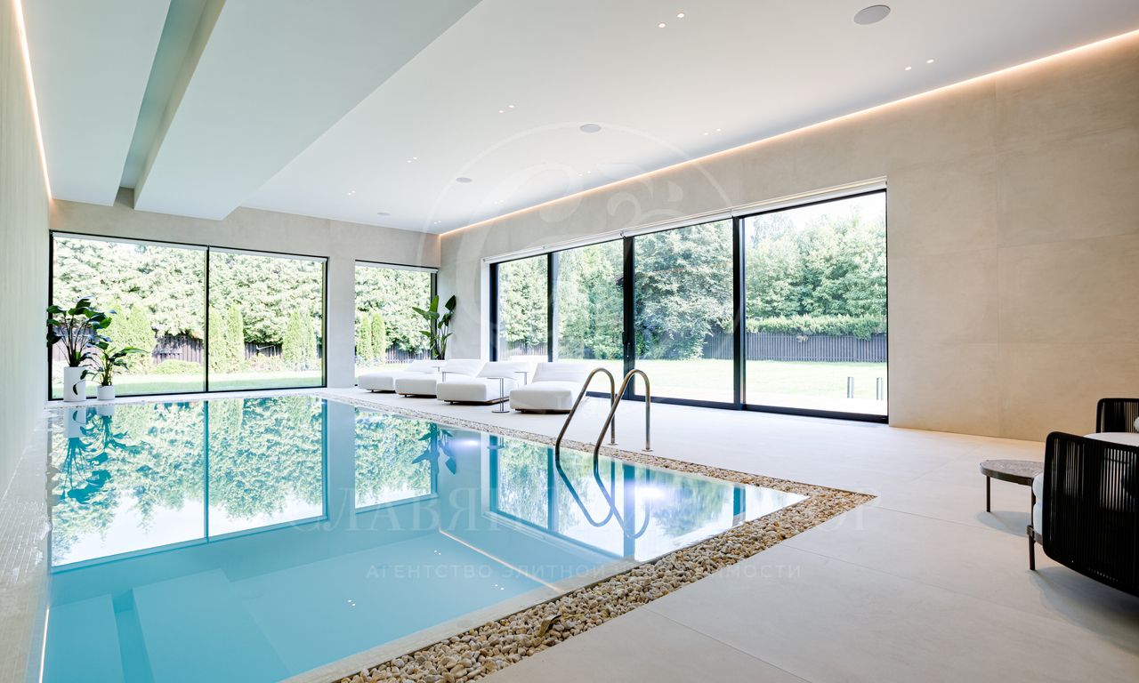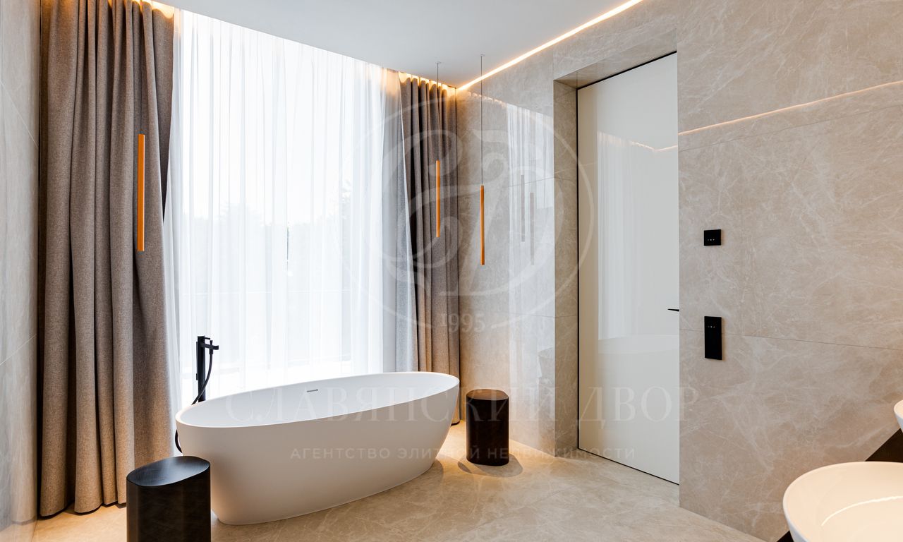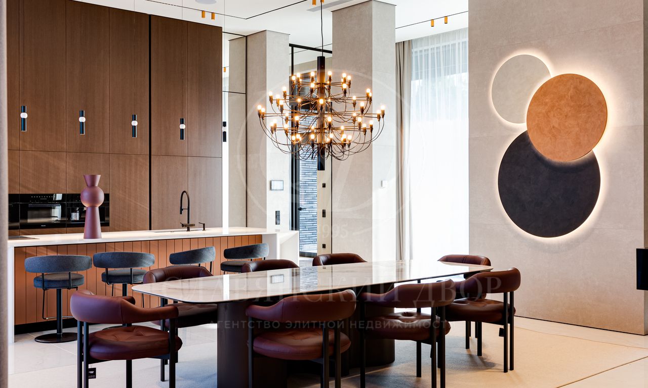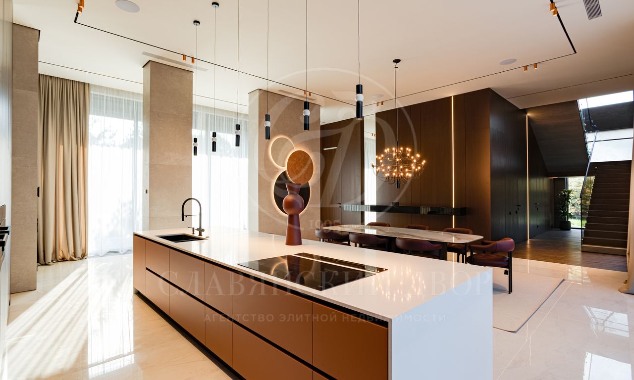 Большие площади остекления визуально связывают внутреннее пространство дома с улицей. Во внутренней отделке дома применяются качественные отделочные материалы — инженерная доска FINEX, керамика LAMINAM, натуральный камень, столярные изделия и панели, двери UNION. Дом оборудован приточно-вытяжной системой с канальным кондиционированием воздуха. В котельной установлены котлы Viessman. Мебель — MINOTTI, POLIFORM, MERIDIANI, Cattelan Italia. Освещение — CENTRSVET, Flos, Vibia. Сантехника — HANSGROHE, Villeroy&Boch, Salini. Бытовая техника — Miele, ASKO.