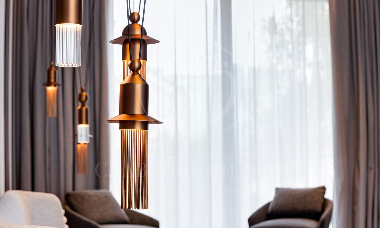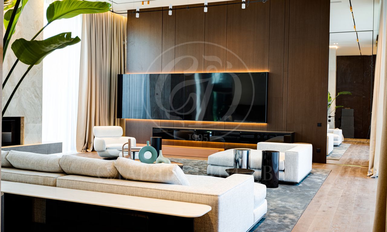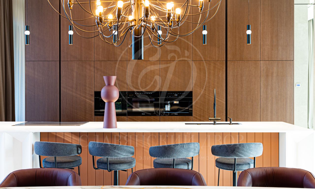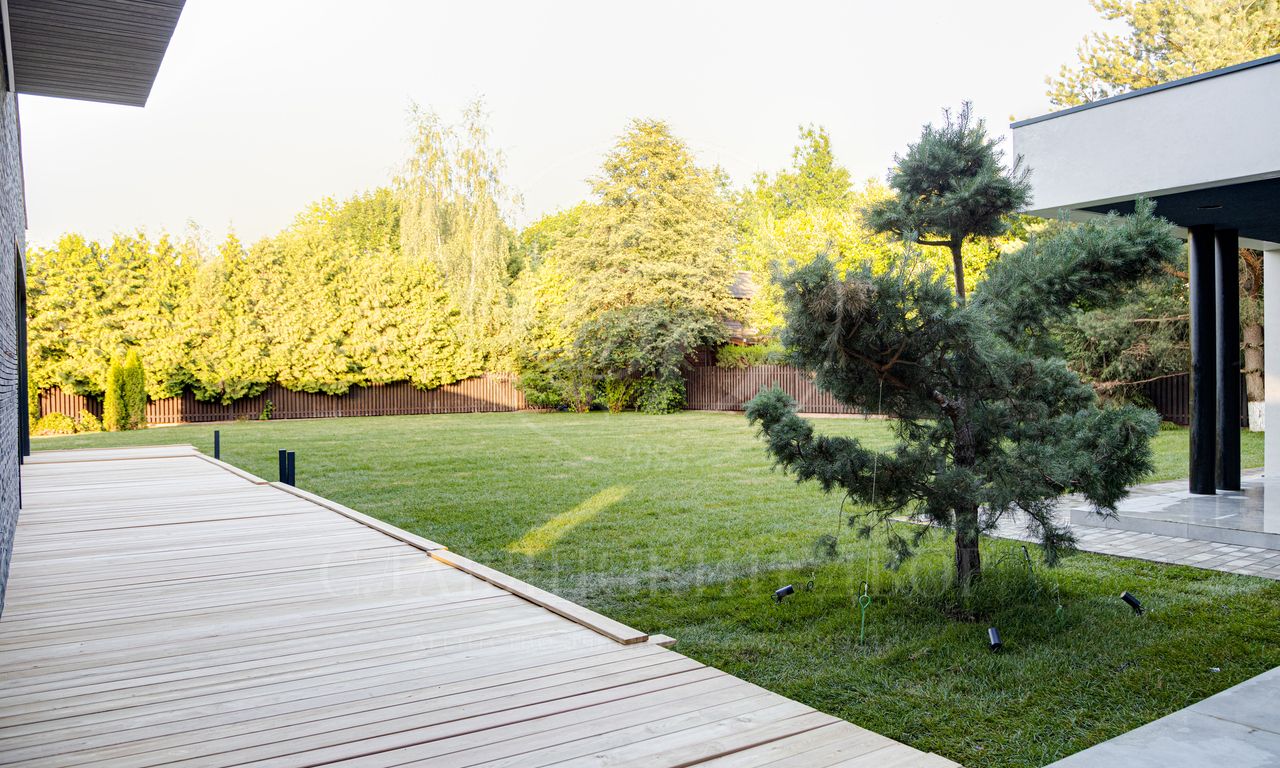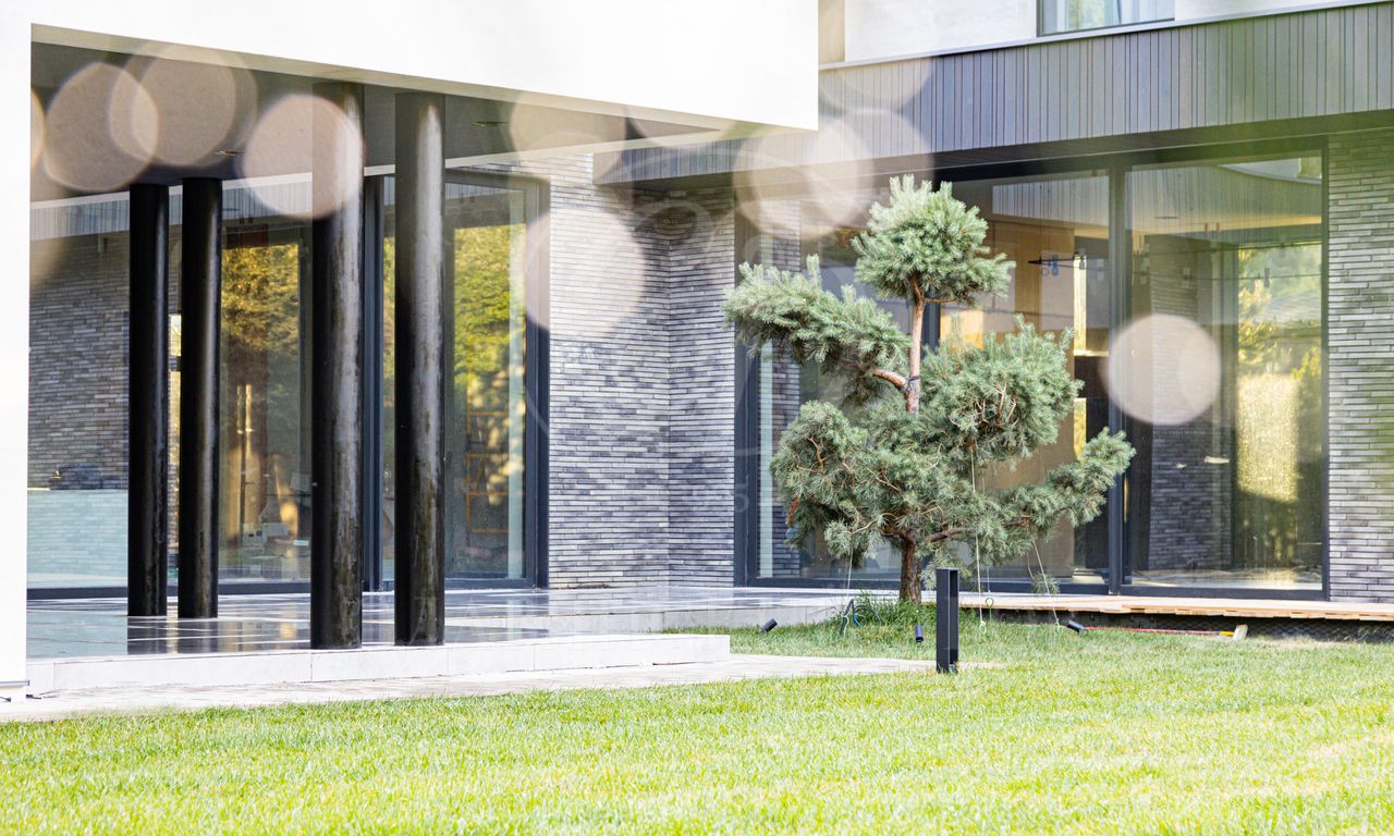 Большие площади остекления визуально связывают внутреннее пространство дома с улицей. Во внутренней отделке дома применяются качественные отделочные материалы — инженерная доска FINEX, керамика LAMINAM, натуральный камень, столярные изделия и панели, двери UNION. Дом оборудован приточно-вытяжной системой с канальным кондиционированием воздуха. В котельной установлены котлы Viessman. Мебель — MINOTTI, POLIFORM, MERIDIANI, Cattelan Italia. Освещение — CENTRSVET, Flos, Vibia. Сантехника — HANSGROHE, Villeroy&Boch, Salini. Бытовая техника — Miele, ASKO.