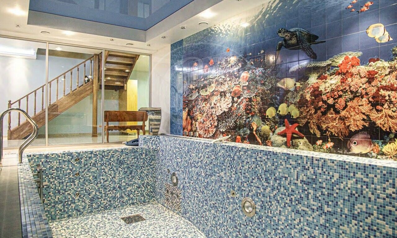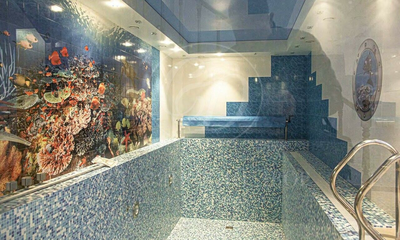 Минус первый этаж: зона SPA: бассейн с переливом 8х4м, гидромассажем и водопадом, дровяная баня, санузел.