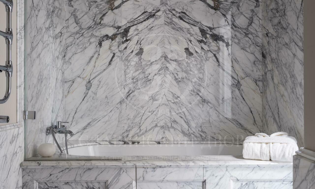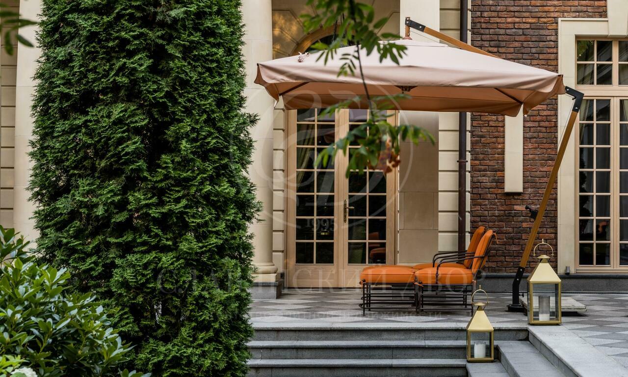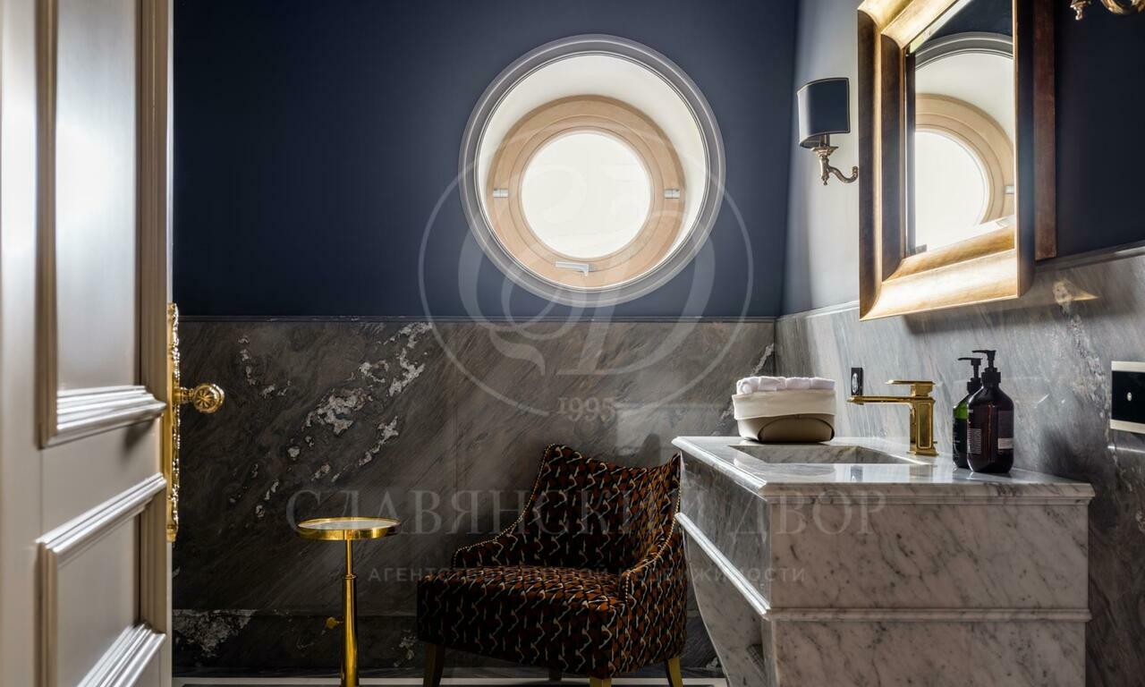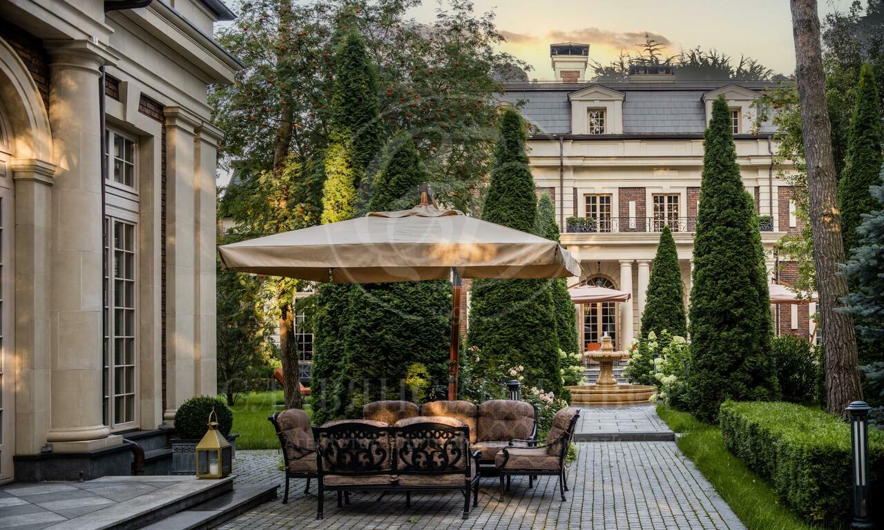 Резиденция в стиле французского шато на участке с сосновым лесом. Интерьеры выполнены под руководством Кирилла Истомина. В отделке использованы только эксклюзивные материалы: интерьерные краски Little Greene (Англия) и Argile (Франция), итальянские сорта мрамора премиум- Класса — Calacatta, Carrara, Statuario, паркет из редких пород дерева, встроенная мебель фабрики Luciano Zonta (Италия), люстры Saint-Louis (Франция) и Baccarat (Франция).