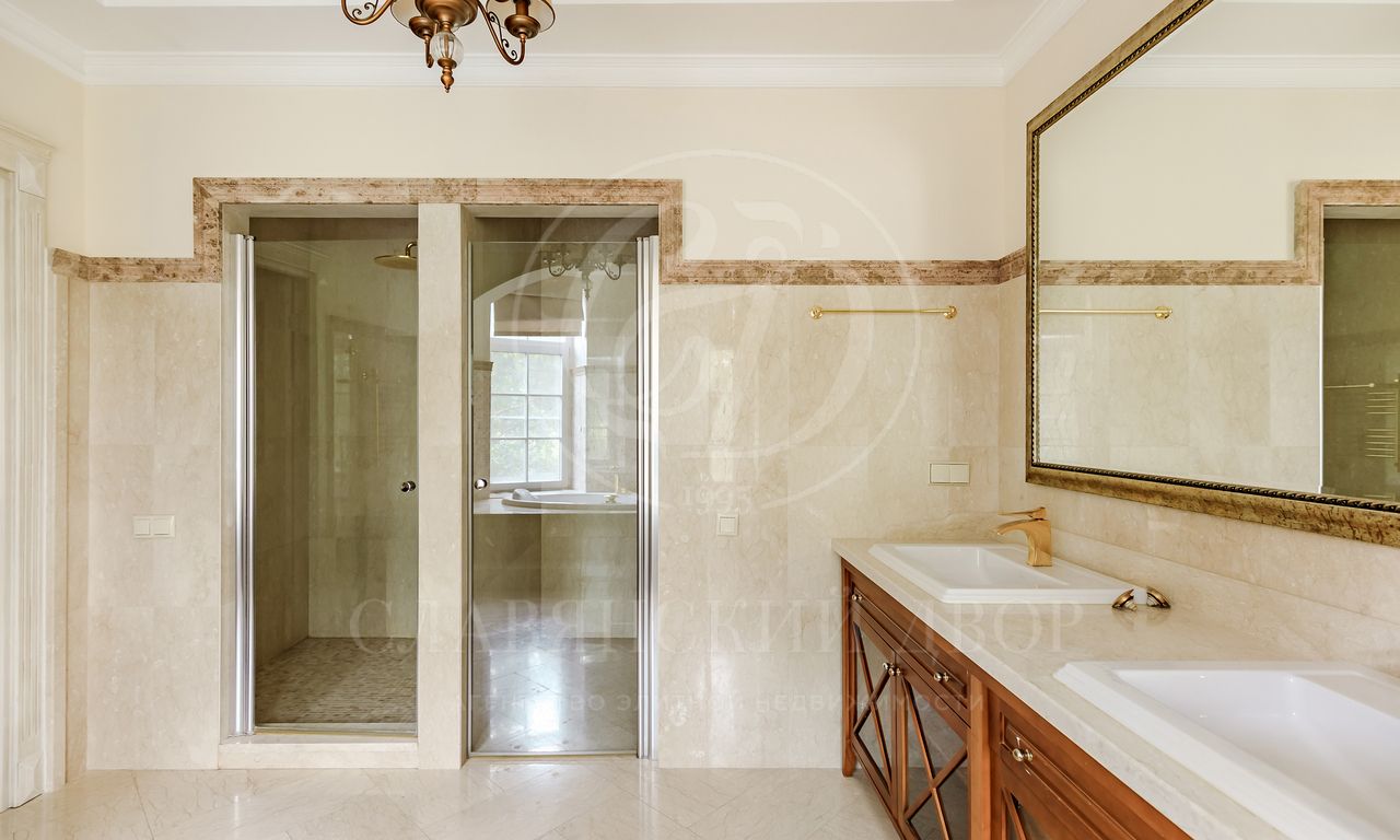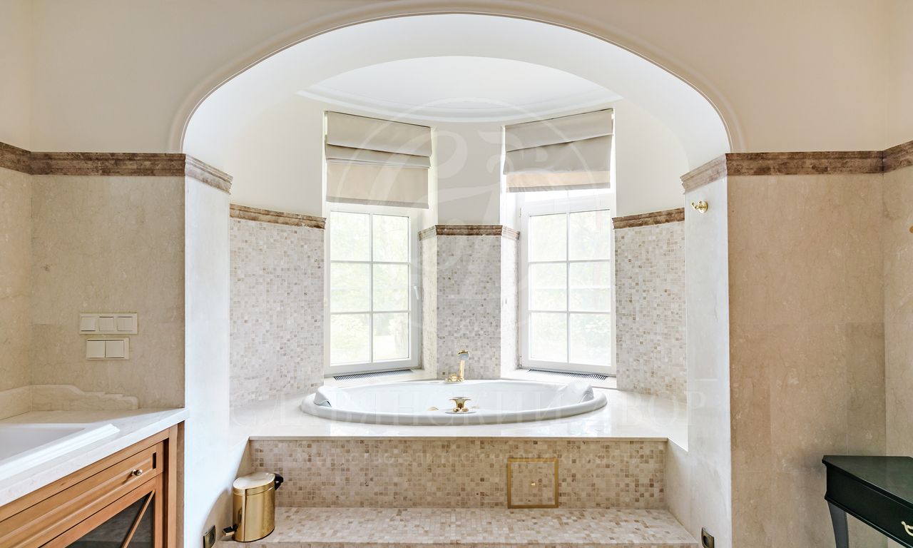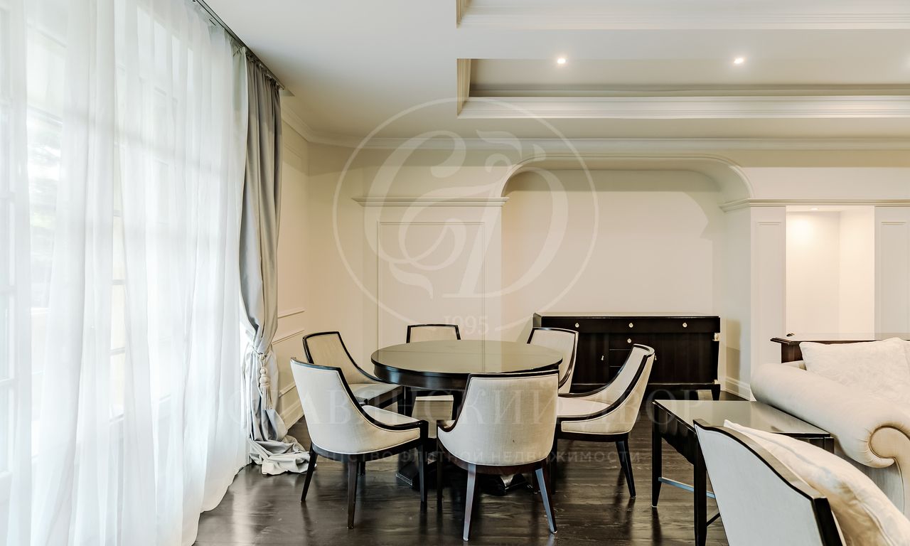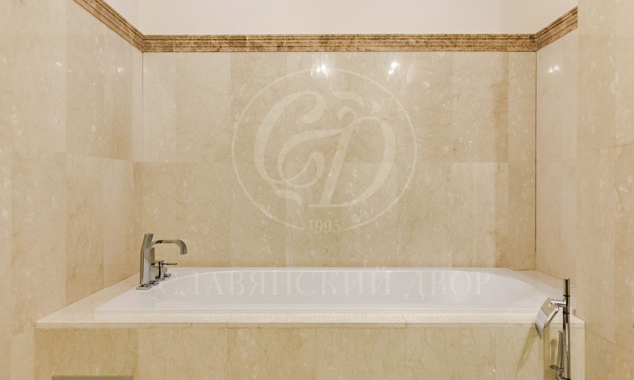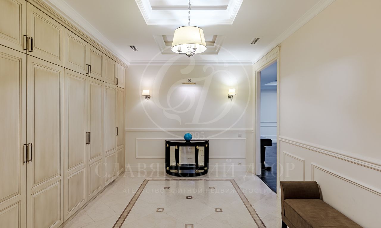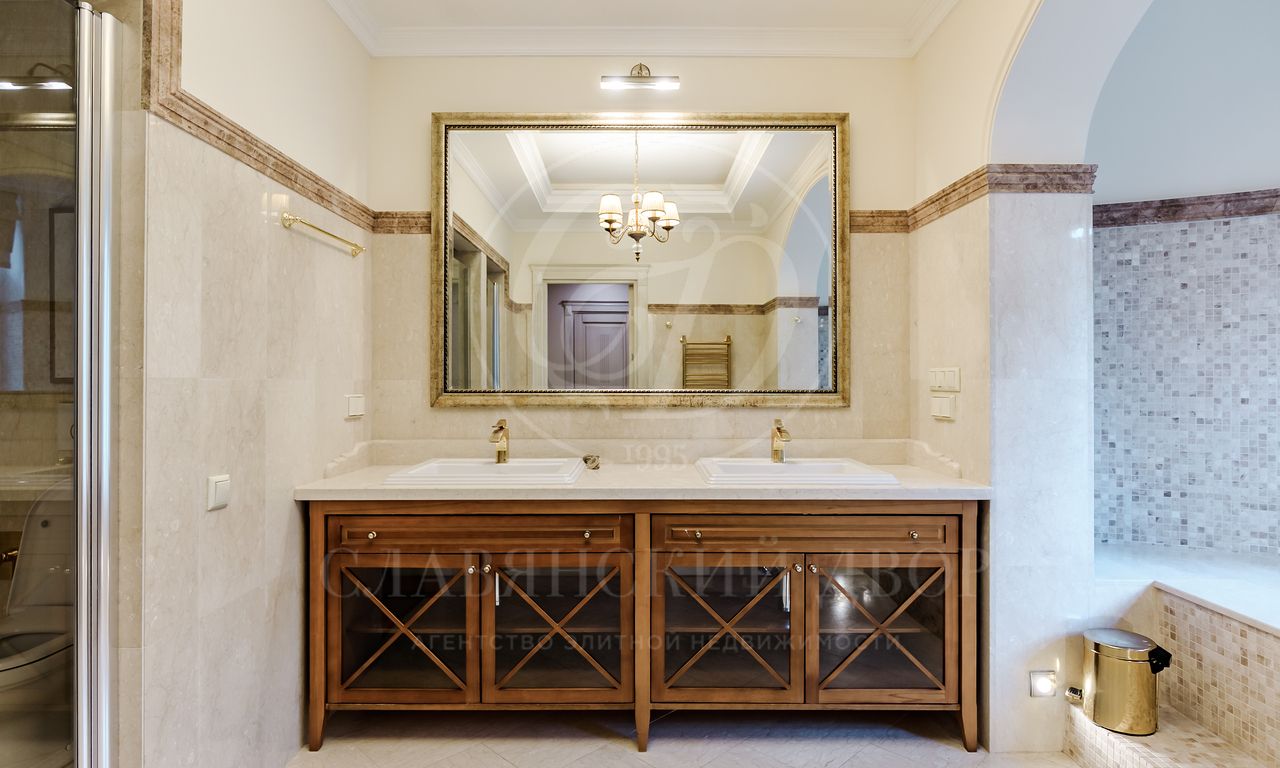 Отделка выполнена в классическом стиле с использованием качественных материалов иностранного производства. Мягкая мебель, аксессуары, светильники, кухонный гарнитур и обои привезены из Италии, Англии и США. Паркетная доска – массив ореха, полы на кухне и в прихожей – мрамор. Бытовая техника AEG (Германия); духовой шкаф, СВЧ, кофемашина, посудомоечная машина, варочная панель и винный шкаф Liebherr, холодильник фирмы Side-by-Side (США). Ванные комнаты отделаны мраморной плиткой с лазерной гравировкой, установлена сантехника Villeroy&Boch, испанские смесители, аксессуары — Devon&Devon.