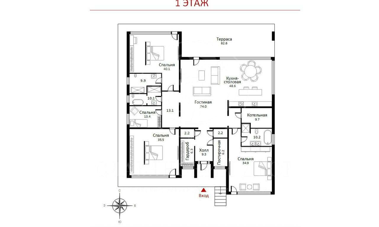 1 этаж: входная зона с холлом; просторная гостиная с камином, современная кухня-столовая, комфортабельная спальная зона, состоящая из трех основных спален и гостевой комнаты; три санузла для удобства всех жильцов, уютная терраса для отдыха на свежем воздухе, постирочная, вместительная гардеробная, котельная, подсобное помещение.